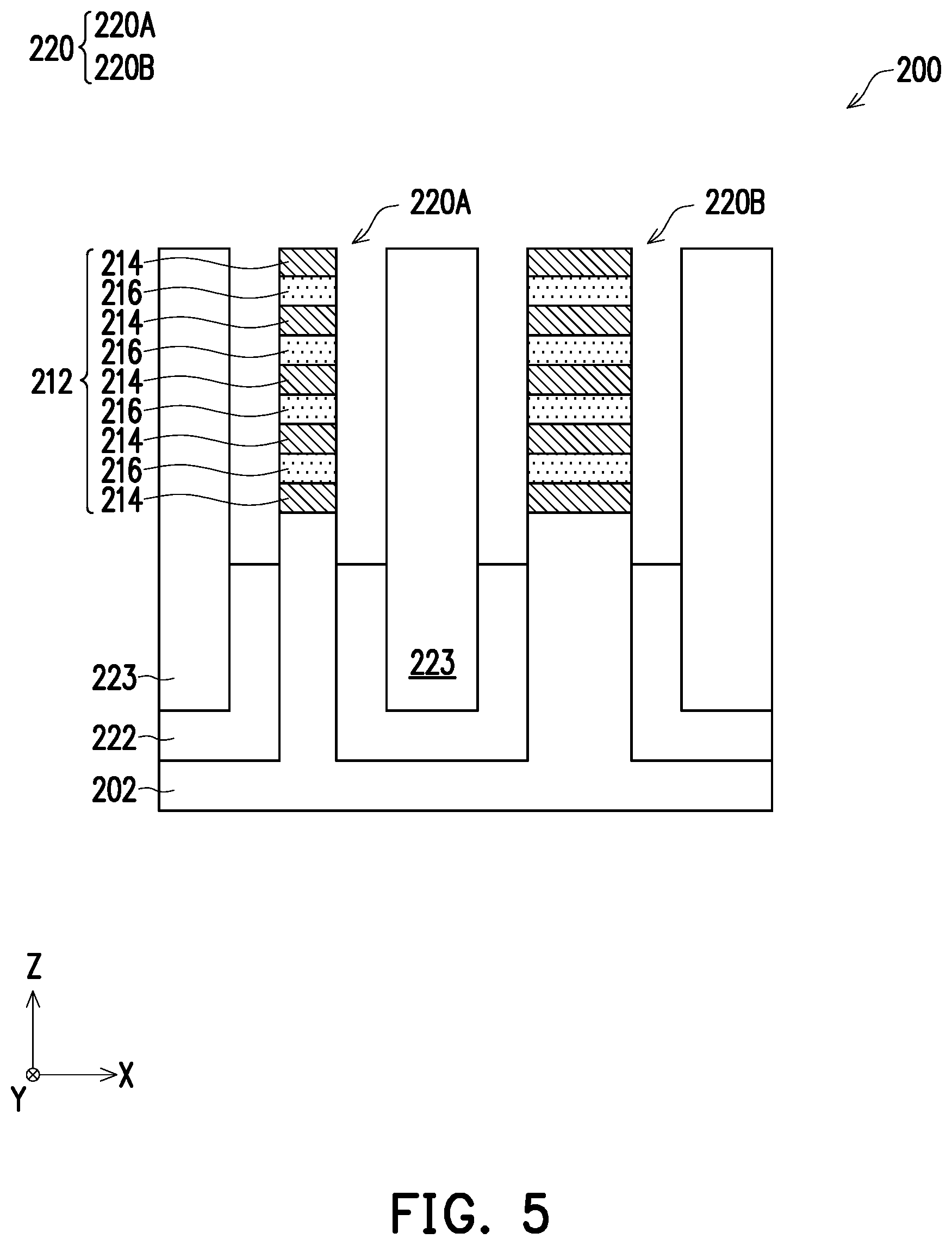 [0023]Operation 106 subsequently patterns the epitaxial stack 212 in an etching process, such as a dry etch (e.g., reactive ion etching), a wet etch, and/or other suitable process, through openings defined in the patterned mask layer 218. The stacked epitaxial layers 214 and 216 are thereby patterned into the fins 220 with trenches between adjacent fins 220. The fins 220 may include a fin 220A and a fin 220B having different widths. In some embodiments, the top width W1 of the fin 220A is in a range from about 6 nm to about 10 nm, while the top width W2 of the fin 220B is in a range from about 16 nm to about 20 nm. Each of the fin 220A and the fin 220B protrudes upwardly in the z-direction from the substrate 202 and extends lengthwise in the y-direction. Sidewalls of the fins 220A and 220B may be straight or inclined (not shown). In FIG. 3, two fins 220 (including one fin 220A and one fin 220B) are spaced apart along the x-direction. But the number of the fins is not limited to two, and may be as small as one or more than two.