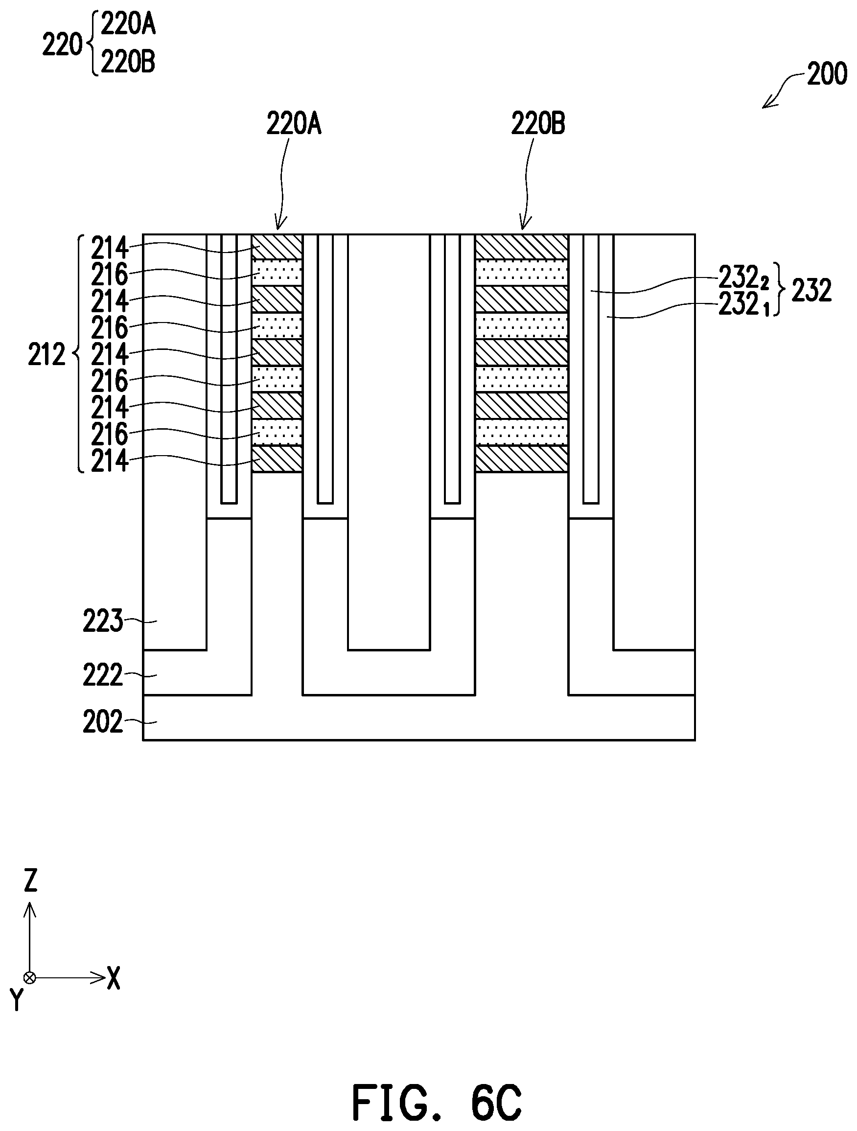 [0027]At operation 114, the method 100 (FIG. 1A) forms spacers 232 on sidewalls of the sacrificial gate structure 224 and sidewalls of the fin 220A and the fin 220B, as shown in FIGS. 6A, 6B and 6C. The spacers 232 may include a dielectric material such as silicon oxide, silicon nitride, silicon carbide, silicon oxynitride, SiCN films, silicon oxycarbide, SiOCN films, and/or combinations thereof. In some embodiments, the spacers 232 include multiple layers, such as liner layers 2321and main spacer walls 2322. By way of example, the gate sidewall spacers 232 may be formed by depositing a liner material layer and a dielectric material layer over the sacrificial gate structure 224 using processes such as, a subatmospheric CVD (SACVD) process, a flowable CVD process, an ALD process, a PVD process, or other suitable process respectively, as shown in FIG. 6A. In some embodiments, the deposition of the liner material layer and the dielectric material layer are followed by an etching-back (e.g., anisotropically) process to expose portions of the fin 220A and the fin 220B adjacent to and not covered by the sacrificial gate structure 224 (e.g., S/D regions). The liner material layer and the dielectric material layer may remain on the sidewalls of the sacrificial gate structure 224 as gate sidewall spacers, and on the sidewalls of the fin 220A and the fin 220B as fin sidewall spacers. In some embodiments, the etching-back process may include a wet etch process, a dry etch process, a multiple-step etch process, and/or a combination thereof. The spacers 232 may have a thickness ranging from about 5 nm to about 20 nm, and the liner layers 2321and the main spacer walls 2322may have a thickness ranging, for example, from about 2.5 nm to about 10 nm, respectively.