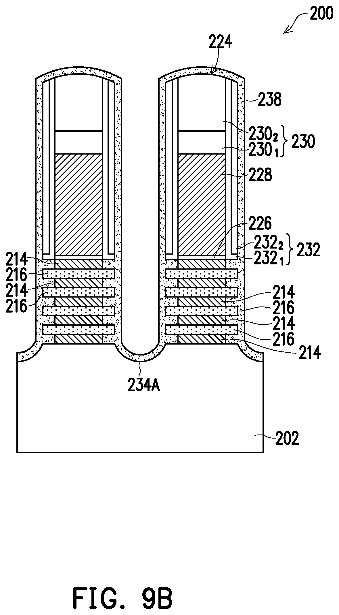 [0031]After the inner spacer material layer 238 is formed, an etching process is performed to partially remove the inner spacer material layer 238, as shown in FIGS. 10A, 10B and 10C, where FIG. 10B is a cross-sectional view along I-I′ line of the device 200 in FIG. 10A, and FIG. 10C is a cross-sectional view along II-II′ line of the device 200 in FIG. 10A. By this etching, the inner spacer material layer 238 remains substantially within the cavity 236, because of a small volume of the cavity. Similarly, the inner spacer material layer 238 remains substantially within the recess 234A, because of a small volume of the recess 234A. Generally, plasma dray etching etches a layer in wide and flat areas faster than a layer in concave (e.g., holes, grooves, recesses and/or slits) portions. Thus, the inner spacer material layer 238 may remain inside the cavities 236 and also remain in the recesses 234A, while the inner spacer material layer 238 may be removed from the recesses 234B. The remained portions of the inner spacer material layer 238 in the cavities 236 are denoted as the inner spacers 238. The remained portions of the inner spacer material layer 238 in the recess 234A are denoted as residues 238R (or referred to as inner spacer residues).