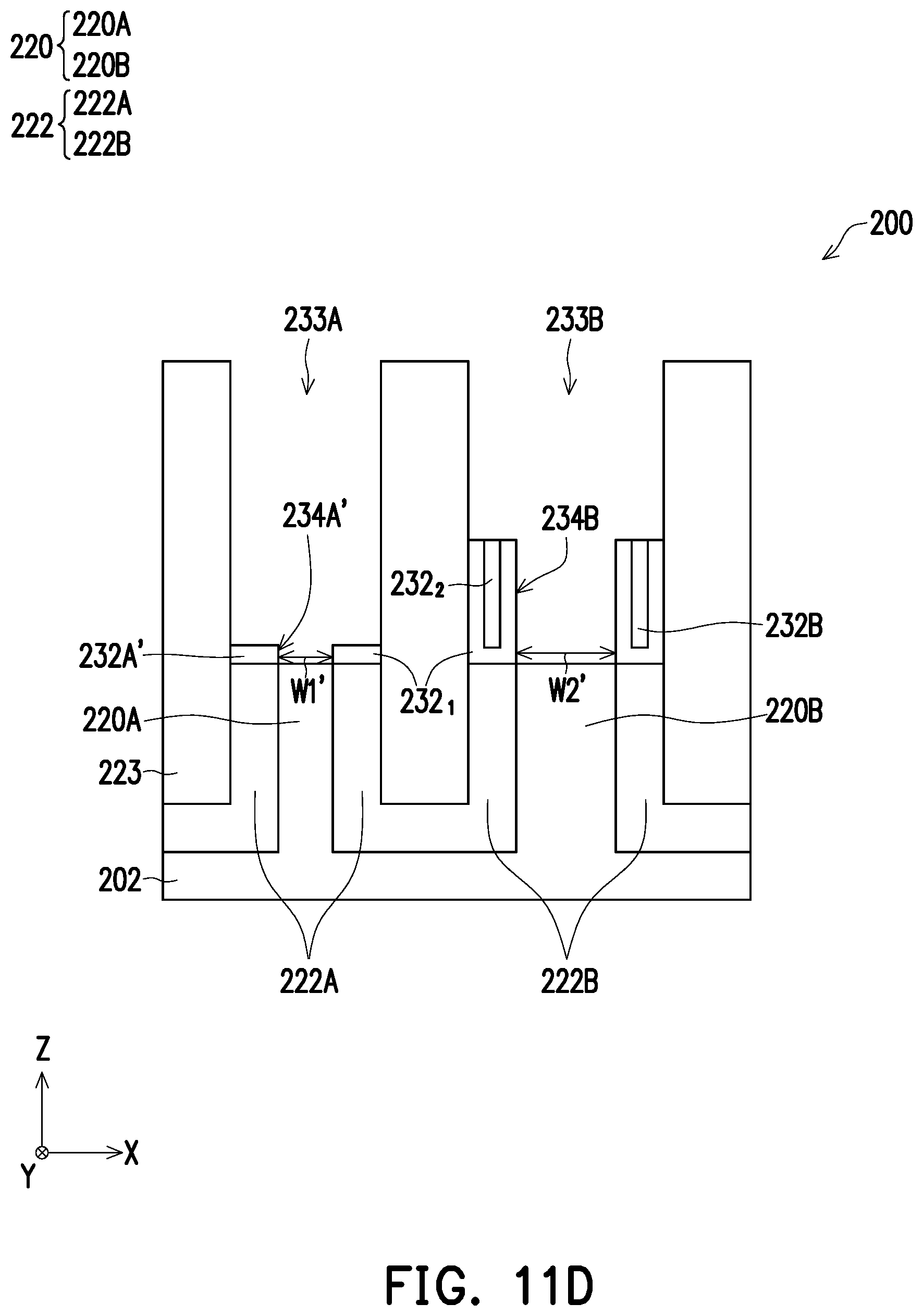 [0034]In alternative embodiments, the height of the spacers 232A is reduced so that some spacers 232A′ may remain on the STI features 222A, while the entire residues 238R are removed to expose the fin 220A during the electively etching process at the operation 120, as shown in FIG. 11D. Sidewalls of the spacers 232A′ and the surface of the fin 220A form a recess 234A′. The spacers 232A′ and the spacers 232B have different shapes and layers. In some embodiments, the spacer 232A′ includes the liner material layers 2321, while the spacer 232B includes the liner material layer 2321the dielectric material layer 2322embedded in the liner material layer 2321. The cross-sectional shape of the liner material layers 2321of the spacer 232A′ has an “-” shape, for example, while the cross-sectional shape of the liner material layer 2321of the spacer 232 has an “U” shape, and the cross-sectional shape of the dielectric material layer 2322of the spacer 232 has an “I” shape. The height of the spacers 232A′ is less than a height of the spacers 232B. In some embodiments, the spacer 232A′ has the height in a range from about 5 nm to about 10 nm, and the spacer 232B has the height in a range from about 10 nm to about 30 nm. The width W1′ of the recess 234A′ may be less than the width W2′ of the recess 234B. In some embodiments, the width W1′ is in a range from about 6 nm to about 10 nm, while the width W2′ is in a range from about 16 nm to about 20 nm. The aspect ratio of the recess 234A′ may be less than 1.7. In some embodiments, the aspect ratio of the recess 234A′ is in a range from 0 to 1.7.