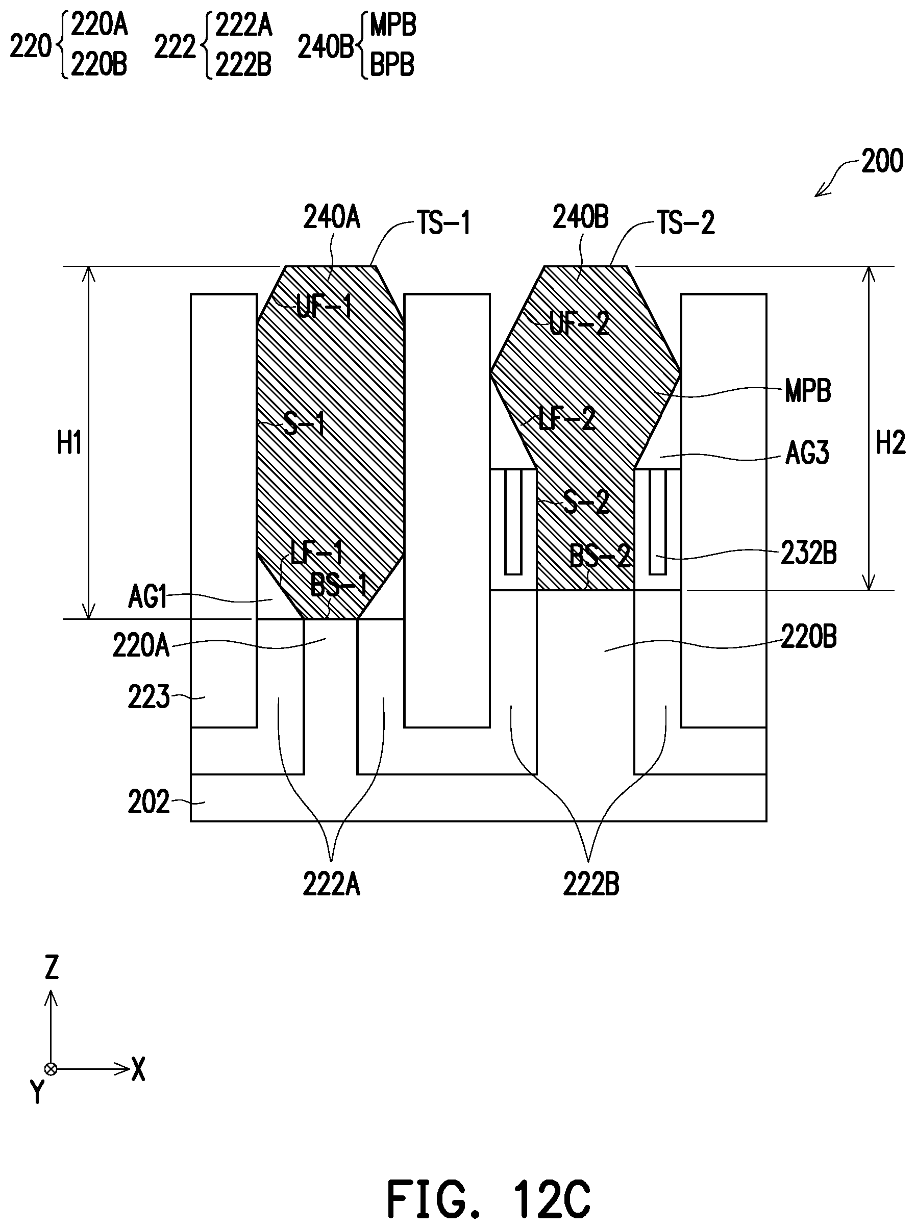 [0041]The bottom surface BS-1 of the epitaxial S/D feature 240A may be equal to or lower than the bottom surface BS-2 of the epitaxial S/D feature 240B, as shown in FIGS. 12C to 12E. The height H1 of the epitaxial S/D feature 240A may be equal to or greater than the height H2 of the epitaxial S/D feature 240B, as shown in FIGS. 12C to 12E. The contact areas of the epitaxial S/D feature 240A and the dielectric fins 223 may be greater than the contact areas of the epitaxial S/D feature 240B and the spacers 232B, as shown in FIG. 12C. The contact areas of the epitaxial S/D feature 240A and the spacers 232A′ are less than contact areas of the epitaxial S/D feature 240B and the spacers 232B, as shown in FIG. 12D or 12E. The contact areas of the epitaxial S/D feature 240A and the dielectric fins 223 is greater than the contact areas of the epitaxial S/D feature 240B and the dielectric fins 223, as shown in FIGS. 12C and 12D.