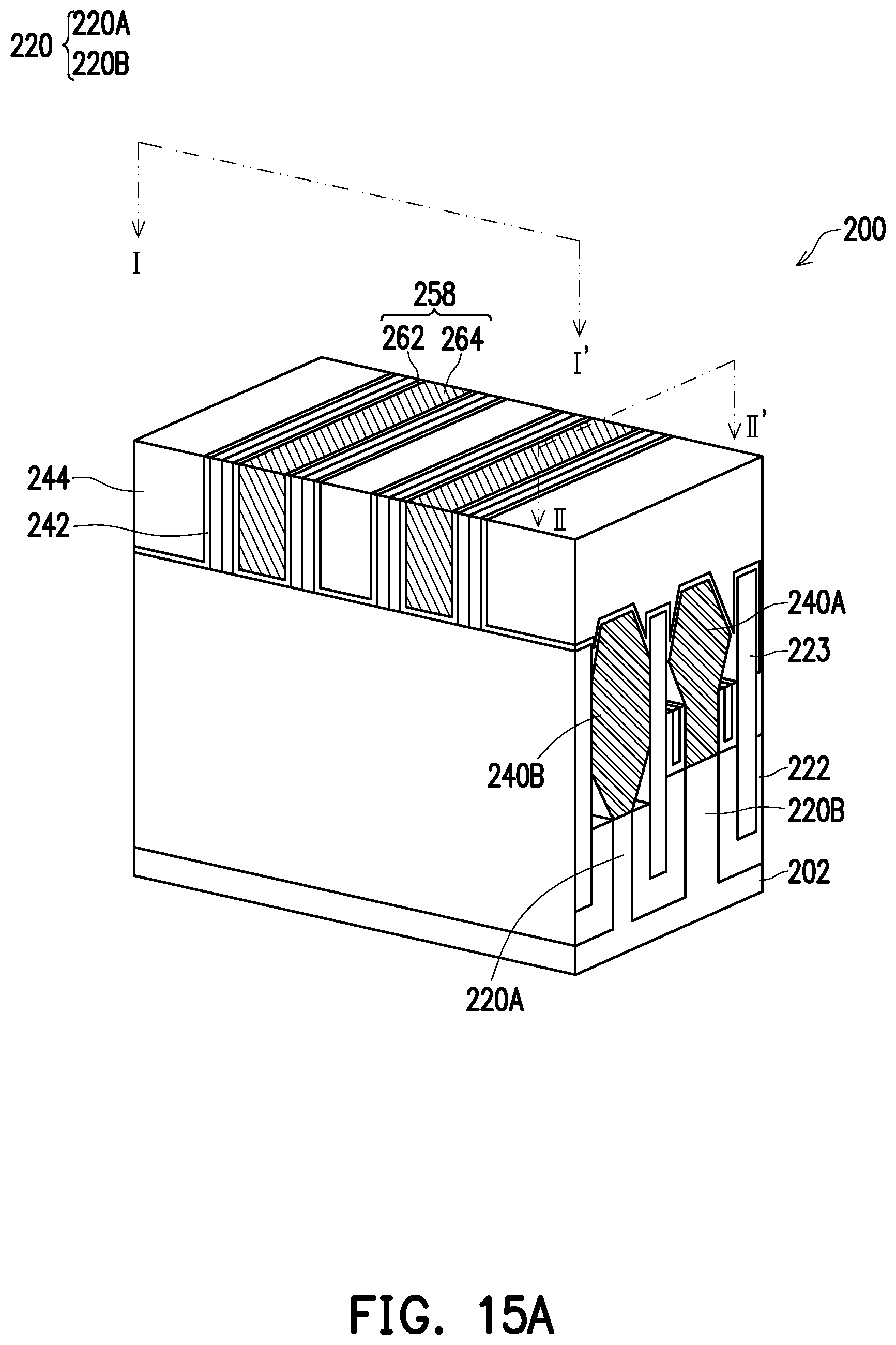 [0016]FIGS. 1A and 1B will be described below in conjunction with FIGS. 2 to 15C. FIGS. 2 to 5 are fragmentary cross-sectional views of a semiconductor device 200 at various stages of fabrication according to some embodiments of method 100. FIGS. 6A to 15A are diagrammatic perspective views of a semiconductor device 200 at other various stages of fabrication according to some embodiments of the method 100. FIGS. 6B to 15B are fragmentary cross-sectional views along the I-I′ line of the semiconductor devices 200 in FIGS. 6A to 15A at other various stages of fabrication according to some embodiments of the method 100. FIGS. 6C to 15C are fragmentary cross-sectional views along the II-II′ line of the semiconductor devices 200 in FIGS. 6A to 15A at other various stages of fabrication according to some embodiments of the method 100. FIGS. 11D and 12D/12E are fragmentary cross-sectional views along the II-II′ line of the semiconductor devices 200 in FIGS. 11A and 12A at other various stages of fabrication according to alternative embodiments of the method 100. The method 100 is merely an example, and is not intended to limit the present disclosure beyond what is explicitly recited in the claims. Additional steps may be provided before, during, and after method 100, and some of the steps described can be moved, replaced, or eliminated for additional embodiments of method 100. Additional features may be added in the semiconductor device depicted in FIGS. 2 to 15C and some of the features described below can be replaced, modified, or eliminated in other embodiments of the semiconductor device.