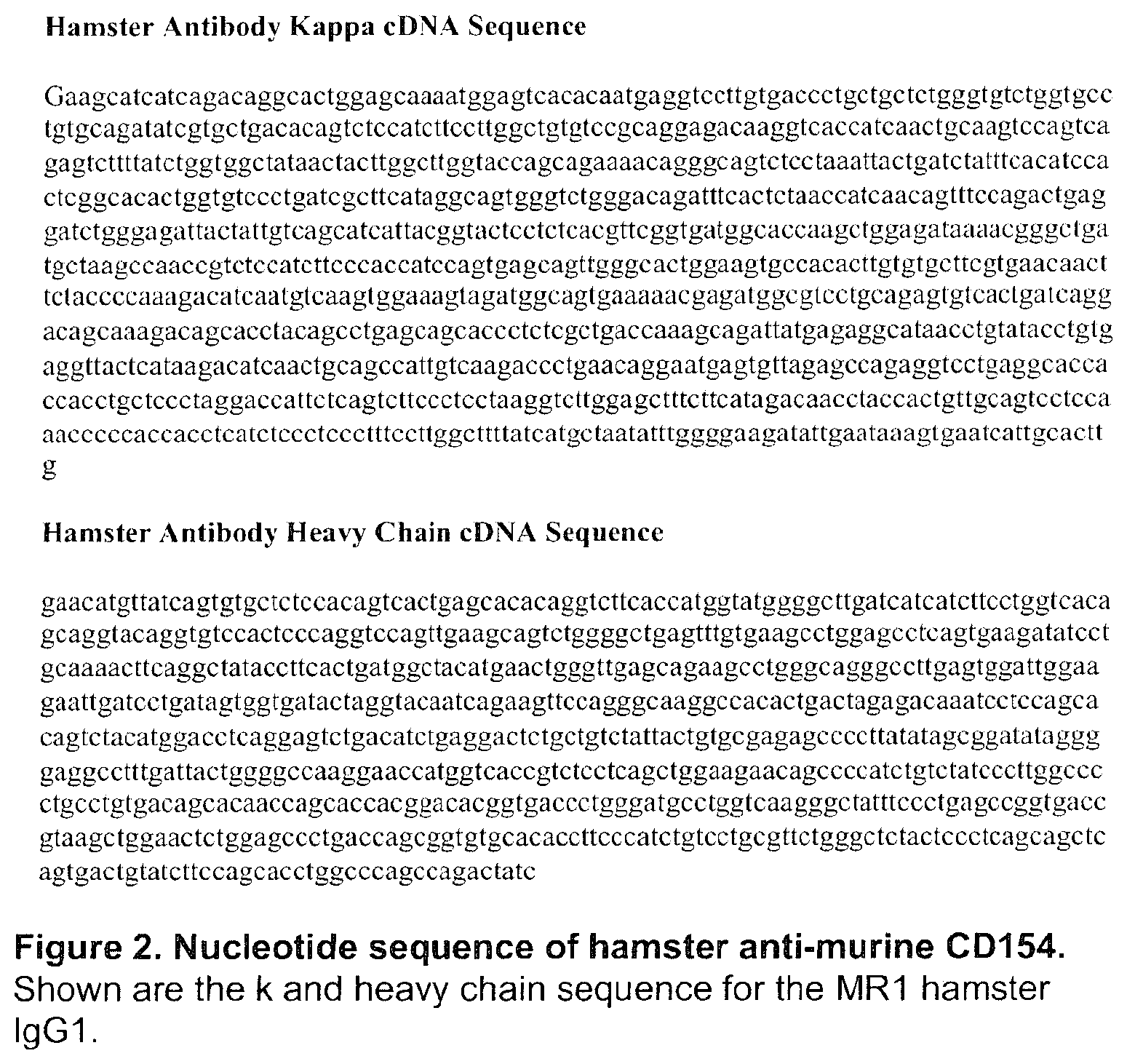 FIG. 2 shows the nucleotide sequence of a hamster anti-murine CD154. Shown are the k and heavy chain sequence for the MR1 anti-human CD40L (CD154) hamster IgG1.