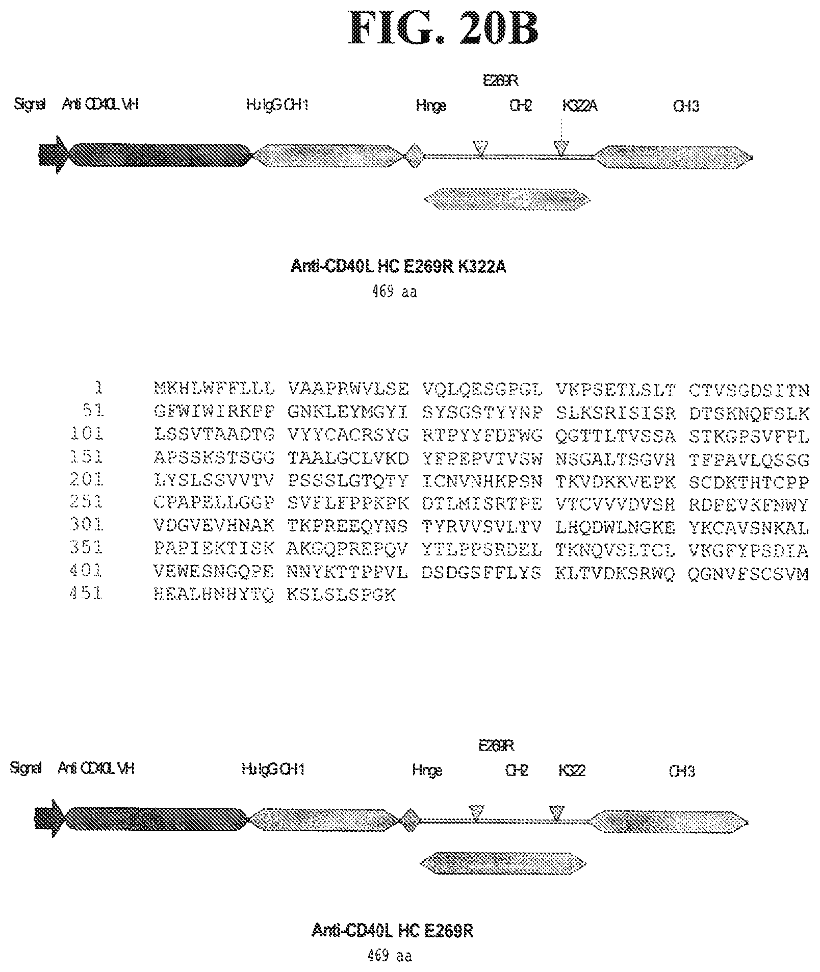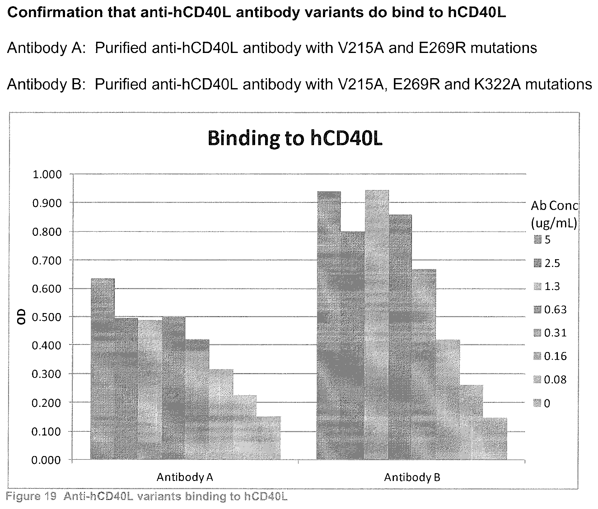 FIG. 19 contains ELISA hCD40L binding data for two anti-human CD40L IgG1 antibodies according to the invention, Antibody A and antibody B which were expressed in HEK-293 Freestyle cells, wherein each antibody comprises the variable heavy and light sequences in FIG. 20 and modifications in the human IgG1 constant region. Antibody A contains V215A and E269R mutations in the constant region. Antibody B contains 3 mutations in the constant region, i.e., V215A, E269R and K322A mutations.