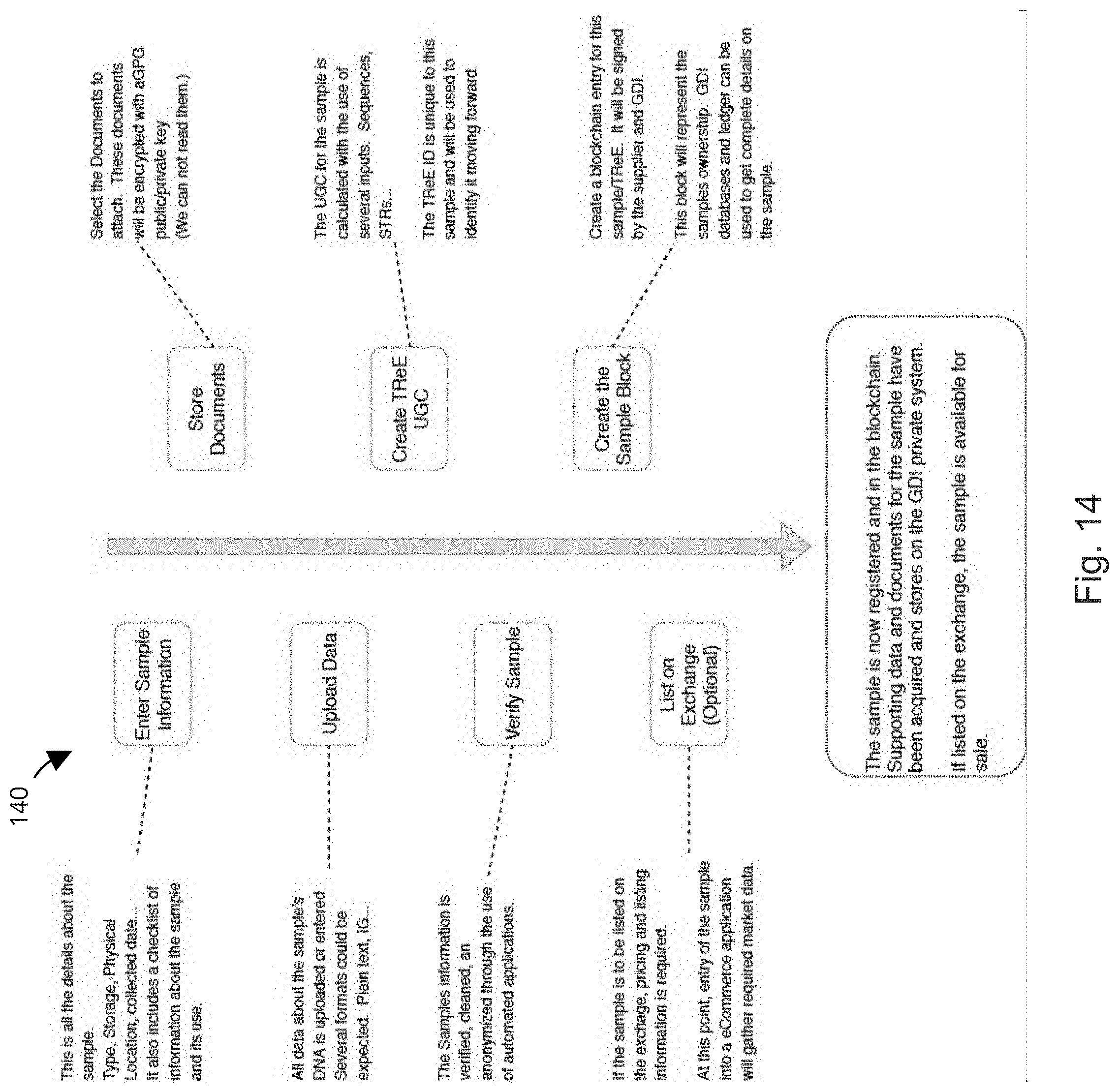 This application claims priority to U.S. Provisional Application No. 62/555,353, entitled “System and Method for Identifying and Authenticating Biosamples”, filed on Sep. 7, 2017, which is hereby incorporated by reference. The present disclosure relates to identifying and authenticating samples of biological material such as human tissue samples, especially when such samples are passed from one entity, institution, tissue collection or holding biobank to another. Biomaterials such as tissue samples can be taken from a subject at a clinic, lab or other accredited facility, and then stored or transferred to another clinic, lab or facility. It is a known problem that human (or animal) tissue samples being transferred between one entity and another can be subject to accidental or intentional loss, fraud, illegal transfer or misidentification. Identification of a biosample using DNA tests are possible. Short-tandem repeats (STRs) are a microsatellite sequence comprising a unit of two to thirteen nucleotides repeated many (hundreds) of times in succession on a DNA strand from said sample. For example, a STR named D7S820 is [GATA]8, meaning that the DNA sequence GATA is repeated eight times in a specific location on a specific chromosome of the sample. In the human specimen space, there are 46 chromosomes: 22 autosomal and 2 sex-determining. As of early 1998, the Federal Bureau of Investigation (FBI), together with other federal institutions, established a “National DNA Index System” and is one part of CODIS—the national level—containing the DNA profiles contributed by federal, state, and local participating forensic laboratories. NDIS was implemented in October 1998. All 50 states, the District of Columbia, the federal government, the U.S. Army Criminal Investigation Laboratory, and Puerto Rico participate in NDIS. The DNA Identification Act of 1994 (42 U.S.C. § 14132) authorized the establishment of this National DNA Index. The DNA Act specifies the categories of data that may be maintained in NDIS (convicted offenders, arrestees, legal, detainees, forensic [casework], unidentified human remains, missing persons, and relatives of missing persons) as well as requirements for participating laboratories relating to quality assurance, privacy, and expungement. As of Jan. 1, 2017, Combined DNA Index System (CODIS) with core loci including 20 STRs. This system of identification is used by some law enforcement agencies in support of criminal investigations and prosecutions, and is used in U.S. justice systems' DNA databases. Other countries have similar or differing methods for genetic identification. Polymerase-chain reactions (PCRs) and specialty equipment can be used to detect the presence of specific STRs in a bio (tissue) sample. Detecting the quantity of STRs in a sample can be achieved by commercially available kits. In some cases, a clinic or research institution needs specific tissue samples possessing certain origins or characteristics. Such samples can be quite rare or difficult to obtain, and may thus be very costly to acquire. Recipients of such samples are wary of accidental or intentional substitution or confusion in the acquired tissue samples, especially if the samples have traveled long distances, crossed jurisdictional lines, or been handled by many parties on their way from their origin to the acquiring recipient. Means to avoid sample substitution, sample tracking, establishment of custodial chains or misidentification have not been offered to date. Each tissue sample collection, biobank or commercial entity traditionally operates as a separate unit, with its own sample tracking, coding and coordination procedures. In the US, for example, the NIH-based Cooperative Human Tissue Network (CHIN) exists, based at the National Cancer Institute (NCI) that provides tissue samples for a fee, having its own certification and sample labeling procedures. Numerous academic and commercial biospecimen collections exists in the world, but there is no uniform or trusted procedure for tracking and exchange of samples. This invention seeks to address the problem of identifying or authenticating any given biosample to avoid the above problem. One embodiment is directed to a method for secure transactions in a biosample, comprising the identification of a physical asset comprising said biosample; obtaining information regarding said biosample from a provider of said biosample; encoding of information regarding said biosample into a corresponding sample data set; interrogating said biosample using a sequencing machine to generate a short tandem repeat (STR) code corresponding to said biosample; generating a digital asset or TReE ID in the present context, uniquely corresponding to said physical asset comprised of a unique genetic code (UGC) based at least on said STR and said sample data set or other data assignable to the physical sample such as a sample serial number; recording said UGC into a secure data store; generating a UGC-codified hash using a public-private key method; encoding, recording or writing said digital asset into a first block of a blockchain; brokering, in an exchange platform, a transaction in both the physical asset and its corresponding digital asset between a first party who holds rights in said physical and digital assets and a second party who intends to take the rights in said physical and digital assets following the transaction; and encoding said transaction, following its completion, into a second block of said blockchain. Another embodiment is directed to an architecture for secure transaction in a biosample, comprising a genetic testing apparatus for interrogating a physical asset of said biosample to output a unique short tandem repeat (STR) code corresponding to said biosample; a secure network of servers, configured and arranged to exchange encoded data in signals passed along one or more communication pathways coupling said servers; one or more server