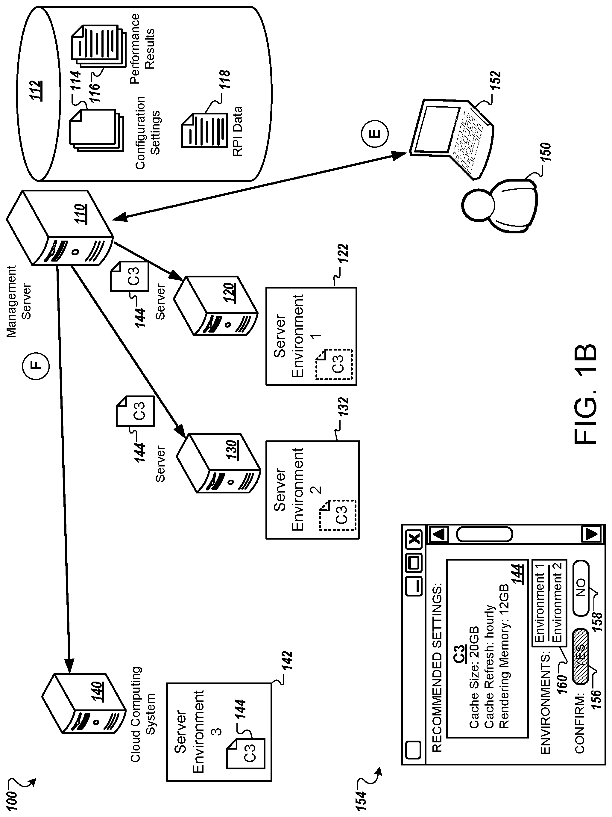 Referring now to FIG. 1B, in stage (E), the management server 110 sends a recommendation to a client device 152 of an administrator 150 for the server environments 122 and 132. In response to the recommendation, or when called up by user input, the client device 152 shows the recommended settings on a user interface of the client device 152. The user interface 154 can include controls for acting on the recommendation, such as to accept or reject the changes suggested. In addition, the user interface 154 can show performance improvements that are expected due to the change in configuration, such as an amount (e.g., percentage) increase in capacity, an amount of decrease in response time, and so on.