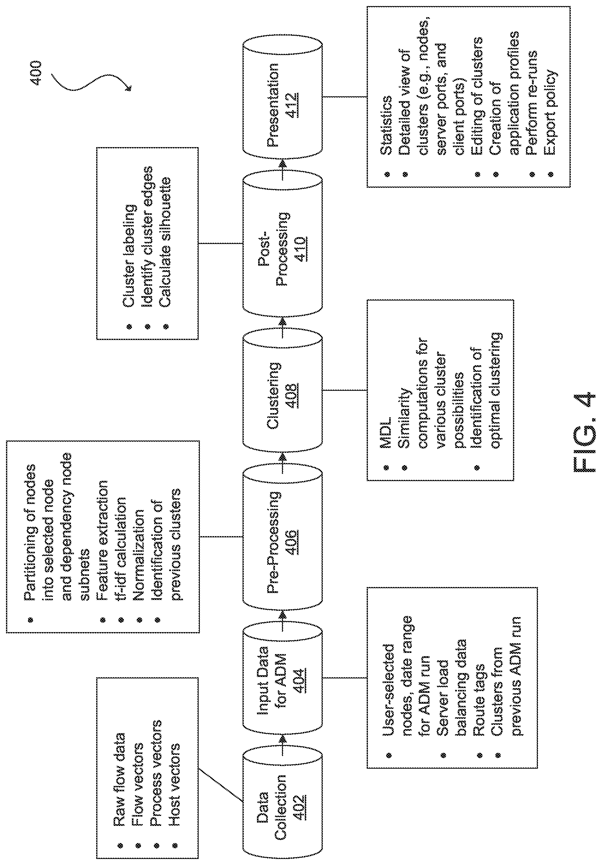 The end of the data pipeline 400 is a presentation stage 412 in which clustering data can be meaningfully and intuitively displayed to the user. In some embodiments, a user interface of the presentation stage 412 may allow the user to view statistics on clusters (e.g., number of nodes, edges, clusters, summaries of changes in clustering from the last ADM run, etc.) and detailed information for each cluster (e.g., nodes, server ports, and client ports, etc.). In some embodiments, the user interface may also allow the user to edit clusters (e.g., add or modify names and descriptions of clusters, move nodes from one cluster to another, approve an automatically determined cluster). In some embodiments, the user may operate the user interface to create application profiles, or to perform ADM re-runs.