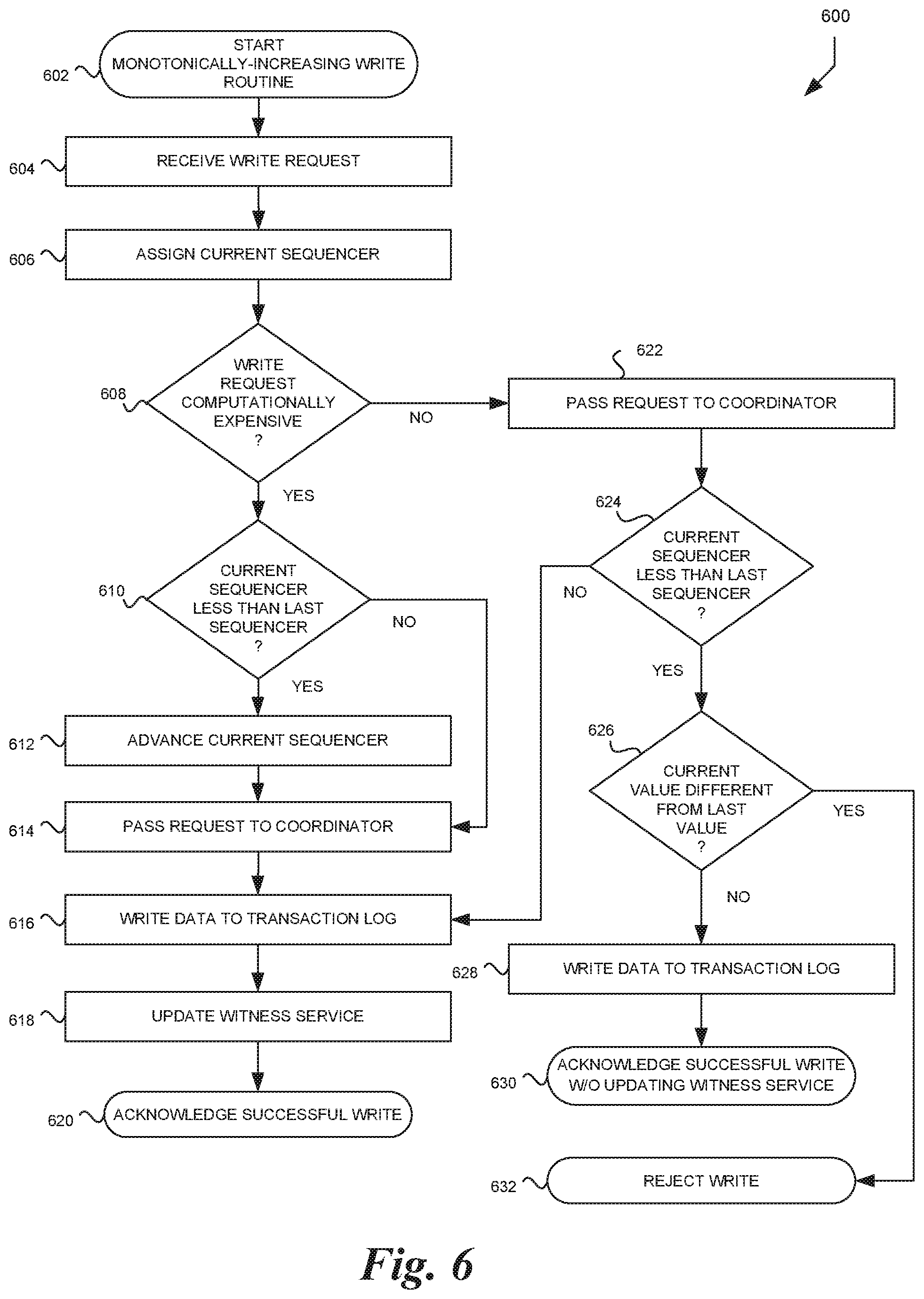 store, in a transaction log, first data associated with a key and a first sequence number; receive a write request comprising second data associated with the key; generate a second sequence number; obtain the first sequence number from the transaction log based at least partly on the key; determine that the second sequence number is less than the first sequence number; modify the second sequence number to generate a modified second sequence number; and perform a storage operation in response to the write request based at least partly on the modified second sequence number. 14. The system of store, in the transaction log, the second data associated with the key and the modified second sequence number, wherein the modified second sequence number is greater than the first sequence number. 15. The system of determine that the write request comprises a particular write request type of a plurality of write request types, and determine, based at least partly on the write request comprising the particular write request type, that the storage operation is to include modifying the second sequence number. 16. The system of 17. The system of determine that the write request comprises a single-part write request, and determine, based at least partly on the write request comprising the single-part write request, that the storage operation is to include determining whether the first data is equal to the second data. 18. The system of 19. The system of send, to a witness service, a message that the first sequence number is associated with the key; and store the first data associated with the key to a first persistent storage node. 20. The system of receive a second write request comprising third data associated with the key; generate a third sequence number; obtain the first sequence number from the transaction log based at least partly on the key; determine that the second sequence number is greater than the first sequence number; and store the third data and the third sequence number in the transaction log.