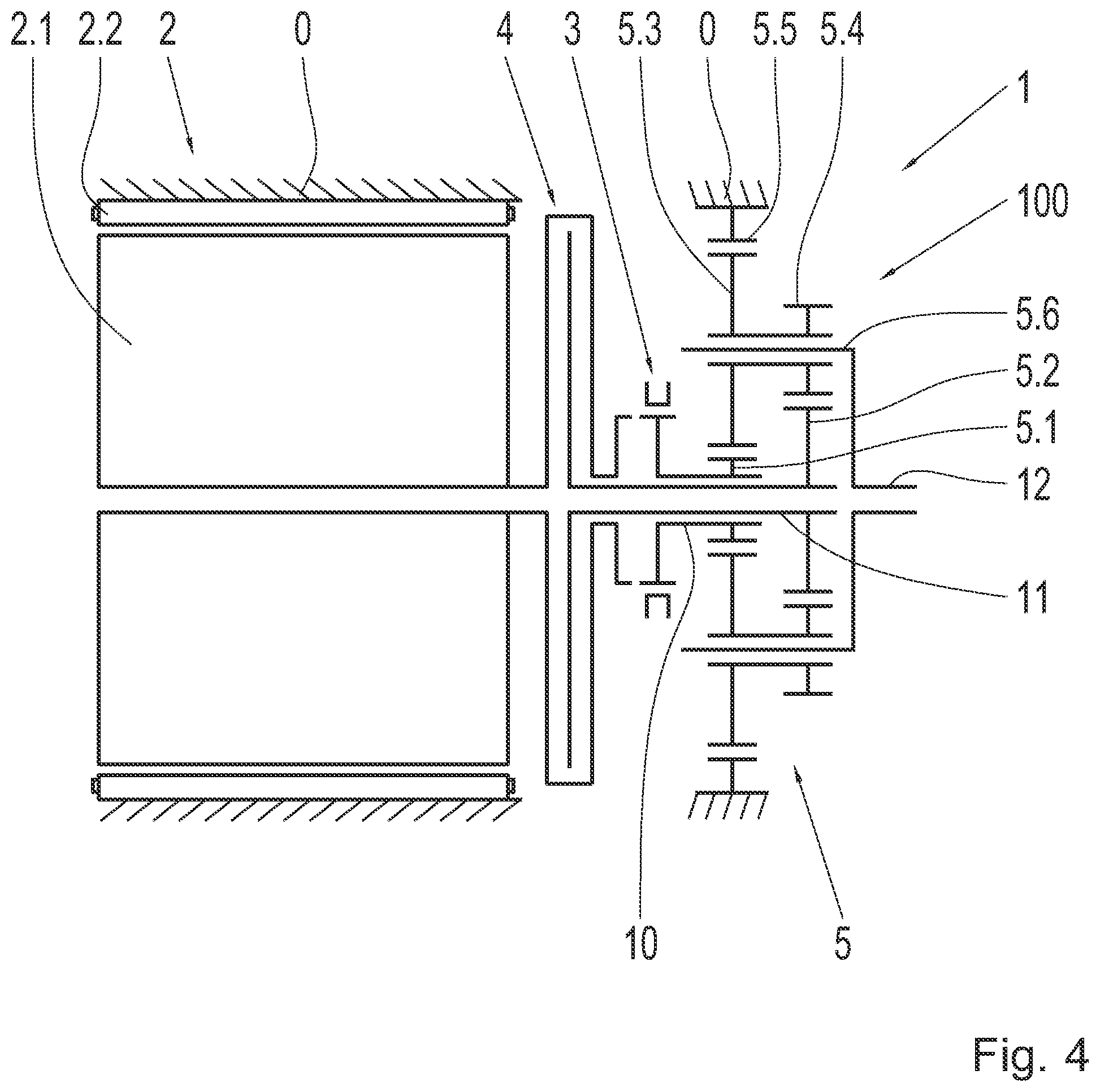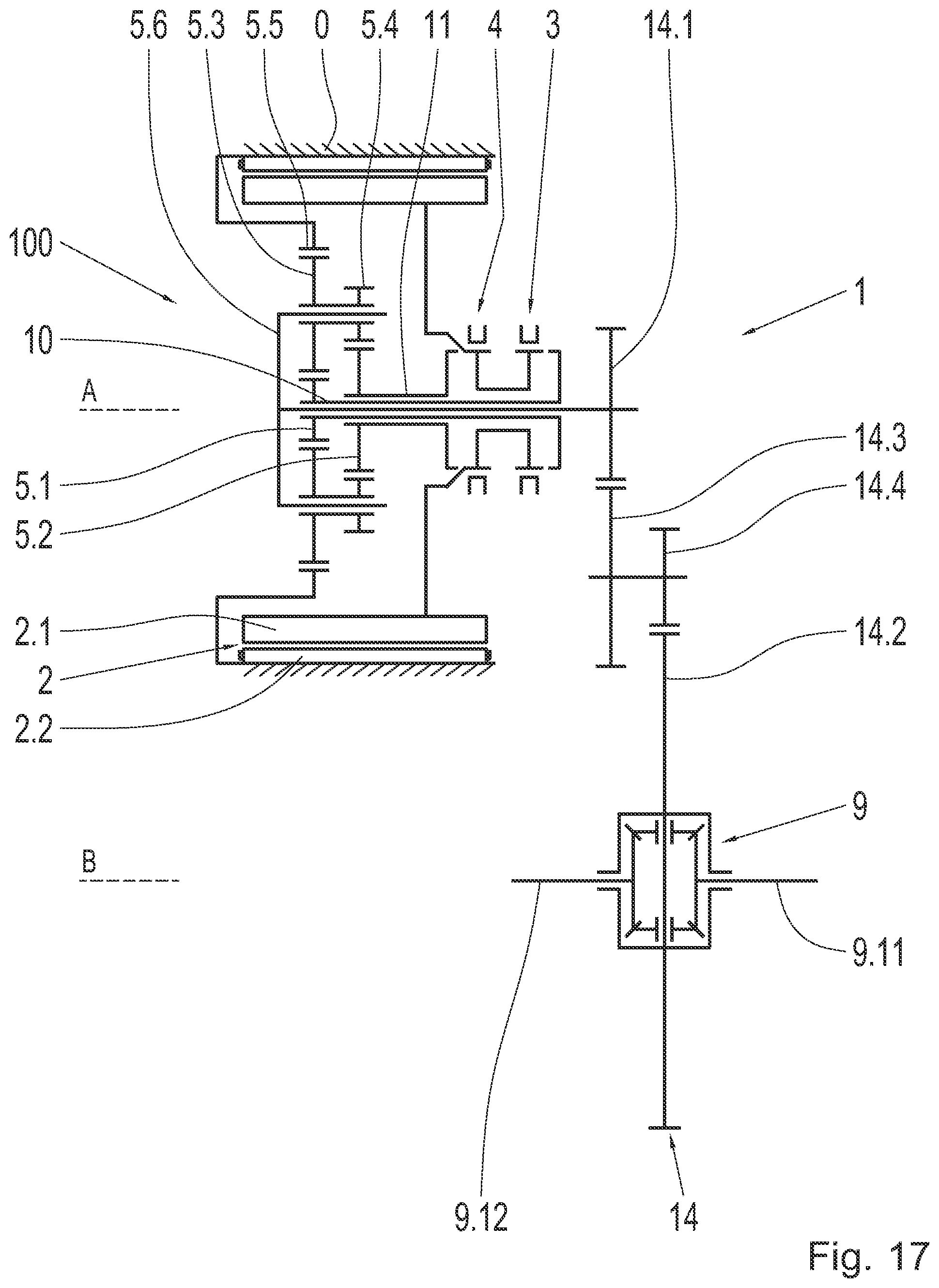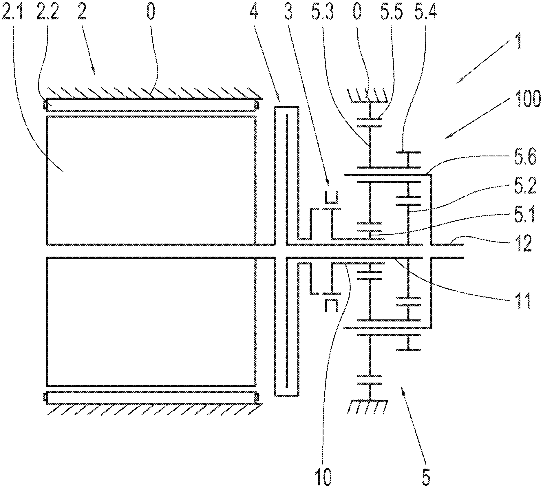 the electric drive of a differential connected to the output shaft (12) of the first planetary gear set (5). 18. The drive train of 19. The drive train of 20. The drive train of