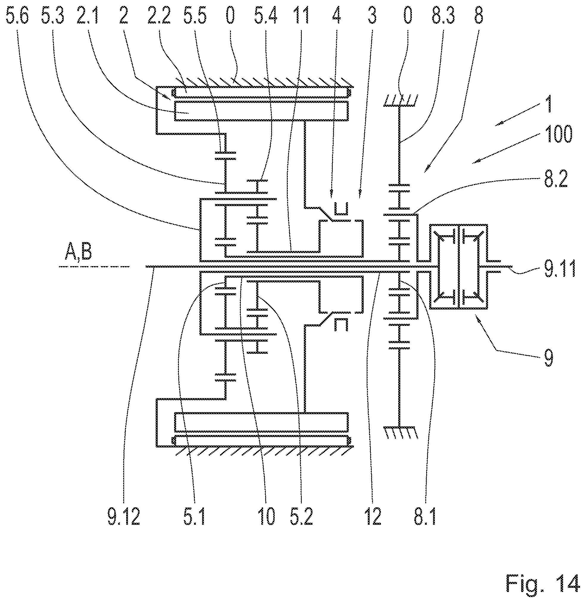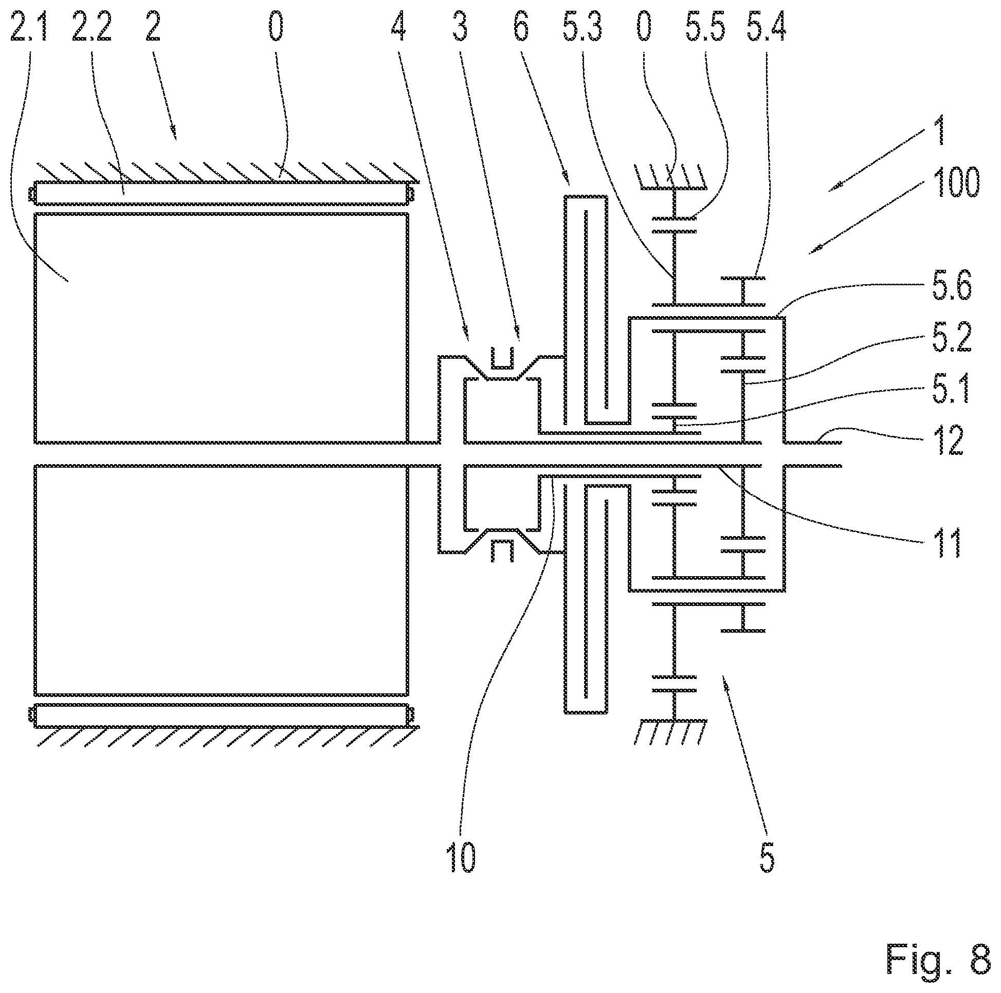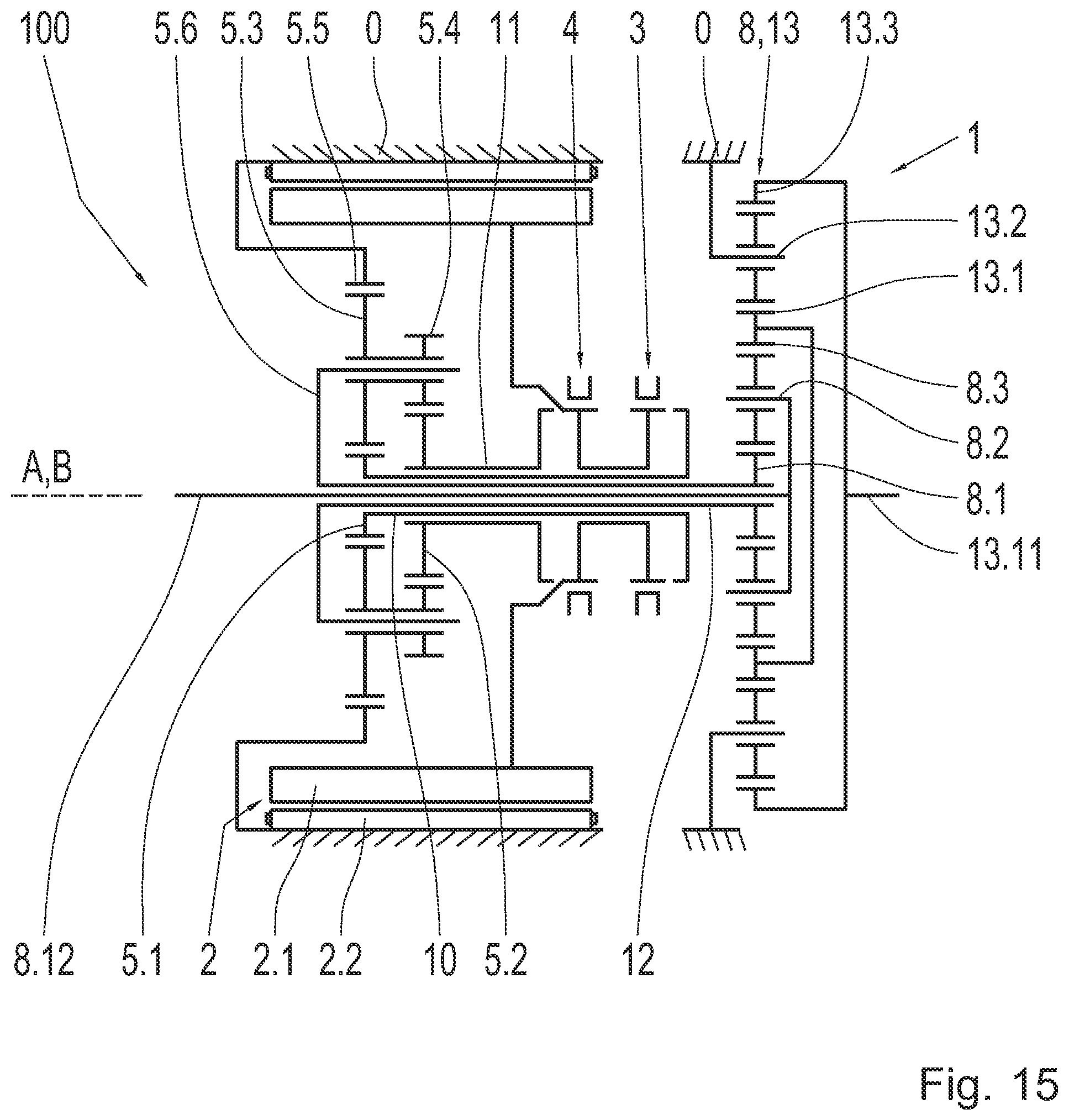 the electric drive of a differential connected to the output shaft (12) of the first planetary gear set (5). 18. The drive train of 19. The drive train of 20. The drive train of