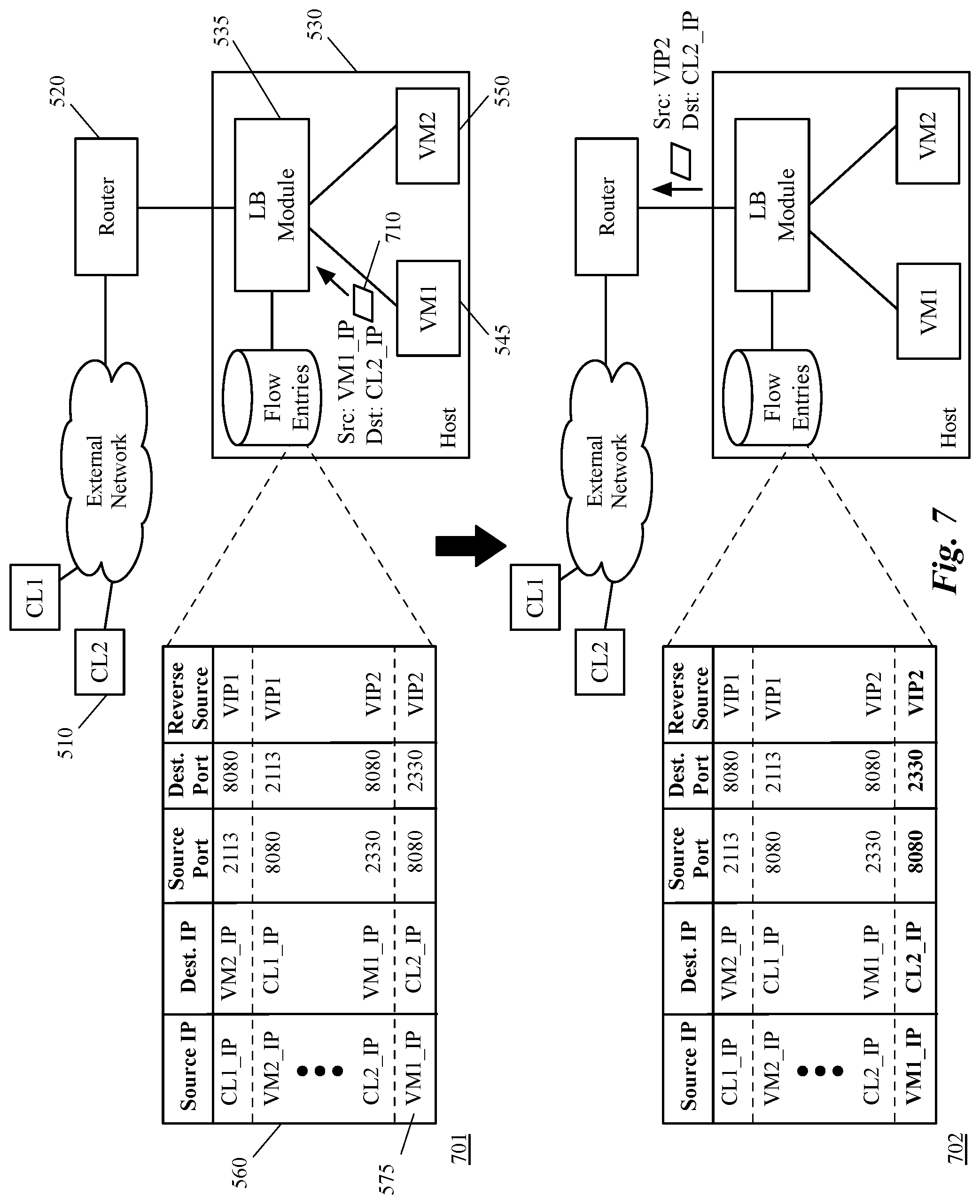 receiving a first data message that a client machine has sent to the virtual network address and a load balancer has re-directed to one particular server machine in the group of server machines; creating a record that associates the virtual network address with data messages that the particular server machine will send back to the client machine; forwarding the first data message towards the particular server machine; and using the created record to replace a source network address with the virtual network address in the data messages that the particular server machine sends back to the client machine. 13. The non-transitory machine readable medium of 14. The non-transitory machine readable medium of 15. The non-transitory machine readable medium of 16. The non-transitory machine readable medium of 17. The non-transitory machine readable medium of 18. The non-transitory machine readable medium of 19. The non-transitory machine readable medium of