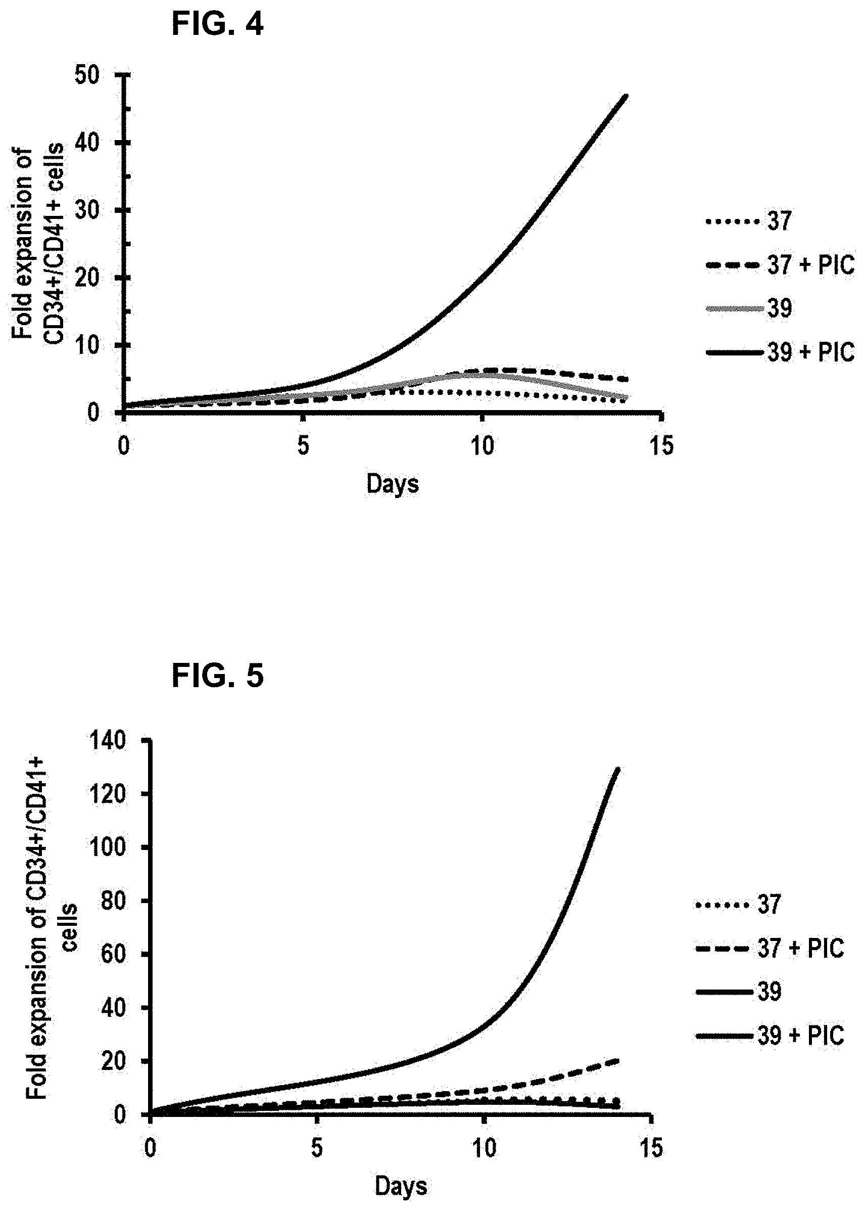 Phenotypic analysis of CD34+ cells cultured in conditions favoring CD34+ cell expansion with limited differentiation Percentage of cells bearing cell surface marker(s) Day of CD34+/ CD34+/ CD34+/ culture Conditions CD34+ CD41+ CD42+ CD45RA+ CD45RA− CD235+ CD41+ CD235+ Day 4 37° C. 94.30 8.14 2.32 68.21 5.44 7.67 5.10 37° C. + PIC 97.91 12.53 1.08 65.34 4.87 12.51 4.83 39° C. 85.81 7.92 4.16 62.68 8.62 5.03 5.94 39° C. + PIC 94.74 9.05 2.21 57.92 4.11 8.37 3.65 Day 7 37° C. 80.38 13.62 5.13 68.46 9.42 12.10 8.18 37° C. + PIC 94.61 15.93 1.30 80.07 5.42 15.74 5.28 39° C. 85.29 10.83 13.94 95.42 13.94 9.44 13.00 39° C. + PIC 88.27 18.12 2.92 74.14 10.89 16.17 9.68 Day 10 37° C. 34.46 12.95 8.58 79.08 5.41 8.80 2.82 37° C. + PIC 84.26 14.19 0.48 88.37 2.33 12.94 2.16 39° C. —* —* —* —* —* —* —* —* 39° C. + PIC 71.28 27.40 1.35 82.34 9.36 20.80 7.94 Day 14 37° C. 20.49 8.14 3.61 71.95 5.26 4.09 4.37 1.90 37° C. + PIC 58.28 15.16 0.19 84.63 15.22 2.10 9.55 1.39 39° C. —* —* —* —* —* —* —* —* 39° C. + PIC 48.58 32.04 1.16 81.97 19.74 5.13 13.88 3.72 Day 17 37° C. 13.03 9.43 1.84 76.57 4.38 5.24 2.30 2.04 37° C. + PIC 48.29 24.70 0.63 87.89 13.58 3.94 9.75 0.52 39° C. —* —* —* —* —* —* —* —* 39° C. + PIC Day 21 37° C. 37° C. + PIC 39° C. —* —* —* —* —* —* —* —* 39° C. + PIC *N/D: Not determined. Example 6