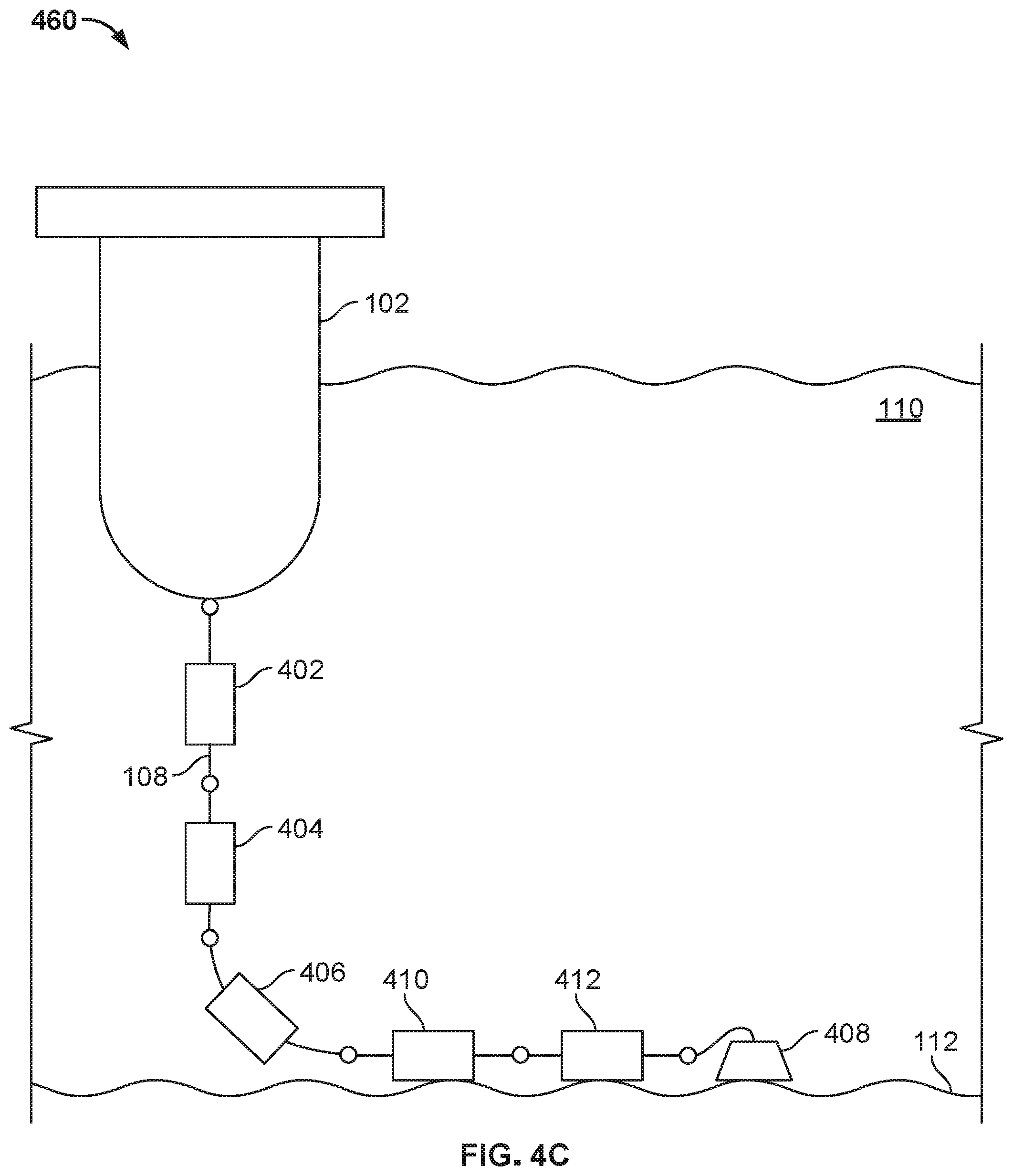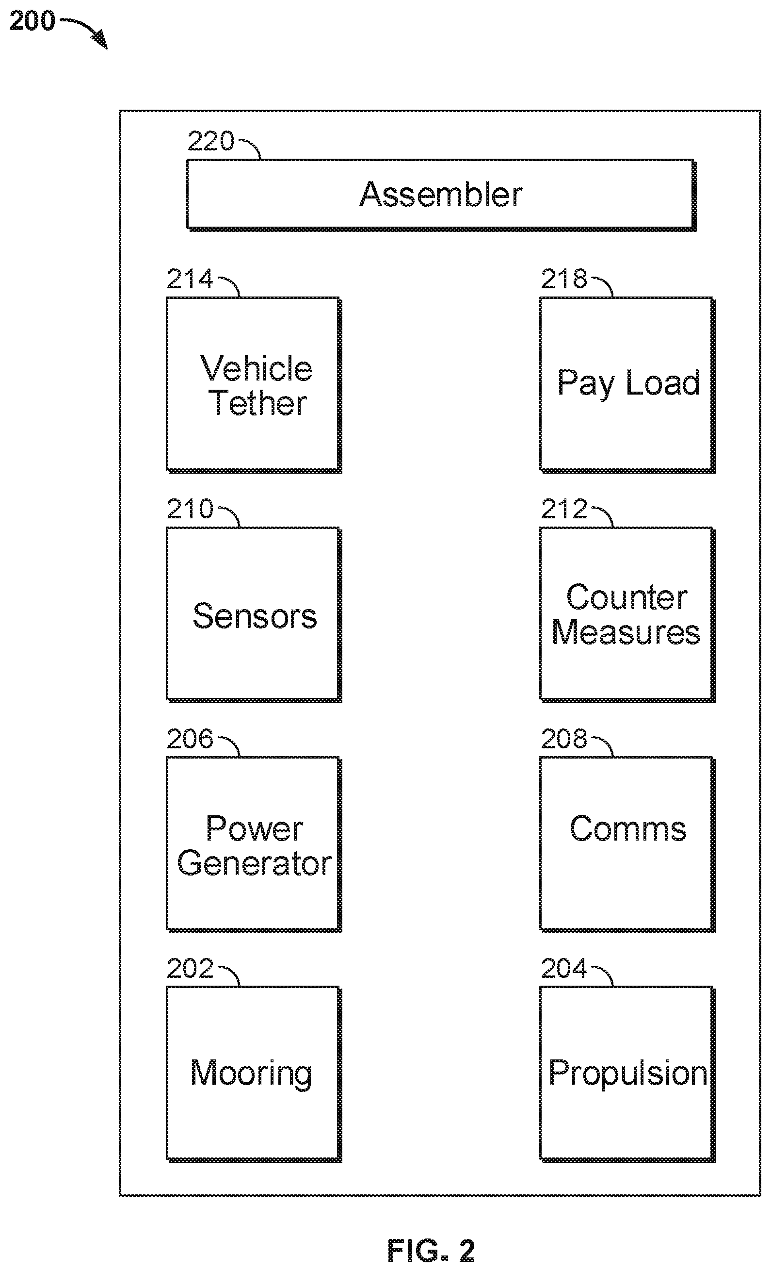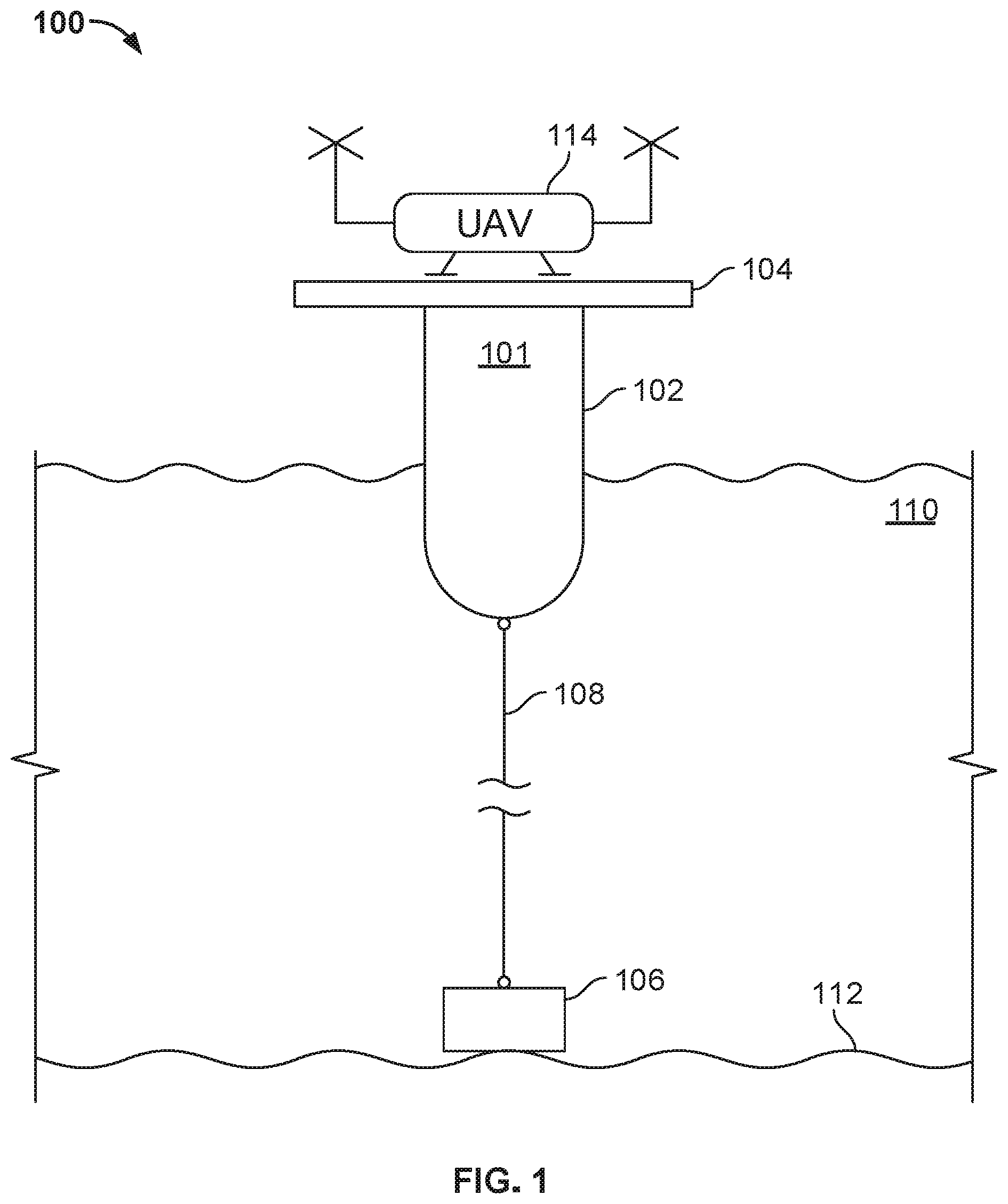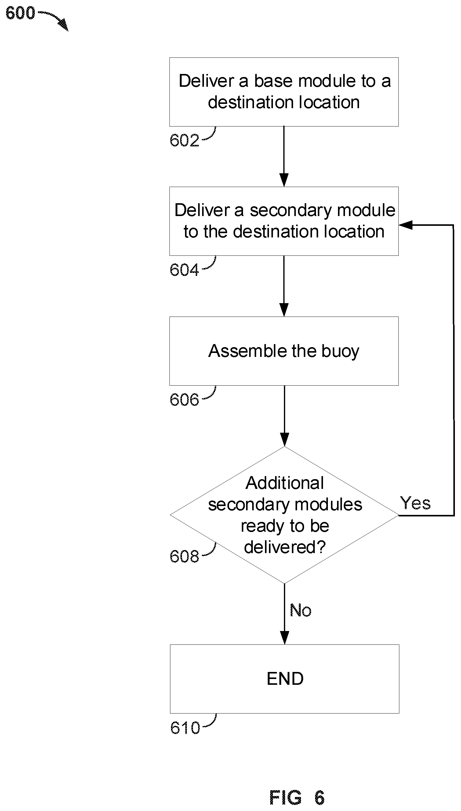 This application is a continuation of U.S. patent application Ser. No. 16/238,814, filed on Jan. 3, 2019, which claims priority to and the benefit of U.S. Provisional Patent Application No. 62/613,291, filed on Jan. 3, 2018, and entitled “Incremental Deployment of a Buoy and/or Buoy Network.” The entire contents of the above-referenced applications are incorporated herein by reference. A buoy is a device configured to float within a body of water such as an ocean. A buoy can perform various objectives including functioning as a sea mark, lifebuoy, a submarine communications buoy, a DAN buoy, navigational buoy, Sonobuoy, surface marker buoy, decompression buoy, shot buoy, weather buoy, Tsunami buoy, wave buoy, and so on. A buoy can be anchored (tethered) or allowed to drift within a body of water. Various techniques are known for deploying buoys. However, there is a need for enabling more efficient, timely, and less costly deployment of buoys. Systems and methods are disclosed herein for more efficiently deploying one or more buoys. In one aspect, a buoy is arranged in multiple sections or modules that are connectable to one or more other modules of a buoy. The sections and/or modules may be configured and/or sized (and/or weighted) so as to enable a delivery vehicle, such as an unmanned aerial vehicle (UAV) to carry each section to a destination location for assembly of the buoy at the destination location. Other types of delivery vehicles or device may be used such as, without limitation, a land-based vehicle (e.g., an autonomous automobile or robot) or a marine based vehicle (e.g., a AUV). In the instance of a water-based buoy, the delivery device may include multiple mode of movement including a combination of two or more of land, water, and air mobility features or propulsion systems. In this way, a buoy may be rapidly deployed at a relatively long distance over a body of water (or over a body of land, or both) by delivering and assembling various sections, modules, and components at a desired location. A buoy may be assembled to include a vehicle tether such as a platform to enable a UAV, drone, or other aerial vehicle to land on the buoy. The buoy may include a power generator and/or energy store to power functions of the buoy. The buoy may also include a power interface configured to provide power to an UAV, drone, aerial vehicle, or water-born vehicle (e.g., a boat, underwater vehicle (e.g., AUV), unmanned surface vehicle (USV), and so on). Hence, in certain implementations, a network of buoys may incrementally propagate from one or more previously deployed buoys. For instance, once one buoy is deployed and assembled, and operational, then one or more UAVs will be able to land and recharge (or refuel) at the buoy. Parts, modules, and/or sections for additional buoys may be stored by the first buoy. Hence, a recharged UAV may delivery parts to a new location for assembly of a new buoy, and so on, enabling the propagations of buoys throughout a region or area of ocean and/or land. In certain aspects, assembly of a buoy is performed autonomously by one or more UAVs. In some implementations, one or more modules are configured to sense and/or detect the presence of another module and perform an attachment and/or engagement to the one or more other modules. In some implementations, an assembly robot, vehicle, or system may be positioned at a designated location for a buoy and assemble the buoy as modules are delivered by one or more UAVs. This would advantageously reduce the power consumption of the assembly vehicle by eliminating or reducing a need for the vehicle to carry buoy components. In some implementations, a buoy includes a mooring system having a tethering line and mooring element, weight, and/or anchor element. The tethering line may be delivered to a buoy in one or more sections. The tethering line may be configured to include one or more buoyancy elements. Each buoyancy element may be configured to become negatively buoyant at a designated depth within a body of water such as sea water or fresh water. In one implementation, a buoyancy element includes a bladder configured to collapse at a particular depth within ocean water. As the bladder collapses, the density of the bladder increases, causing the bladder to become negatively buoyant and, thereby, causing the bladder along with adjacent elements along a tethering line to sink as well. By including a series of bladders spaced along a tethering line, a relatively light weight and buoyant tethering line may be staged on the ocean surface next to a buoy. One or more sections of the tethering line may be delivered to the buoy by an UAV Other delivery devices may be utilized such as an AUV, underwater drone, surface water vehicle, USV, and/or surface water drone. Once the tethering line is connected to and staged next to a buoy, a mooring element (e.g., a weight or anchor) may be attached to the free end of the tethering line. Once attached, the mooring element or weight (being negatively buoyant) begins to sink and pull the tethering line downward and, thereby, pull an adjacent bladder downward until the adjacent bladder collapses to become negatively buoyant which, in turn, pulls the tethering line further downward until the next bladder reaches a depth to which it collapses, and so on, until the tethering line and mooring weight sink to the ocean floor. Such a mooring system advantageously enables delivery of a relatively light weight tethering system via one or more UAVs, having relatively limited lift capacity, to a buoy, while enabling subsequent deployment of the tethering line and mooring weight or anchor so as to anchor a buoy to a particular location. In some instances, multiple trips may be performed to pre-stage one or more components of the buoy on the surface of the water before sinking the mooring weight and/or anchor. In one aspect, a plurality of buoys is incrementally or sequentially deployed by propagati