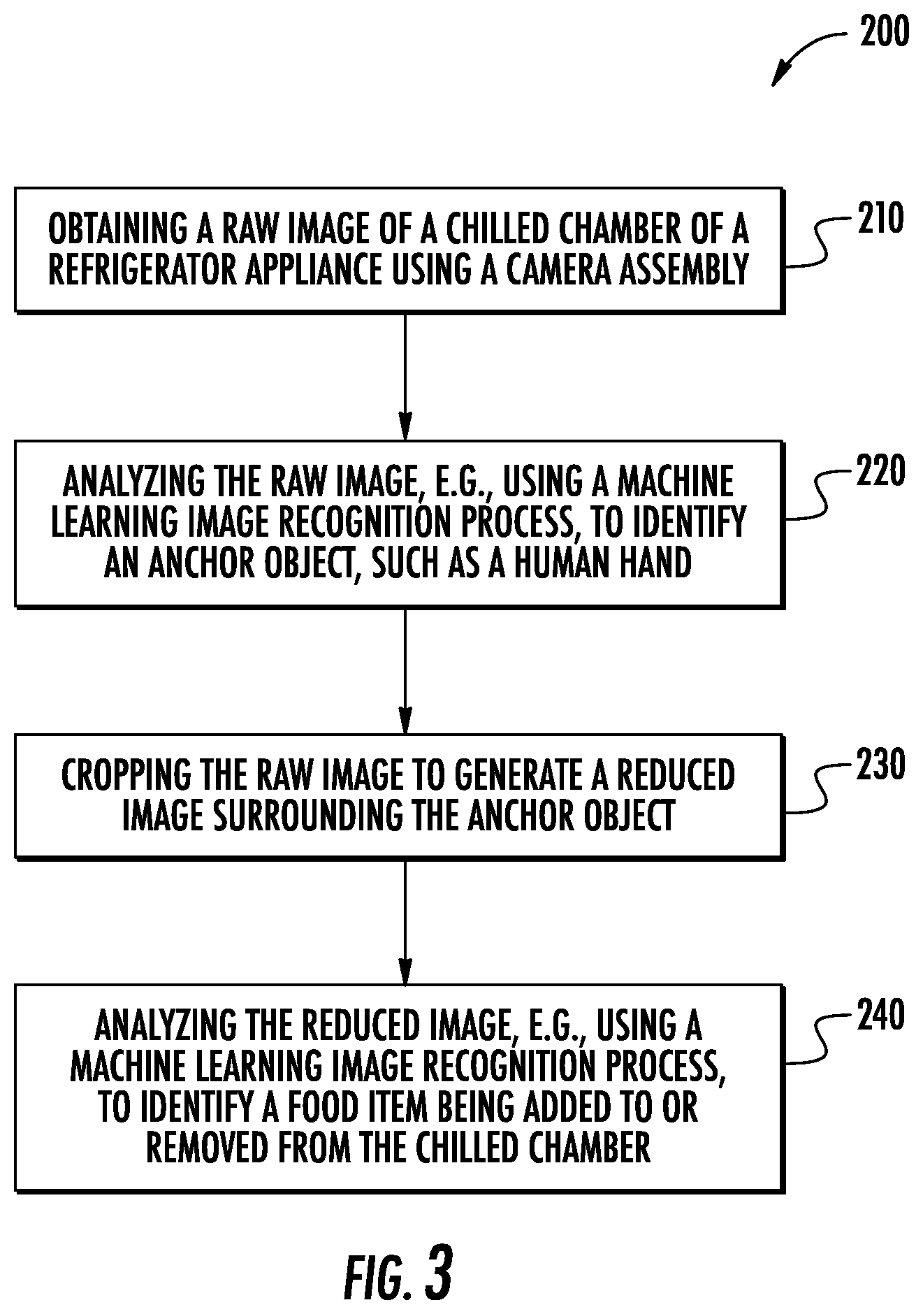 Step 220 includes analyzing the raw image to identify an anchor object. Specifically, according to exemplary embodiments, an anchor object 178 may be a human hand that is positioning food items 176 into fresh food chamber 122. According to still other embodiments, anchor object 178 may be any object that is used add or remove food items 176 from fresh food chamber 122. In this regard, for example, anchor object 178 may be packaging within which food items 176 are positioned, a shopping bag, or any other suitable object.