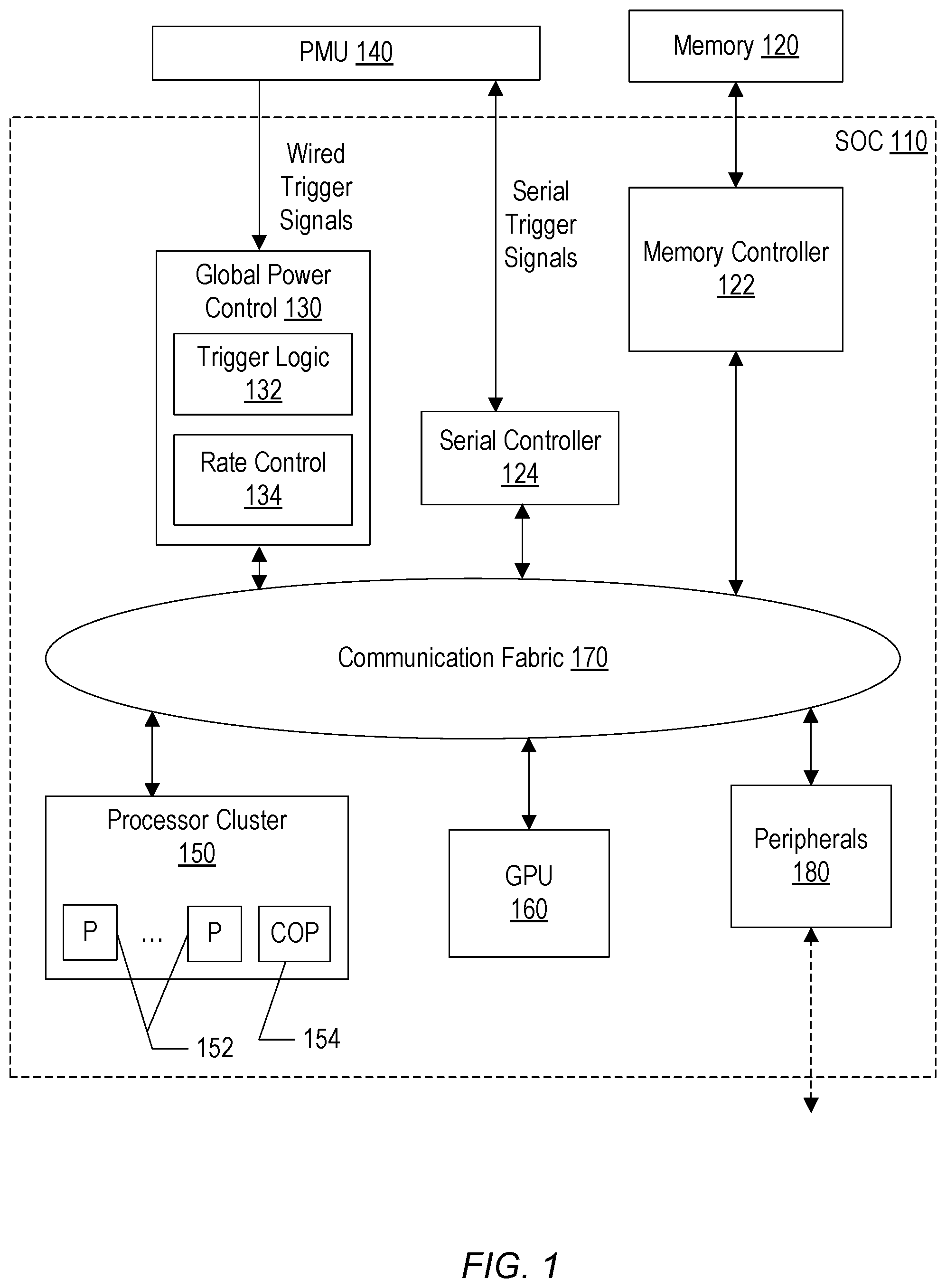 This patent application claims priority to U.S. Provisional Patent Application No. 63/239,264, filed Aug. 31, 2021, which is incorporated by reference herein. Embodiments described herein are related to power management in an integrated circuit and, more particularly, to trigger circuits for controlling power delivery to the integrated circuit. Features and advantages of the methods and apparatus of the embodiments described in this disclosure will be more fully appreciated by reference to the following detailed description of presently preferred but nonetheless illustrative embodiments in accordance with the embodiments described in this disclosure when taken in conjunction with the accompanying drawings in which: In the following description, numerous specific details are set forth to provide a thorough understanding of the disclosed embodiments. One having ordinary skill in the art, however, should recognize that aspects of disclosed embodiments might be practiced without these specific details. In some instances, well-known circuits, structures, signals, computer program instruction, and techniques have not been shown in detail to avoid obscuring the disclosed embodiments. In various embodiments, the trigger output signal may be communicated to SOC 110 via a wired transmission (e.g., a hardwired interface between two components) or a serial communication interface (e.g., a two-way communication interface). Wired trigger signal transmissions may be provided to a global power control circuit 130 incorporated into the SOC 110 may receive the trigger input while serial trigger signal transmissions may be provided directly to processor engines (such as processor cluster 150, GPU 160, or peripherals 180) via serial controller 124 and/or communication fabric 170. Serial controller 124 may be a system power management interface (SPMI) that provides two-way communication between the processor engines and PMU 140. While serial controller 124 is shown communicating with the processor engines through communication fabric 170 in As implied by the name, the components of the SOC 110 may be integrated onto a single semiconductor substrate as an integrated circuit “chip.” In the illustrated embodiment, the components of the SOC 110 include at least one processor cluster 150, at least one graphics processing unit (GPU) 160, one or more peripheral components such as peripheral components 180 (more briefly, “peripherals”), at least one memory controller 122, a global power control circuit 130, and a communication fabric 170. The components 150, 160, 180, 122, and 130 may all be coupled to the communication fabric 170. The memory controller 122 may be coupled to the memory 120 during use. In some embodiments, there may be more than one memory controller coupled to a corresponding memory. The memory address space may be mapped across the memory controllers in any desired fashion in such embodiments. In the illustrated embodiment, the processor cluster 150 may include a plurality of processors (P) 152. The processors 152 may form the central processing units (CPU(s)) of the SOC 110. The processor cluster 150 may further include one or more coprocessors (e.g., the coprocessor 154 in As described above, processor cluster 150 may include one or more processors 152 that may serve as the CPU of the SOC 110. The CPU of the system includes the processor(s) that execute(s) the main control software of the system, such as an operating system. Generally, software executed by the CPU during use may control the other components of the system to realize the desired functionality of the system. The processors may also execute other software, such as application programs. The application programs may provide user functionality, and may rely on the operating system for lower-level device control, scheduling, memory management, etc. Accordingly, the processors may also be referred to as application processors. Generally, a processor may include any circuitry and/or microcode configured to execute instructions defined in an instruction set architecture implemented by the processor. Processors may encompass processor cores implemented on an integrated circuit with other components as a system on a chip (SOC 110) or other levels of integration. Processors may further encompass discrete microprocessors, processor cores and/or microprocessors integrated into multichip module implementations, processors implemented as multiple integrated circuits, etc. The memory controller 122 may generally include the circuitry for receiving memory operations from the other components of the SOC 110 and for accessing the memory 120 to complete the memory operations. The memory controller 122 may be configured to access any type of memory 120. For example, the memory 120 may be static random-access memory (SRAM), dynamic RAM (DRAM) such as synchronous DRAM (SDRAM) including double data rate (DDR, DDR2, DDR3, DDR4, etc.) DRAM. Low power/mobile versions of the DDR DRAM may be supported (e.g., LPDDR, mDDR, etc.). The memory controller 122 may include queues for memory operations, for ordering (and potentially reordering) the operations and presenting the operations to the memory 120. The memory controller 122 may further include data buffers to store write data awaiting write to memory and read data awaiting return to the source of the memory operation. In some embodiments, the memory controller 122 may include a memory cache to store recently accessed memory data. In SOC implementations, for example, the memory cache may reduce power consumption in the SOC by avoiding reaccess of data from the memory 120 if it is expected to be accessed again soon. In some cases, the memory cache may also be referred to as a system cache, as opposed to private caches such as the L2 cache or caches in the processors, which serve only certain components. Additionally, in some embodiments, a system cache need not be located within the memory controller 122.