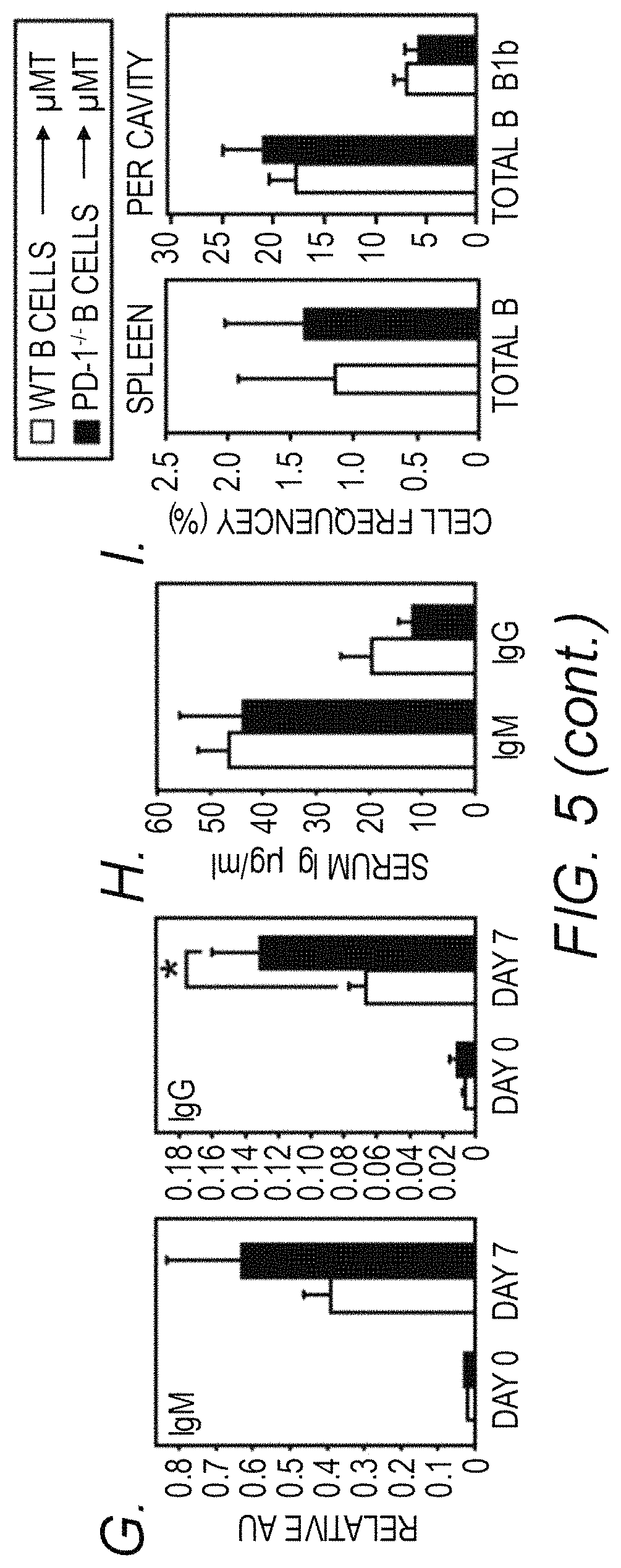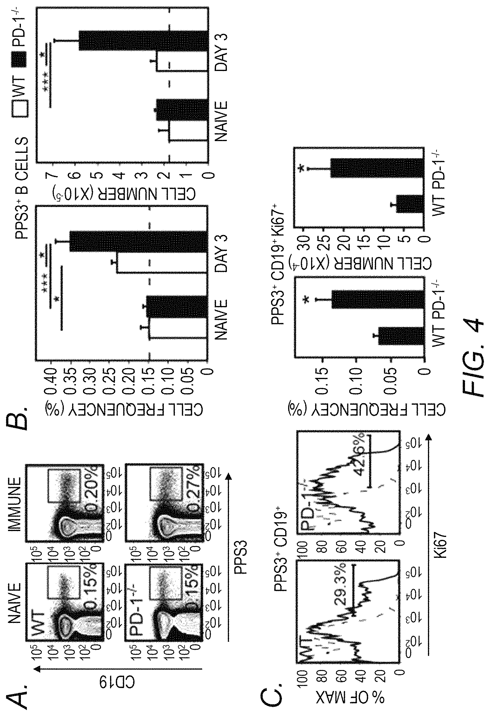 This application claims the benefit of International Application No. PCT/US2014/071901, filed Dec. 22, 2014, which claims the benefit of U.S. Provisional Application No. 61/919,360, filed Dec. 20, 2013, all of the contents of which are hereby incorporated by reference herein in their entireties. This presently disclosed subject matter was made with United States government support under R21AI095800 and AI007401 awarded by the National Institutes of Health (NIH) and P30CA012197 awarded by the National Cancer Institute (NCI). The U.S. government has certain rights in the presently disclosed subject matter. This application contains a sequence listing. It has been submitted electronically via EFS-Web as an ASCII text file entitled “131198-00008_ST25.txt”. The sequence listing is 6,778 bytes in size, and was created on Dec. 19, 2014. It is hereby incorporated by reference in its entirety. The presently disclosed subject matter relates to the fields of pharmacology and medicine, and provides therapeutic methods and compositions for the prevention and treatment of bacterial infections caused by PD-1 is a B7/CD28 superfamily receptor expressed on activated lymphoid and myeloid cells (Keir et al. (2008) Studies examining PD-1 regulation of T cells have been a major driving force in the development of therapies aimed at treating chronic viral infections, cancer, and autoimmunity. However, relatively little is known regarding how interfering with PD-1:PD-1 ligand interactions influences non-T cells in vivo. In particular, studies examining the role of PD-1 in regulating B cell activity are limited. Antigen-receptor activated B cells express PD-1 (Haas (2011) The presently disclosed subject matter provides methods and compositions for increasing protective antibody levels induced by pneumococcal polysaccharide vaccines. In one aspect, the presently disclosed subject matter is directed to a method for increasing protective antibody levels and/or enhancing a protective immune response induced by one or more pneumococcal polysaccharide antigens in a subject in need thereof, the method comprising administering to the subject an effective amount of an agent that inhibits the interaction between a PD-1 ligand and a PD-1 polypeptide. In some aspects, the one or more pneumococcal polysaccharide antigens are capsular polysaccharides from one or more different serotypes of In a further aspect, the presently disclosed subject matter is directed to a method of treating a bacterial infection caused by In some aspects, the presently disclosed subject matter is directed to an immunogenic composition comprising: a) one or more pneumococcal polysaccharide antigens; b) an effective amount of an agent that inhibits the interaction between a PD-1 ligand and a PD-1 polypeptide; and c) a pharmaceutically acceptable carrier. In some aspects, the one or more pneumococcal polysaccharide antigens are capsular polysaccharides from one or more different serotypes of In other aspects, the presently disclosed subject matter is directed to a kit for increasing protective antibody levels induced by one or more pneumococcal polysaccharide antigens in a subject in need thereof, the kit comprising: a) a pneumococcal polysaccharide vaccine comprising one or more pneumococcal polysaccharide antigens; b) an agent that inhibits the interaction between a PD-1 ligand and a PD-1 polypeptide; and c) instructions for administration of the pneumococcal polysaccharide vaccine and the agent to the subject. A kit for treating a bacterial infection caused by Certain aspects of the presently disclosed subject matter having been stated herein above, which are addressed in whole or in part by the presently disclosed subject matter, other aspects will become evident as the description proceeds when taken in connection with the accompanying Examples and Figures as best described herein below. Having thus described the presently disclosed subject matter in general terms, reference will now be made to the accompanying Figures, which are not necessarily drawn to scale, and wherein: The presently disclosed subject matter now will be described more fully hereinafter with reference to the accompanying Figures, in which some, but not all embodiments of the presently disclosed subject matter are shown. Like numbers refer to like elements throughout. The presently disclosed subject matter may be embodied in many different forms and should not be construed as limited to the embodiments set forth herein; rather, these embodiments are provided so that this disclosure will satisfy applicable legal requirements. Indeed, many modifications and other embodiments of the presently disclosed subject matter set forth herein will come to mind to one skilled in the art to which the presently disclosed subject matter pertains having the benefit of the teachings presented in the foregoing descriptions and the associated Figures. Therefore, it is to be understood that the presently disclosed subject matter is not to be limited to the specific embodiments disclosed and that modifications and other embodiments are intended to be included within the scope of the appended claims. The presently disclosed subject matter is directed to methods and compositions for increasing protective antibody levels induced by pneumococcal polysaccharide vaccines. As described more fully below, the presently disclosed subject matter relates to the finding that inhibiting the interaction of PD-1 with its ligands significantly increases IgG levels to polysaccharide antigens. Specifically, inhibiting the interaction of PD-1 with its ligands, particularly PDL1 and PDL2, significantly increased the levels of protective IgG antibodies produced against the polysaccharide antigens in a multivalent pneumococcal polysaccharide vaccine. Not only were IgG levels significantly increased against the total multivalent pneumococcal polysaccharide vaccine (the Pneumovax®23 vaccine), but IgG levels were signif