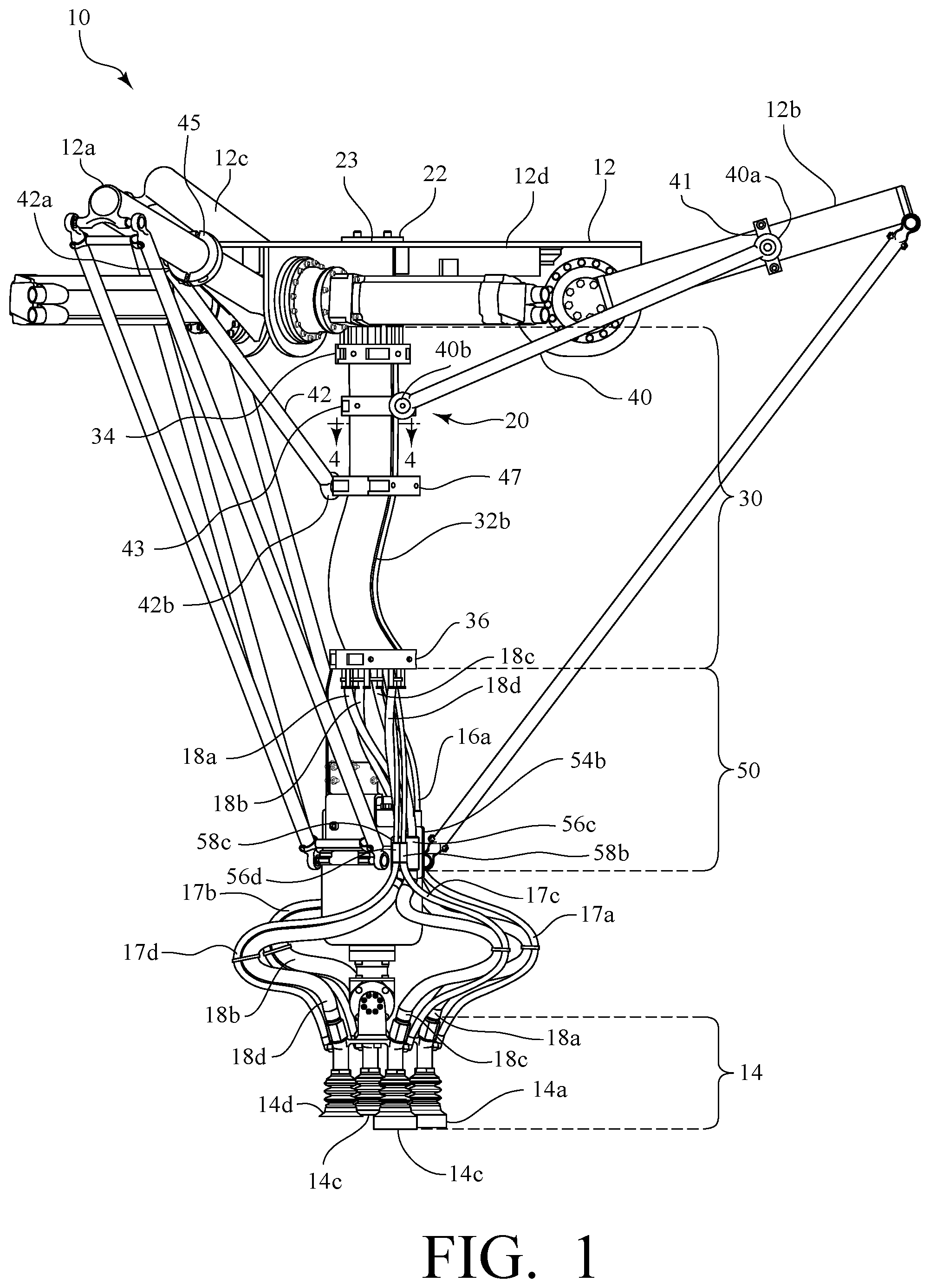 [0039]Referring now again specifically to FIG. 1, the arms of the robotic framework 12 to which the first leash 40 and the second leash 42 are mounted are spaced apart from each other, such that the first set of outer bounds imposed on the cable carrier 30 and cables 16a, 16b, 16c, 16d, 17a, 17b, 17c, 17d, 18a, 18b, 18c, 18d received therein by the first leash 40 significantly limits the extent to which the cable carrier 30 at the point where the first leash 40 is mounted can travel toward the first arm 12a of the robotic framework 12 to which the second leash 42 is mounted. As a result of such spacing, the second set of outer bounds imposed on the cable carrier 30 and the cables 16a, 16b, 16c, 16d, 17a, 17b, 17c, 17d, 18a, 18b, 18c, 18d received therein by the second leash 42 also significantly limits the extent to which the cable carrier 30 at the point where the second leash 42 is mounted can travel toward the second arm 12b of the robotic framework 12 to which the first leash 40 is mounted. In this exemplary embodiment, the arms 12a, 12b, 12c of the robotic framework 12 are spaced apart from each other by approximately 120°. In conjunction, the first and second set of bounds imposed by the first leash 40 and the second leash 42, respectively, helps to maintain the cable carrier 30 and the cables 16a, 16b, 16c, 16d, 17a, 17b, 17c, 17d, 18a, 18b, 18c, 18d centered in the robotic framework 12 when the robot singulator 10 is in use.