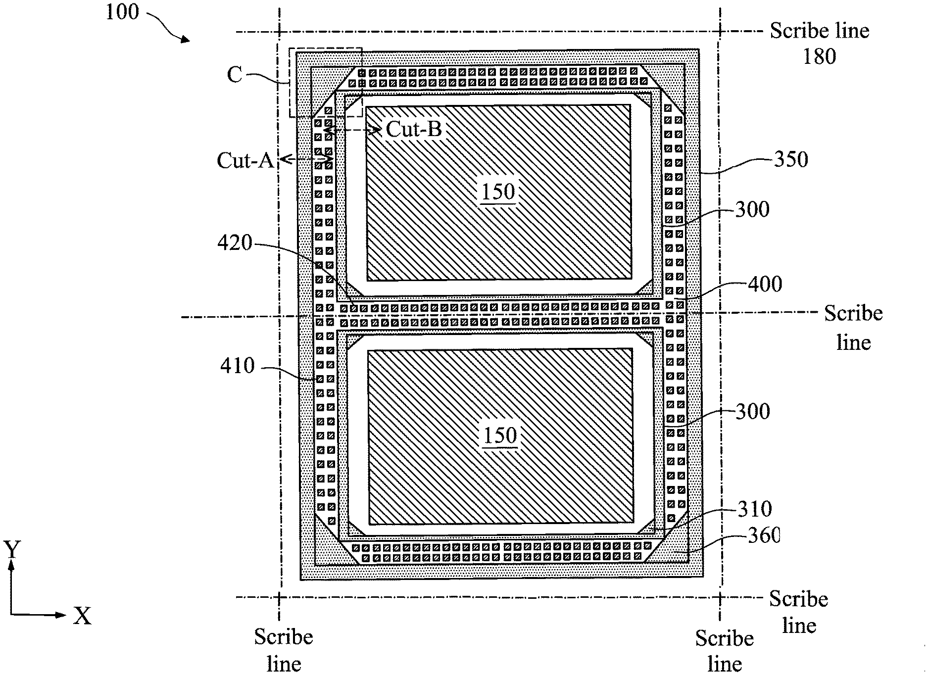two circuit regions; two inner seal rings, each of the two inner seal rings surrounding one of the two circuit regions; an outer seal ring surrounding the two inner seal rings, wherein each of the inner seal rings and the outer seal ring has a substantially rectangular periphery with four interior corner seal ring structures; four first redundant regions between the two inner seal rings and the outer seal ring, each of the four first redundant regions being a substantially trapezoidal shape; and first dummy patterns substantially uniformly distributed in the four first redundant regions. 2. The semiconductor structure of a second redundant region between the two inner seal rings, the second redundant region being a rectangular shape; and second dummy patterns substantially uniformly distributed in the second redundant region. 3. The semiconductor structure of 4. The semiconductor structure of interconnects that go through the openings and electrically connect the two circuit regions. 5. The semiconductor structure of second dummy patterns substantially uniformly distributed between the two inner seal rings and adjacent to the interconnects. 6. The semiconductor structure of 7. The semiconductor structure of 8. The semiconductor structure of 9. The semiconductor structure of 10. A semiconductor structure, comprising:
