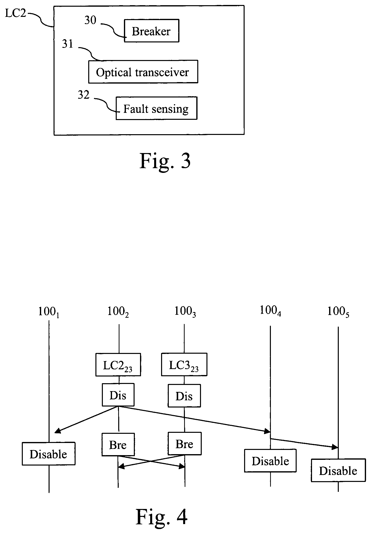 According to the invention, each HVDC node 100 Each HVDC node 100, i.e. 1001, 1002, 1003, 1004and 1005, has, for example, an architecture based on components connected together by a bus 201 and a processor 200 controlled by a program as disclosed in The bus 201 links the processor 200 to a read only memory ROM 202, a random access memory RAM 203, a link module LC for each link interconnecting the HVDC node 100, each link module LC is connected to the optical fiber of the corresponding link. The HVDC node 100 disclosed in The memory 203 contains registers intended to receive variables and the instructions of the program related to the algorithm as disclosed in The read-only memory, or possibly a Flash memory 202, contains instructions of the program related to the algorithm as disclosed in The fault protection method of HVDC node 100 may be implemented in software by execution of a set of instructions or program by a programmable computing machine, such as a PC (Personal Computer), a DSP (Digital Signal Processor) or a microcontroller; or else implemented in hardware by a machine or a dedicated component, such as an FPGA (Field-Programmable Gate Array) or an ASIC (Application-Specific Integrated Circuit). In other words, the HVDC node 100 includes circuitry, or a device including circuitry, enabling the HVDC node 100 to perform the program related to the algorithm as disclosed in Each link module comprises one fault sensing device 32, one optical tranceiver 31 and one breaker 30. The breakers comprised in the link modules LC112, LC212, LC223, LC224, LC323, LC424, LC445, LC545are for example any actuator that can break the line, be it DCCB (Direct Current Circuit Breaker), AC/DC or DC/DC power converter, or hybrid breakers, which may combine the mechanical separation of conductors and turn-off of solid-state semiconductor devices. The fault sensing devices comprised into the link modules LC112, LC212, LC223, LC224, LC323, LC424, LC445and LC545are for example current variation sensing means, voltage variation sensing means, current sensing means, or voltage sensing means. The optical transceiver receives and sends information to the link module of the distant HVDC node interconnected to the HVDC node by the HVDC link monitored by the link module. The information transits through an optical fiber that follows the path of the conductive cables interconnecting the HVDC nodes for high voltage direct current transportation. Some information transiting through the optical fiber are transmitted out-of-band, enabling a quick and very low latency detection through typical analog devices, while other less delay sensitive information can be transmitted in-band, with support of e.g. error correction. In the example of The HVDC node 1002commands the transfers, through the link modules LC212and LC224of information representative of a breaker disabling request noted Dis to each HVDC node 1001and 1004not involved in the fault. The HVDC node 1002commands the transfers, through the link modules LC223of information representative of fault detection noted Bre on the link L23to the HVDC node 1003involved in the fault. The HVDC node 1003commands the transfers, though the link modules LC323of information representative of fault detection noted Bre on the link L23to the HVDC node 1002. Upon reception of the breaker disabling request Dis through the link module LC424. The HVDC node 1004commands the transfer, through the other link module LC445of information representative of a breaker disabling request noted Dis to the HVDC node 1005not involved in the fault. More precisely, the present algorithm will be described in a example wherein it is executed by the processor 200 of each HVDC node 100. At step S500, the processor 200 checks if a fault is detected in one link module LC. If a fault is detected, the processor 200 identifies the link module involved in the fault as a first link module and moves to step S501. Else the processor 200 moves to step S504. At step S501, the processor 200 commands the transfer of a first breaker disabling request through each optical transceiver of second link modules of the HVDC node that are different from the first link module. For HVDC nodes 1001,1003,1004not comprising other link modules, the processor 200 directly moves to step S502. The processor 200 may send information representative of fault detection Bre to the fault detection device 100 which monitors the same link as link module involved in the fault. At step S502, the processor 200 checks if the breaker of the link module identified at step S500 is enabled. By default, the breaker of the link module is enabled, unless a breaker disabling request DIS, named second breaker disabling request, was previously received from the remote HVDC node 100 of the corresponding link. A remote HVDC node 100 is an HVDC node 100 which shares an HVDC link with the HVDC node 100 operating the present algorithm. If the breaker of the link module identified at step S500 is enabled, the processor 200 moves to step S503. Else the processor 200 returns to step S500. At step S503, the processor 200 triggers the breaking of the link on which the fault was detected at step S500. At step S504, the processor 200 checks if information representative of the second breaker disabling request Dis is received through the optical transceiver of at least one link module. If information representative of the second breaker disabling request Dis is received, the processor 200 identifies the link module from which the second breaker disabling request Dis is received and moves to step S505. Else, the processor 200 moves to step S508. At step S505, the processor 200 disables the breaker of the link module identified at step S504, and moves to step S507. In a variant, the processor 200 disables the breakers of all link modules comprised in the HVDC node. At step S506, the processor 200 triggers the timer T1 associated to the link module identified at step S504, and