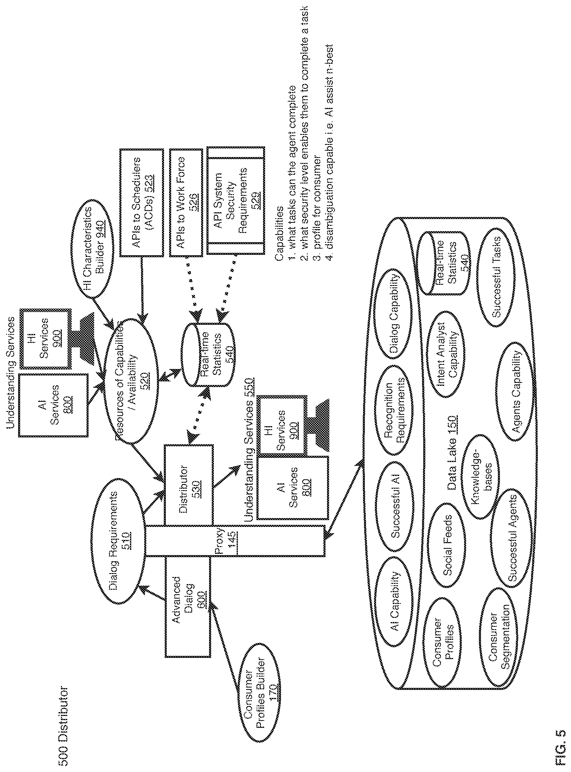 (3) Task Collect Phone Number to search (4) Task Collect Alternate Phone Number which also uses (3). By breaking down the agent conversation, these tasks may be added into the tasks 640 that AI performs, since the task is already understood by the AI system, in a dialog component 457, to enter a phone number. The system may also have an API to the customer system that enables it to post data it collects or learns to collect to the customer system. An example of configuration data can be as simple as defining the company name, where the first prompt of the system may be composed of code that supports prompting for literal text, followed by any amount of variable data items, followed by more literal text. For instance, the prompt may be “welcome to”+<ABC Company>+“how can I help you?”, where <ABC Company> represents a variable data item that may be filled with a company name. If a dialog component lacks the required data to execute (e.g., it lacks a value for <ABC Company>), the system can use HI to converse with the consumer while collecting data to configure the task 640. The matching is done through understanding the workflow of the scripts, their options, data that is collected by the agent, collection logs with time stamps, etc. For example, if there is no script which allows for both searching for rewards by phone number and adding an alternate number into the system, the system knows the agent steps: (1) the data that was collected, using “search” for rewards by phone number, then step (2) data collection of the alternate phone number, these two tasks, which the agent performed were manually entered, as part of the agent script, entering the alternate phone number. The data map 180 maps data from company syntax and semantics to system syntax and semantics. The data that is collected in the workflow forms 420 is mapped into the system data and forms, which enables the system to match application frameworks to the company workflow. The system workflow is represented and displayed to the company in a GUI 185 using company syntax and semantics. The company can select application frameworks 450 that best represent the company's industry and customer care applications. This selection allows the system to match the company's applications. The company configures, customizes, and adjusts the standard dialog components 457 and business rules 700, and adds dialog components if required. The company has the ability to build new application frameworks. Dialog components can be overridden or augmented by the company. The system enables on-going adjustments and additions to application frameworks 450, dialog managers 453, and dialog components, 457, (parts of the application 605 within the system which are needed to perform various functions and tasks including and not limited to dialog managers, function managers, task managers, tasks, AI, ASR, Natural Language Understanding (NLU), Text to Speech (TTS), Natural Language Generation (NLG), Machine Learning (ML), recorded audio, text, images, hand gestures, image recognition, etc. For example, entry of a reservation “from” date, a reservation “to” date, a hotel property, number of rooms, number of guests, payment and reward information, or other properties need not be programmed into the system, but could be understood through Workflow—Script Analysis decomposition 410 and analysis of data entry forms (data entered by the agent) 420, and then automated by matching the tasks and task organization to existing application frameworks 450 for reservations. Using the best fit method, the framework with the script is matched, and in turn is used by advanced dialog 600 to produce a reservation dialog, which in turn could be manually tested, or tested by running actual “conversations” from the data lake 150 through the system and comparing HI results to AI results data. An application 605 which executes within the system can comprise one or more dialog managers 610, each dialog manager managing a major function of the system. For example, the application for hotels—which can contain major functions of reservations, rewards, concierge services, or housekeeping, as some non-limiting examples—could have dialog managers 610 to manage each major function. Each of these functions in turn could have function managers 620, which focus on the function of reservations, for example. The function managers 620 in turn could have one or more task managers 630, such as hotel look-up. The task manager could likewise have one or more manager tasks 640 that it manages, such as city look-up, property look-up, or property selection. A reservation may be decomposed into tasks 640, such as entry of reservation dates, searching for a hotel location or a flight, or booking a seat or a room, as examples of some tasks and of their task sequencing. These tasks are organized by the task manager 630 as multiple functional steps associated with a reservation. The system reservations application framework 450 can be used for various industries, such as plane reservations, hotel reservations, cruise reservations, and car reservations, as some non-limiting examples. The framework gives the advanced dialog 600 executable structure, where the task decomposition gives the advanced dialog the data (including forms to fill) to complete the service interaction. Advantageously, this method of structuring a system can significantly reduce the need for programming and testing dialogs, though companies may of course still augment the default frameworks, configure the frameworks, and adjust the dialogs where needed. This is due to the fact that most changes are data changes and not code additions. As a result, only verification of configuration of the data need be performed, not execution of the system, which is predefined in the application frameworks. Well-defined, reviewed, and approved company agent scripts with data entry forms thus serve as input to the dialog syste