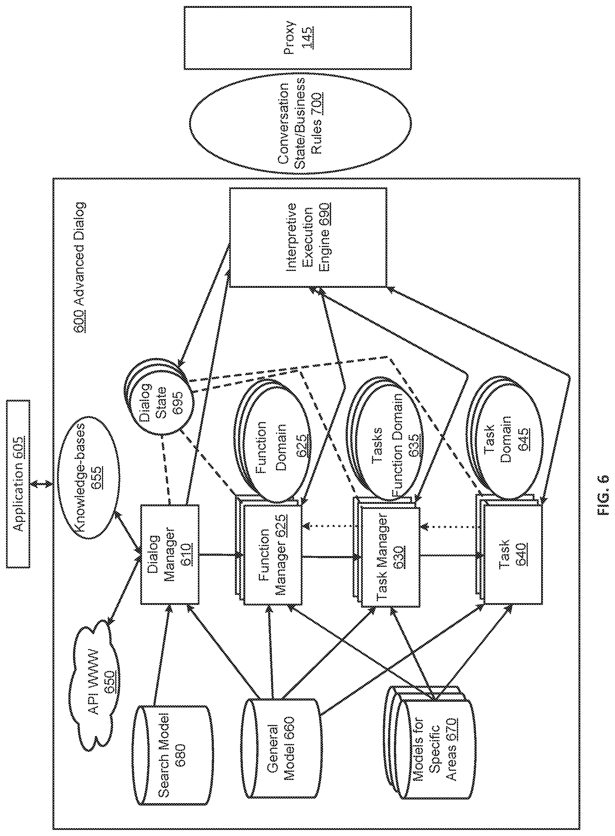 For the purpose of the use case we will focus on Reservations and Rewards. Note from the above information and associated “agent” scripts from the customer, the workflow information can be consumed from the API 166. Analyzing the agent scripts and the associated screens 410, and the data map 180—which maps customer-specific names like “bonjour number” to the generic system name “reward number”—the data entry screens, hotel look-up, booking, and payment, can be analyzed into discrete tasks 420 with the associated scripts used by the agent. An application framework for hospitality, which would be defined into the system, which may have 2 or three frameworks depending on the “property characteristics”, would have an existing hotel reservation framework, with dialog managers and components. The organization flow of the customer system may not be defined in the system. That is, there may be no relationship in the software of the flow of control of the company system, but the agent performs the flow of control because they are trained in the company system. The flow of control could also be discovered from the logging of the transactions, date and time of data entry, into the database, for example in the use case below, the log is look-up of ANI (caller ID), no match, identify user, hotel search, etc. Analyzing the log information of company system, enables the workflow analysis to decompose the customer system into tasks, and then match these tasks to the template, which is organized in the system. This is all done prior to runtime, and can be updated with new workflows from the customer system. Business rules 700 may not be available at time of workflow script analysis 400, and may require data entry by 185, default rules are established in the frameworks. During execution, the new system has the execution flow and business rules in the advanced dialog 600. The definition of the application and the advanced dialog is in the framework provided in the system 450. Execution happens upon events such as the arrival of an email, the posting of a social post, the receipt of a phone call, etc. With identification of the consumer or user, the event themselves, use the state information 695 to either start the dialog or to pick up from previous state. State preservation can be company-defined. For example, a reservation conversation that is partially completed may be open for 1 week, unless the date of the reservation is past. Principles similar to those for Web, Mobile, and Text apply to voice calls when calling a hotel 800 number. The main number may respond to the inquiry with a prompt such as, “Welcome to <hotel name>. How can I help you?” This part of the dialog would be in a function call greeting. The desktop of the agent would have a script with a variety of system screens and data entry tasks. The following identifies the system screens and possible logic for one example in the hotel industry: System: “Welcome to <name>hotel.”