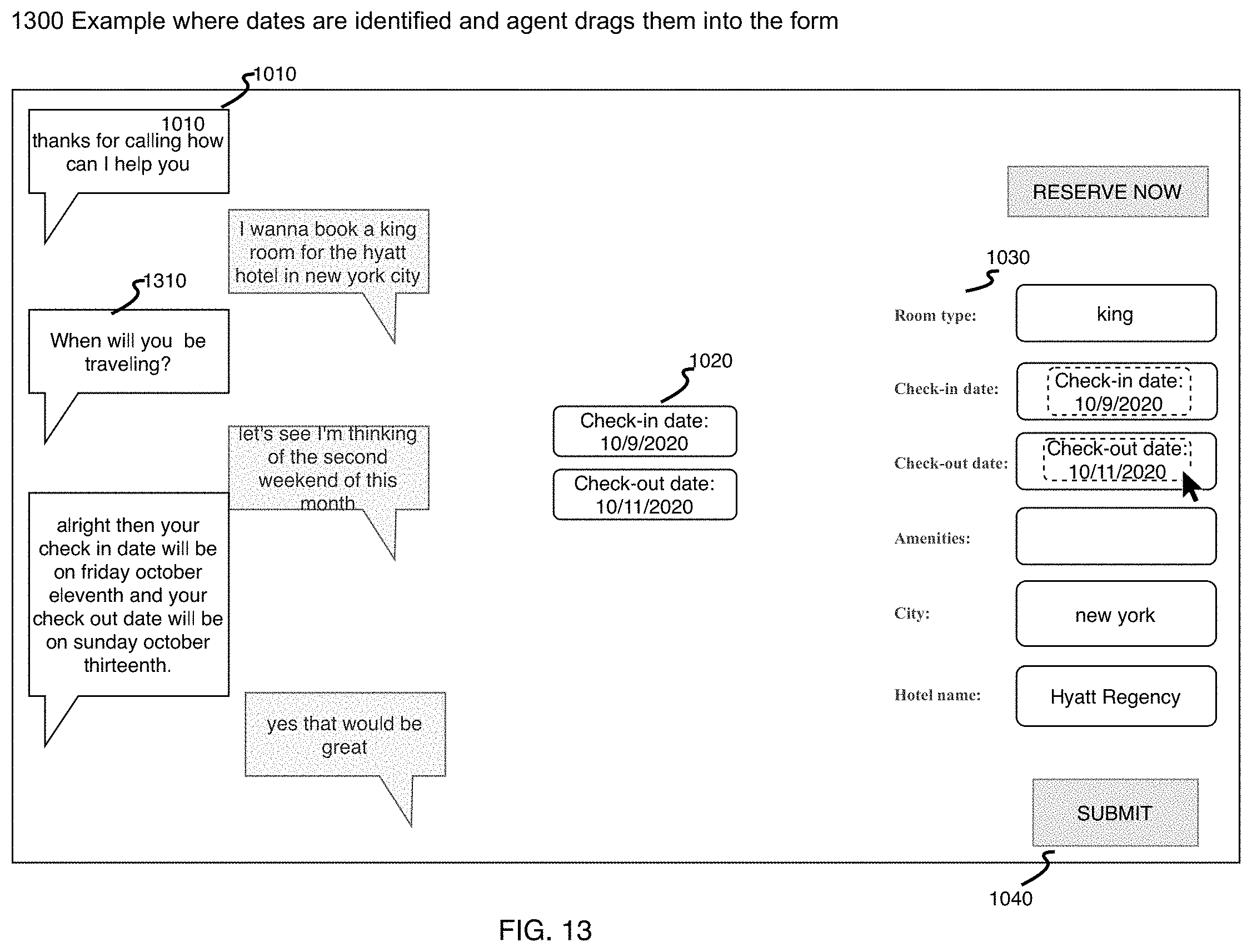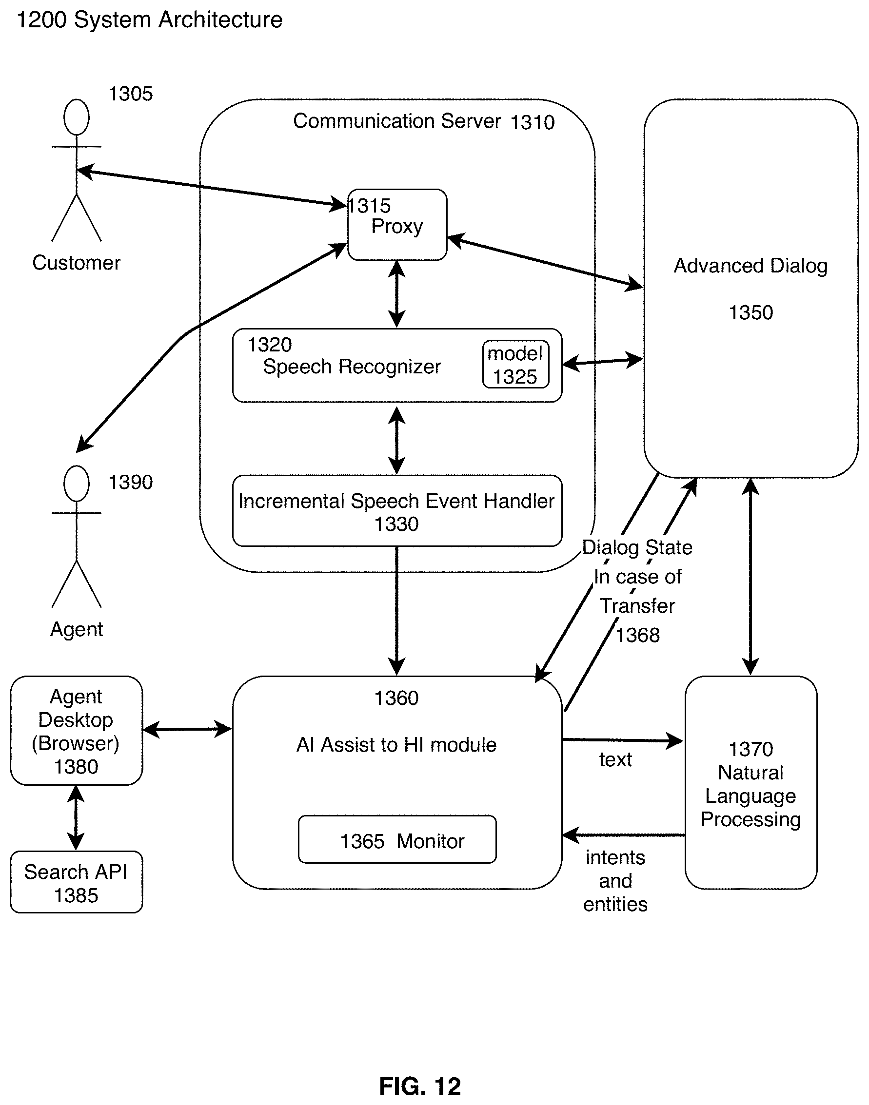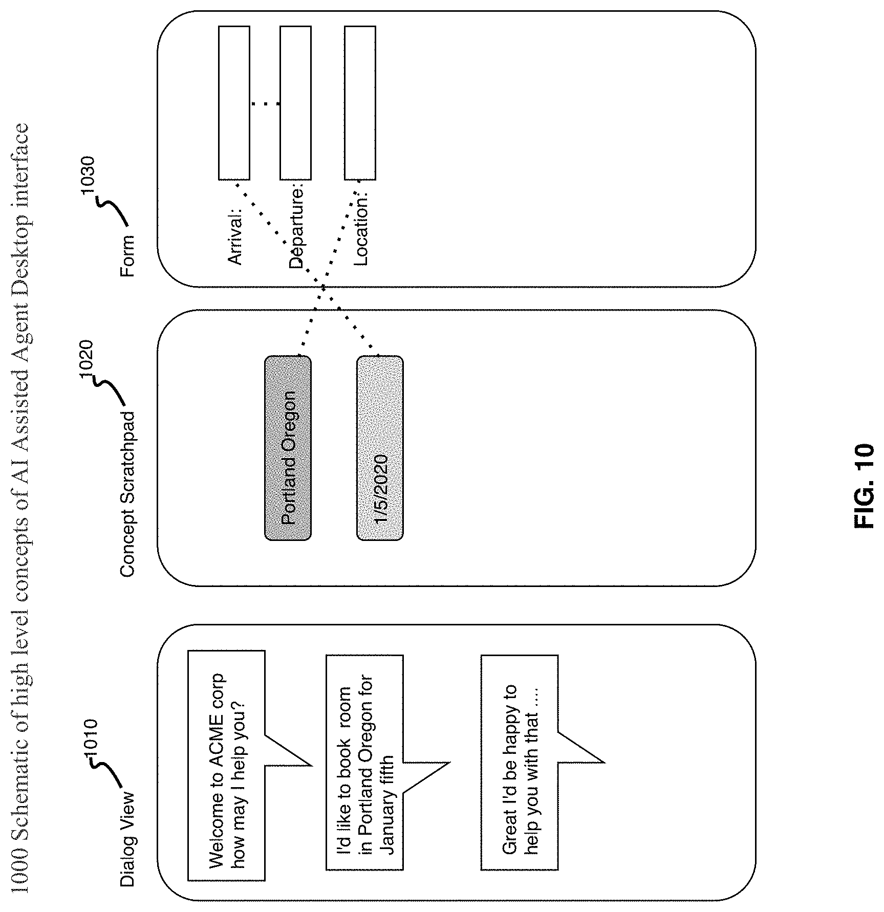 In some embodiments, AI Assist to HI module 1360 provides support to a human agent when interacting with a customer or other user. The AI Assist to HI module 1360 “listens in” in real time on the conversation between customer and agent, recognizes what is being communicated, tracks the conversation, and represents recognized information as objects in a graphical user interface (hereinafter “agent desktop interface”) that can be used to accelerate the process of accomplishing the customer's objective for the conversation. (The term “workflow objective,” as used herein, refers to the goal of the current workflow for the customer's objective. For example, if the customer has the objective of booking a hotel room, the workflow objective might be to fill in the pertinent information about the desired hotel stay into a form that will enable the system to send a booking request to a hotel's booking system.) This includes easing the burden of agents filling in pertinent forms, such as by pre-populating results within the agent desktop interface where there is sufficient confidence in those results. For example, in some embodiments, key concepts that the customer mentions during the conversation appear as visual elements in a scratchpad user interface that the agent can choose to drag and drop into forms and workflows. Thus, in addition to providing an incremental and persistent presentation of the conversation as it unfolds, in some embodiments the agent desktop interface presents concepts that arise in the conversation as actionable “concept bubbles” that can be manipulated in order to assist and accelerate the agent's use of underlying information and workflow systems. The AI Assist to HI module 1360 presents the spoken dialog (or chat) as it unfolds, including incremental presentation of ASR and Natural Language results. In either case, the spoken or chat dialog appears in the user interface as if it were a chat. Natural language and dialog analysis are used to identify key concepts and turn them into graphical elements that the agent can act on (e.g., via a live scratchpad for concepts from the conversation). For example, instead of trying to type what the customers say, the agents can drag and drop key concepts from the ‘listening in’ AI analysis and use those concepts to fill forms or otherwise advance their workflow. AI capabilities can ‘listen in’ on the communication and assist the agent in real-time through a graphical user interface (agent desktop). In some embodiments, in addition to identifying actionable concepts from the customer's speech, the system also tracks the state of the dialog and provides hints to the agent regarding the agent's next statement in the conversation. For example, in the use case of The key components and their connections in order to enable the above user experience are now described. The communication server 1310 allows utterances to flow freely between a customer 1305 and an agent 1390, but also allows the agent assistance module to “listen in” on the conversation. In some embodiments the customer and the agent are connected together, through the telephony audio streams, based on a SIP (Session Initiation Protocol) connection. SIP is the regular protocol for multimedia communication sessions in applications of voice and video calls, IP telephony, and mobile phone calling over LTE. The communication server connects these two streams for text or audio for the agent and for the customer via a proxy 1315. A speech recognizer 1320 is used to convert the audio signal to a text transcript. The speech recognizer 1320 operates incrementally in that it generates text of partial hypotheses over time. These are handled by an incremental event handler 1330, which passes incremental updates to the AI Assist to HI module 1360. In some embodiments, the customer's interactions begin with an automated system, and in cases of low confidence, or where business rules dictate, the automated system delegates to or transfers control to the agent 1390. In these cases the agent desktop interface is used to present the current state of the conversation to the agent, and in some cases to provide graphical representations (e.g., the concept bubbles of In some embodiments the customer 1305 begins the communication interacting with an advanced dialog 1350, and in cases of low confidence or where business rules dictate, the system maintains control of the conversation but presents the state of the conversation to a human agent 1390, who can use the agent desktop interface to accept or correct the system's interpretation and then enable the automated system to continue its interaction with the customer. In order to avoid detracting from the customer experience, the system should be able to listen in on the utterances between customer and agent without adding perceptible latency. Updates to the agent desktop interface need to be rapid in order to avoid impacting the customer experience. The system may use dual websocket connections or other bidirectional protocols to send events among the different components (e.g., ASR 1320, 1 NLP 1370, agent desktop browser 1380, and AI Assist to the HI module 1360). The AI Assist to HI module 1360 acts not only to coordinate the events from all the active players and components, but also to monitor, 1365, and further to store, log, and present real-time analytics and future data for analysis. Moreover, the utterances in each stream are divided into tentative (hypothesized) portions of an utterance and completed (finalized) portions of an utterance, based on measures from ASR and/or NL. An Incremental Speech Event Handler component 1330 for audio events separates the stream of audio events by speaker and based on the timestamps associated with new tentative portions of an utterance and what is marked as complete, updates the utterance text to be shown in the visualization of the conversation. The Incremental Speech Event Hand