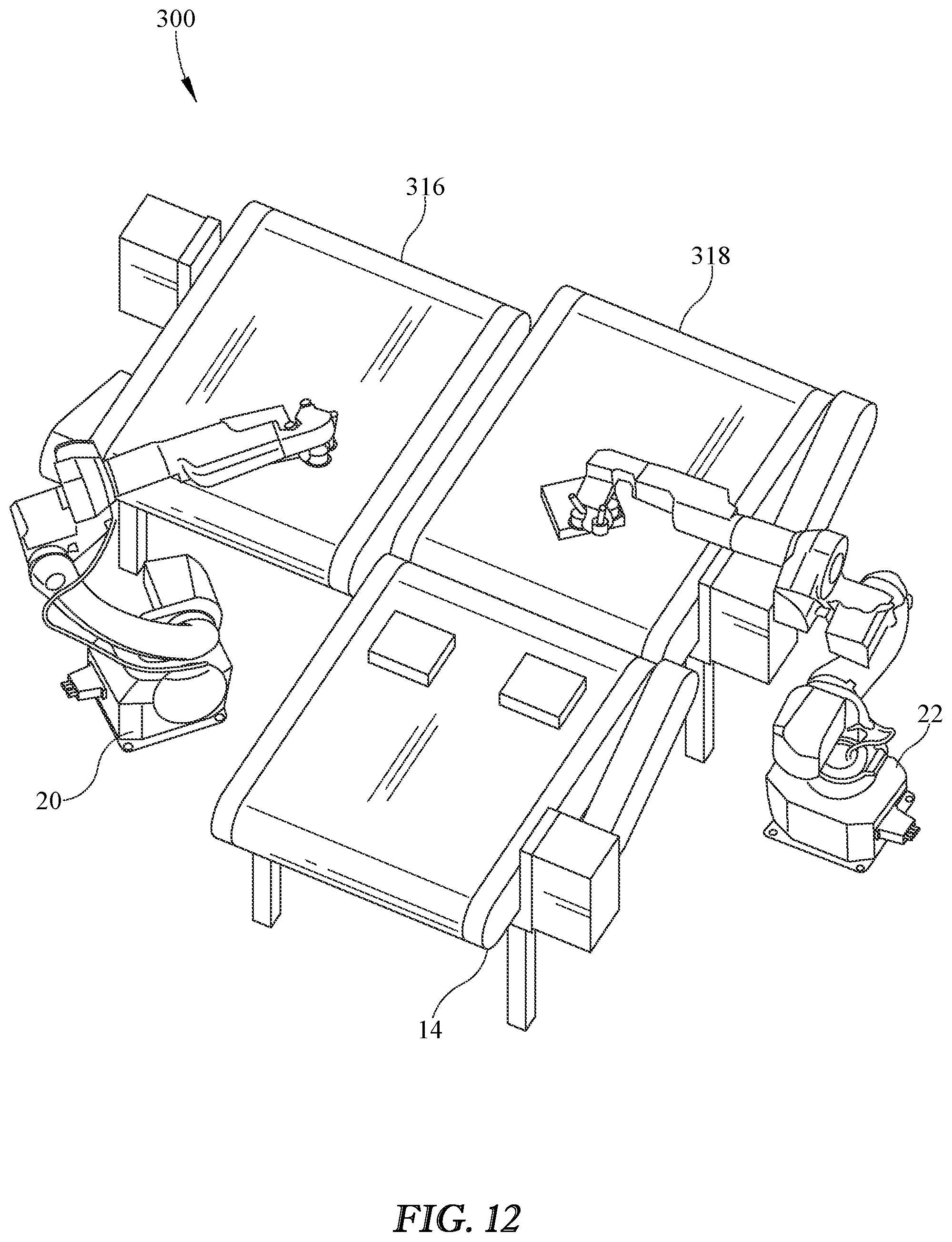 [0085]Referring now to FIG. 12, this conveyor system 300 (or system 300) includes the pick conveyor 14, the first robot 20, and the second robot 22. Unlike the system 10 described above with reference to FIGS. 1 and 2, however, the place conveyor in this system 300 is defined by, and thus can be characterized as including, multiple conveyors. Specifically, in this exemplary embodiment, the place conveyor of the system 300 includes: a first place conveyor 316, which receives parcels from the first robot 20; and a second place conveyor 318, which receives parcels from the second robot 22 and is positioned in side-by-side relation to the first place conveyor 316. By virtue of the first robot 20 and the second robot 22 delivering parcels to separate conveyors, the parcel transfer rate from the pick conveyor 14 is further increased as two separate parcels can be transferred (one by the first robot 20 and the other by the second robot 22) simultaneously or close temporal proximity without risk of the two parcels becoming stacked on top of each other or otherwise positioned in a non-singulated manner. Furthermore, unlike the system 10 described above with reference to FIGS. 1 and 2, in this system 300, the first robot 20 and the second robot 22 are mounted to a ground surface in an upright instead of inverted position.