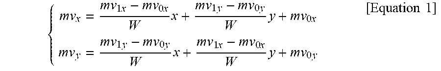 In the above equation, Δv(i, j) denotes a difference between a pixel motion vector (pixel MV, v(i, j)) calculated at a sample position (i, j) and a sub-block MV of a sub-block, to which a sample (i, j) belongs. In the example shown in Affine model parameters and pixel positions from the center of the sub-block are not changed. Accordingly, Δv(i, j) may be calculated only for a first sub-block and may be reused for the other sub-blocks in the same CU. Assuming that a horizontal offset and a vertical offset from the pixel position to the center of the sub-block are respectively x and y, Δv(x, y) may be derived as follows. In the above, (v0x, v0y), (v1x, v1y) and (v2x, v2y) respectively correspond to a top-left CPMV, a top-right CPMV and a bottom-left CPMV, and w and h respectively denote the width and height of the CU. Step 4) Finally, a final prediction block I′(i, j) may be generated based on the calculated luma prediction refinement ΔI(i, j) and the predicted sub-block I(i, j). For example, a final prediction block I′ may be generated as follows.