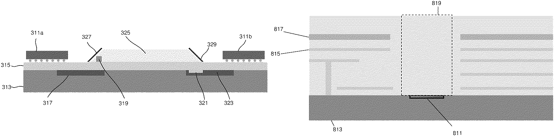 a first semiconductor substrate containing transistors; a first stack of interconnect layers on top of the first semiconductor substrate, the interconnect layers including alternating metal and dielectric layers; a microLED on a pad on the first stack of interconnect layers, with at least one electrical connection coupling the pad and at least one transistor of the semiconductor substrate; a second semiconductor substrate containing transistors; a second stack of interconnect layers on top of the second semiconductor substrate, the interconnect layers including alternating metal and dielectric layers; a photodetector integrated in the second semiconductor substrate, with a light passageway to the photodetector through the second stack of interconnect layers; and a waveguide configured to couple light from the microLED to the light passageway to the photodetector through the second stack of interconnect layers. 11. The optical interconnect of 12. The optical interconnect of 13. The optical interconnect of 14. The optical interconnect of a further substrate, the further substrate positioned over the microLED; with the waveguide on the further substrate, the waveguide positioned to receive light from the microLED.