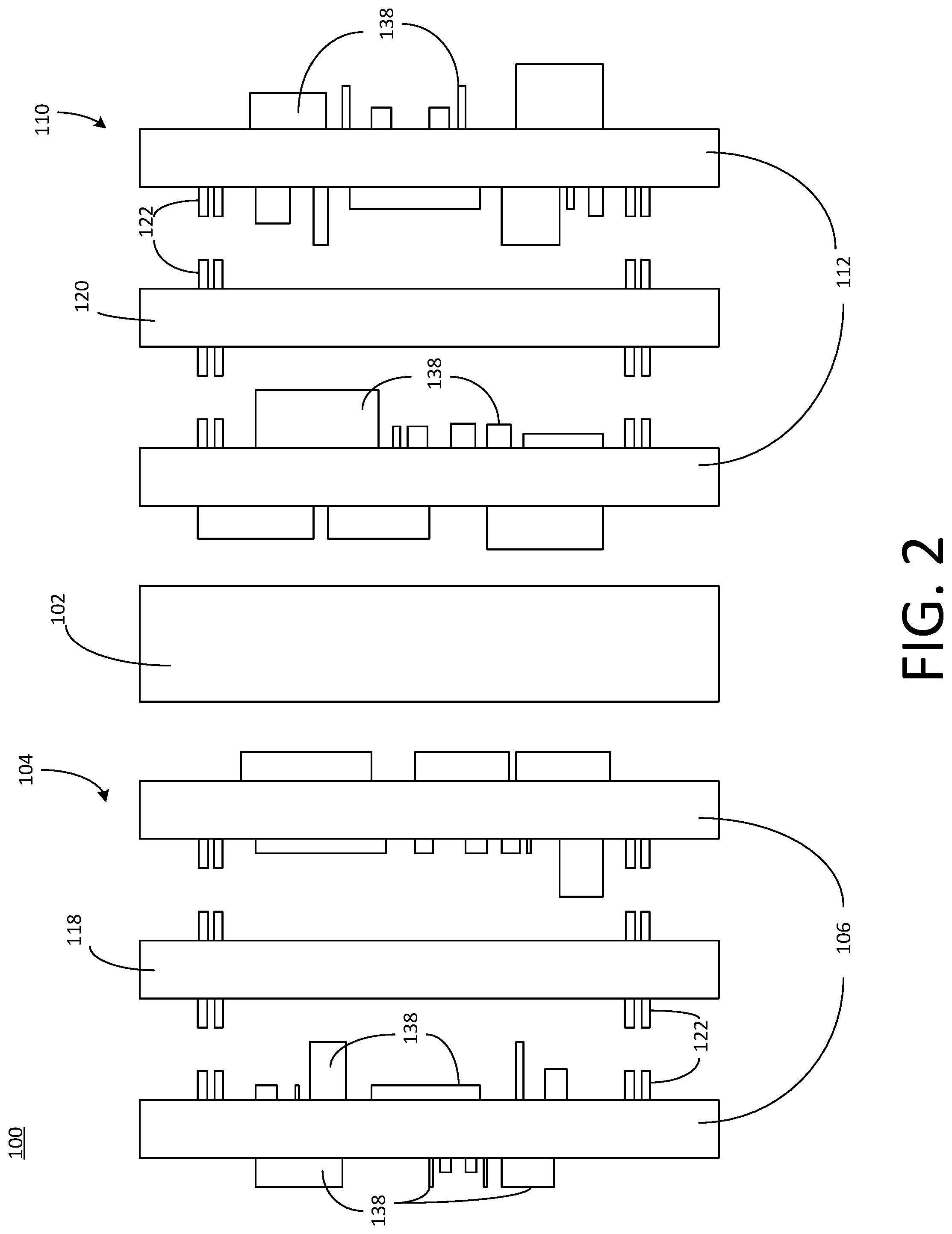 a heat spreader comprising a first side and a second side, the second side being opposite the first side, a first printed circuit board coupled to the first side of the heat spreader; a second printed circuit board separate from the first printed circuit board; one or more complementary elements coupled to the second side of the heat spreader; and an interposer located at the first side of the heat spreader and interposed between the first printed circuit board and the second printed circuit board, wherein the interposer includes a frame having one or more openings disposed within an interior of the interposer. 20. The computing device of