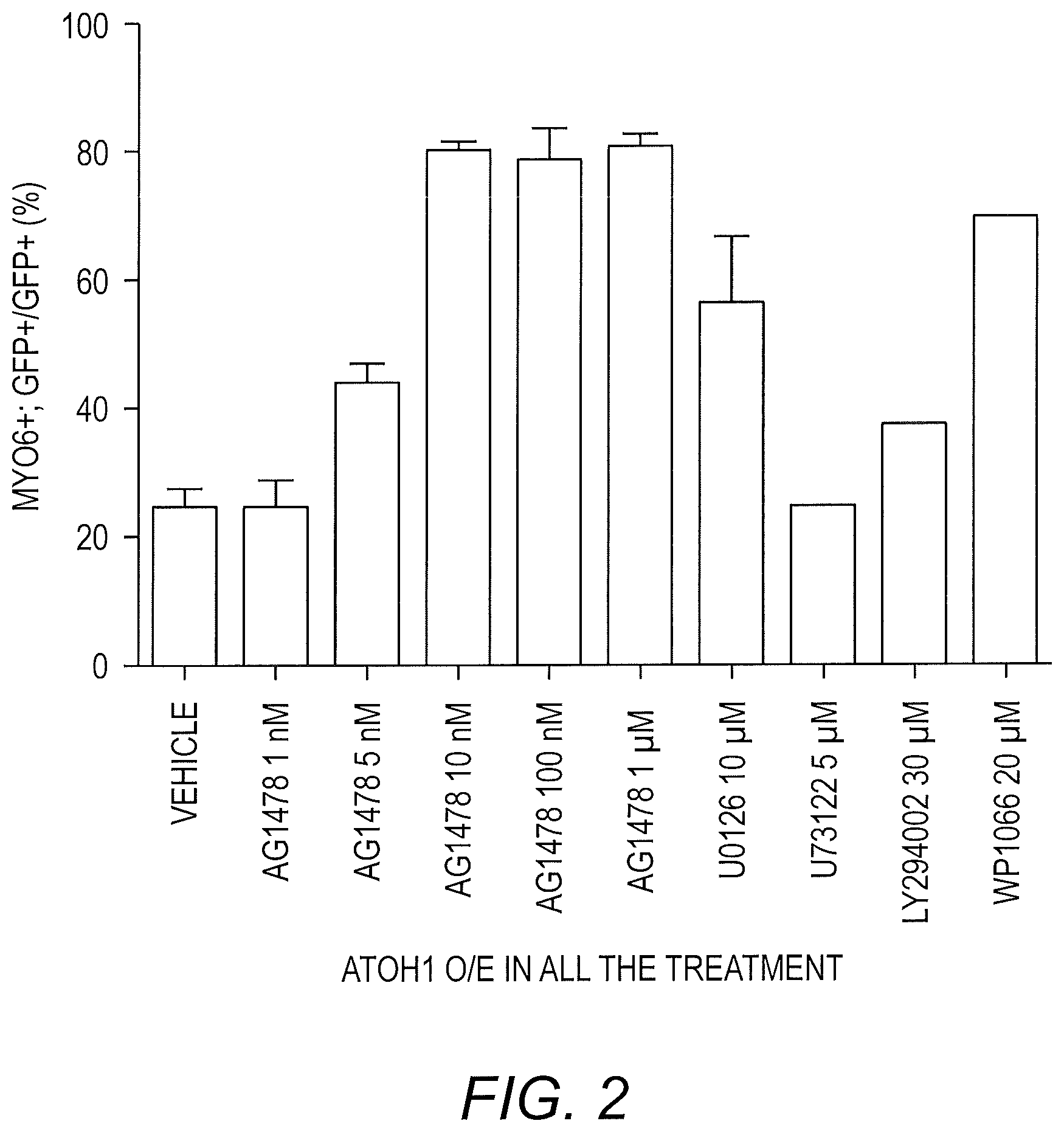 Atoh1, a transcription factor, can convert non-sensory supporting cells (SCs) to hair cells (HCs) in neonatal and juvenile mammalian cochleae (Izumikawa, et al. (2005) Nature Med. 11:271-6; Kelly, et al. (2012) J. Neurosci. 32:6699-710; Liu, et al. (2012) J. Neurosci. 32:6600-10). Ectopic expression of Atoh1 has been approved for clinical trials as a gene therapy. However, Atoh1-induced HC conversion is inefficient (<17%), incomplete (lacking mature HC markers), and age-dependent (no response in adult cochlea) (Izumikawa, et al. (2008) Hearing Res. 240:52-6; Liu, et al. (2012) J. Neurosci. 32:6600-10). Using RNA-seq analysis to compare the transcriptome of SCs, endogenous outer HCs (OHCS), and Atoh1-induced HCs (cHCs) in adult mouse cochleae, it was observed that the epidermal growth factor receptor (EGFR) signaling is enriched in SCs and cHCs using gene set enrichment analysis (GSEA). To validate the role of EGFR pathway ex vivo, neonatal mouse cochlear explants were treated with a potent EGFR inhibitor (AG1478). This analysis indicated that, by itself, AG1478 had no impact on the proliferation and differentiation of endogenous SCs and HCs after 7 days. However, when AG1478 was combined Atoh1, there was a significant increase in Atoh1-induced HC conversion from explant SCs (from 24.7% to 80.6%; FIGS. 1A-1D). In addition, inhibitors targeting proteins downstream of EGFR signaling were tested including WP1066 (STAT3 inhibitor), LY 294002 (PI3K inhibitor), U0126 (MEK inhibitor), and U73122 (PLC inhibitor) at various doses above their respective EC50values. With the exception of PLC inhibition, a similar enhancement of conversion rate of Atoh1-induced HCs was observed (FIG. 2). This analysis indicates that EGFR signaling pathways play novel roles in SC conversion to HCs. While known to be important in development (Doetzlhofer, et al. (2004) Dev. Biol. 272:432-47; Yamashita & Oesterle (1995) Proc. Natl. Acad. Sci. USA 92:3152-5), EGFR signaling has not previously been implicated in HC regeneration.