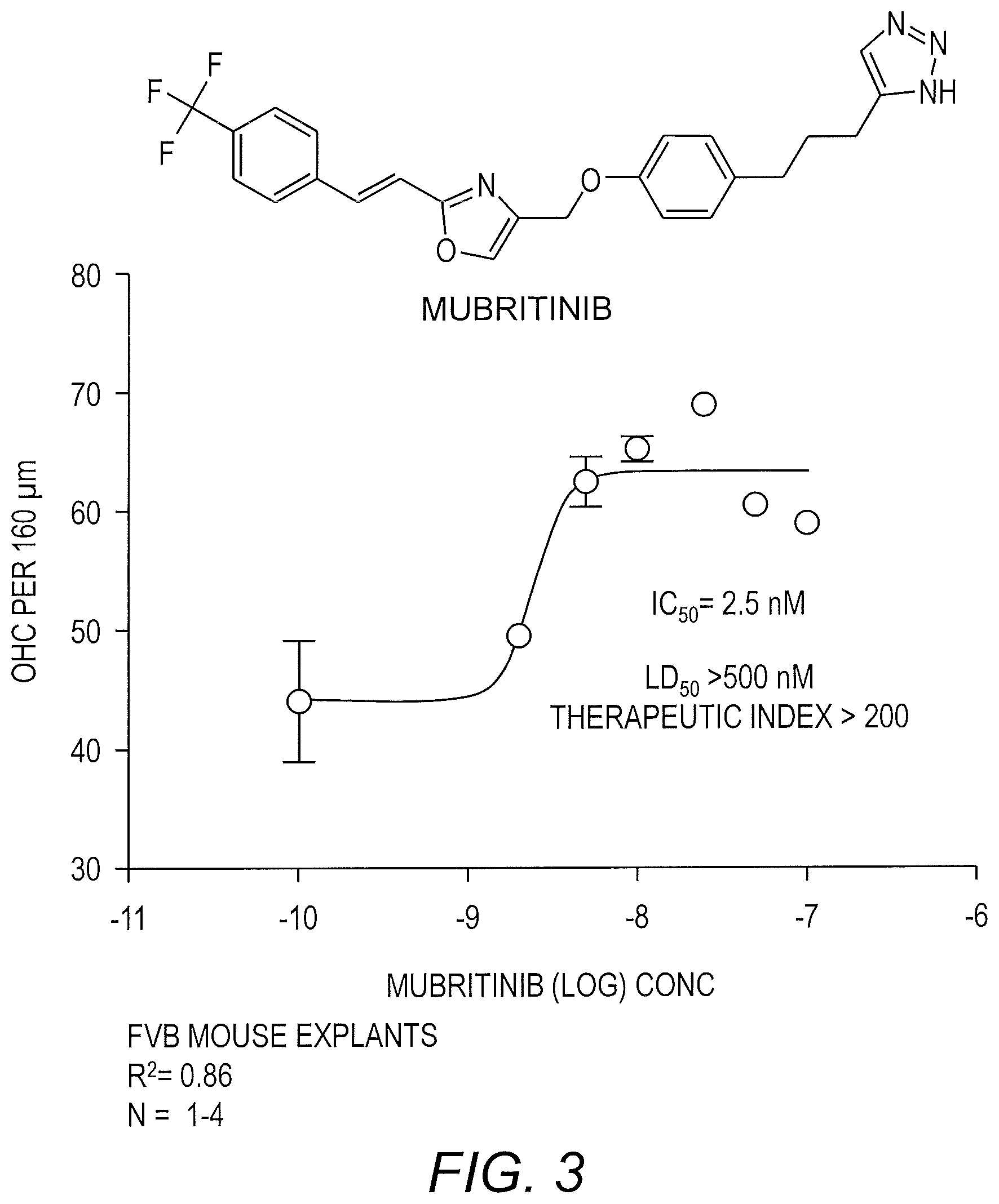 FIG. 3 shows that the EGFR inhibitor MUBRITINIB (whose structure is shown) protects against cisplatin-induced hair cell loss in mouse cochlear explants with IC50of 2.5 nM and LD50of >500 nM (Therapeutic Index of >200). Number of explants: 1-4 at each dose; FVB cochlear explants with 150 μM cisplatin treatment and middle turns were analyzed; curve fitting with R2of 0.86. Note that IC50values of MUBRITINIB were consistent in all assays demonstrating its specificity and potency.