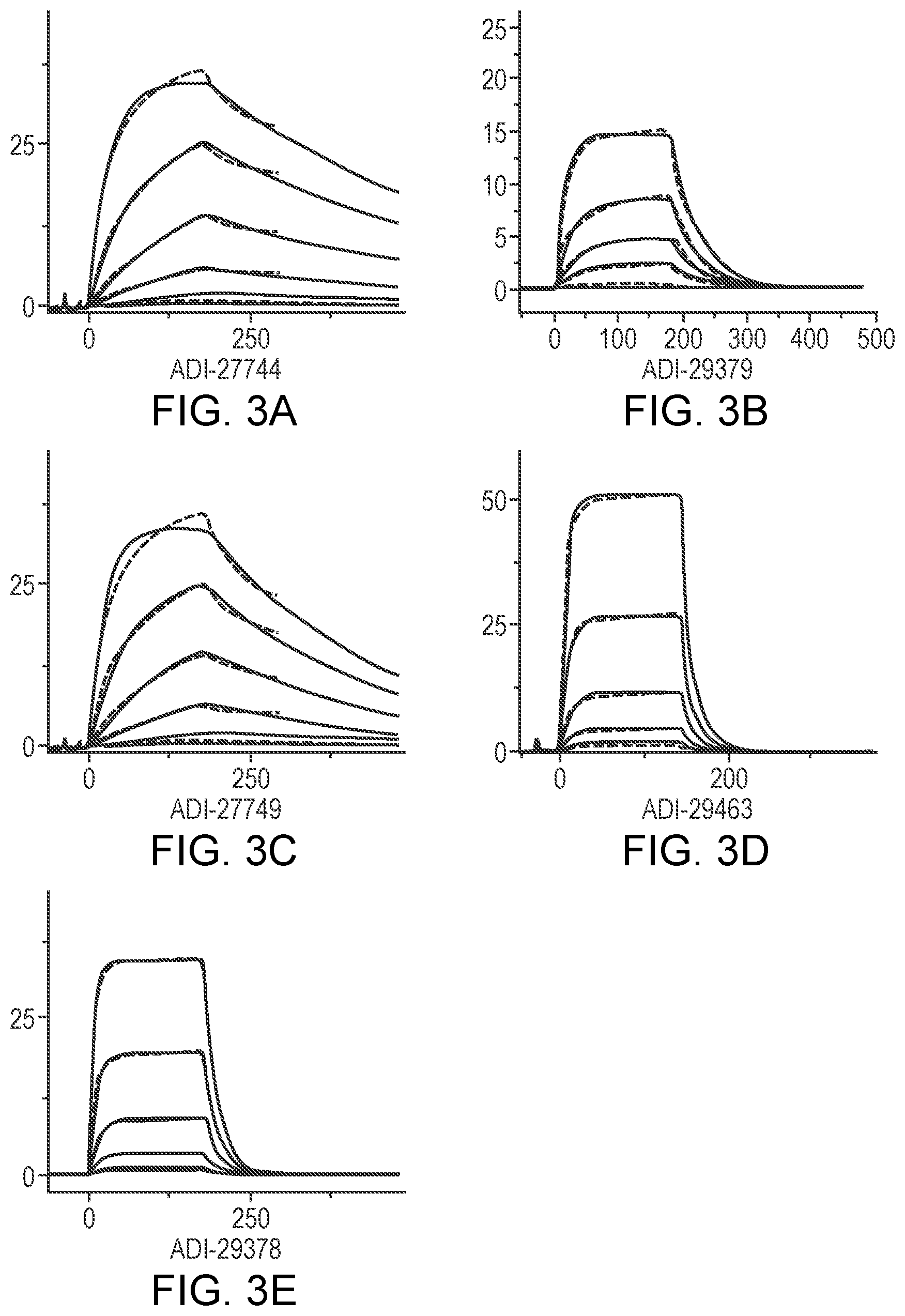ADI-27744 (A44) 2.95E+05 2.99E−03 10.1 ADI-27749 (A49) 3.95E+05 4.89E−03 12.4 ADI-29378 (E78) 8.32E+05 4.87E−02 58.5 ADI-29379 (E79) 4.43E+05 2.25E−02 50.7 ADI-29463 (F63) 1.64E+06 1.01E−01 61.8 Example 2—Binding Epitope Binning of ADI-27744 Clone