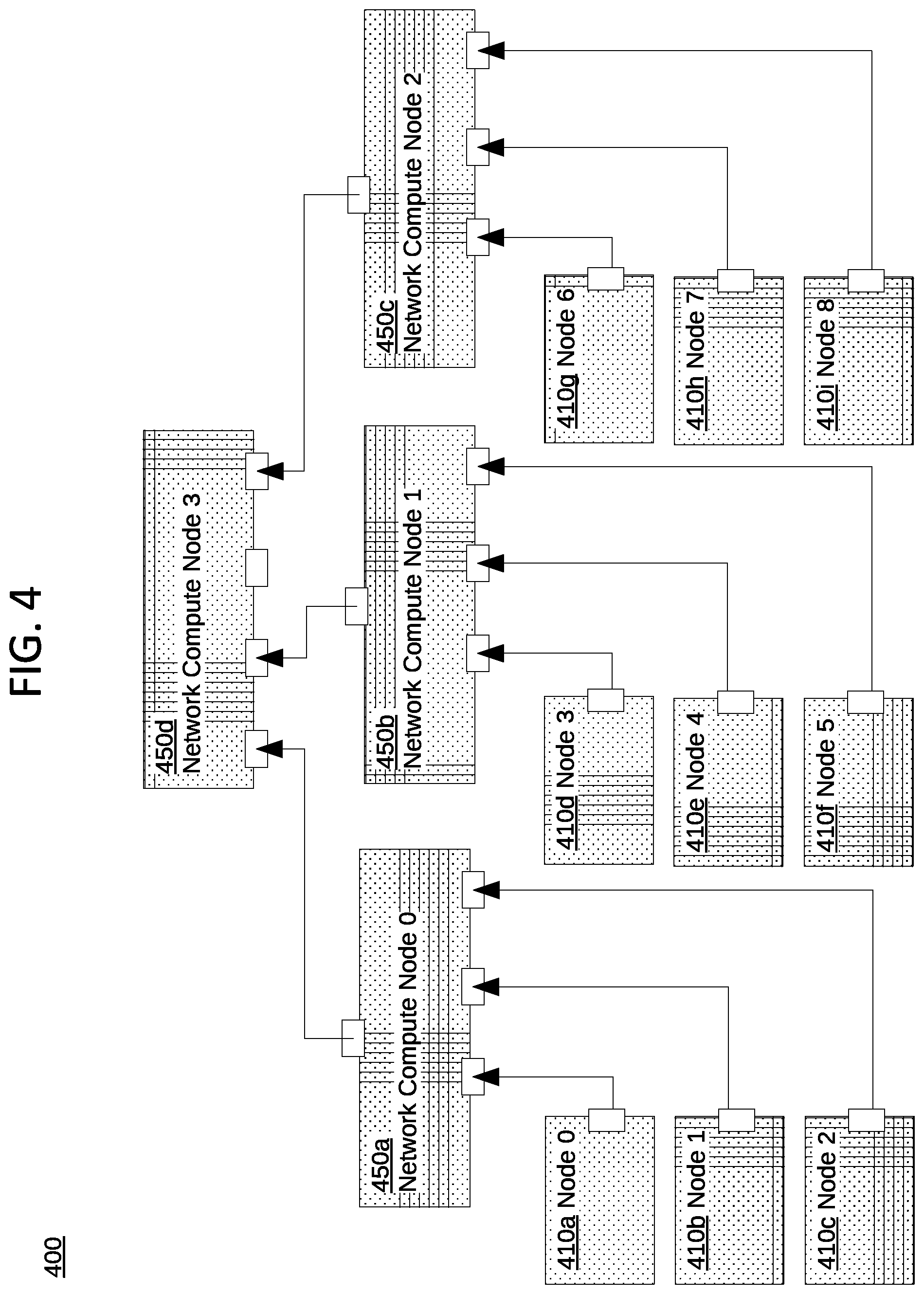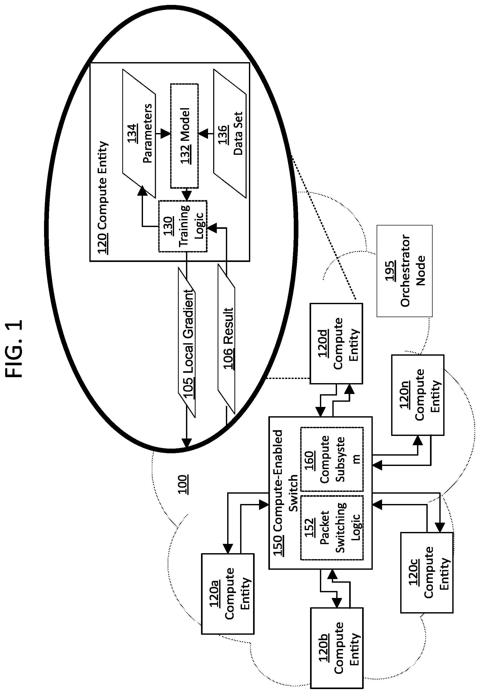 This application is a Continuation of U.S. patent application Ser. No. 17/200,463 filed on Mar. 12, 2021, the contents of which are incorporated herein by reference in their entireties. The applicant(s) hereby rescind any disclaimer of claim scope in the parent application(s) or the prosecution history thereof and advise the USPTO that the claims in this application may be broader than any claim in the parent application(s). This application is related to: U.S. patent application Ser. No. 16/409,695, filed on May 10, 2019, entitled “Network Switch with Integrated Compute Subsystem for Distributed Artificial Intelligence and Other Applications,” by Matthews, et al.; U.S. patent application Ser. No. 16/409,699, filed on May 10, 2019, entitled “Egress-Based Compute Architecture for Network Switches in Distributed Artificial Intelligence and Other Applications,” by Matthews, et al.; U.S. patent application Ser. No. 16/409,701, filed on May 10, 2019, entitled “Parallelized Ingress Compute Architecture for Network Switches in Distributed Artificial Intelligence and Other Applications,” by Matthews, et al.; U.S. patent application Ser. No. 16/409,703, filed on May 10, 2019, entitled “Network Switch with Integrated Gradient Aggregation for Distributed Machine Learning,” by Matthews, et al.; and U.S. patent application Ser. No. 16/552,938, filed on Aug. 27, 2019, entitled “Distributed Artificial Intelligence Extension Modules For Network Switches,” by Matthews, et al. The entire contents of each of these applications are hereby incorporated by reference for all purposes as if fully set forth herein. Embodiments relate generally to distributed computing systems, and, more specifically, to network switch-based architectures for distributed machine learning systems and other applications. The approaches described in this section are approaches that could be pursued, but not necessarily approaches that have been previously conceived or pursued. Therefore, unless otherwise indicated, it should not be assumed that any of the approaches described in this section qualify as prior art merely by virtue of their inclusion in this section. Computationally-intense applications in computing systems can often be implemented by dividing the applications into distinct tasks that can be performed in parallel, and distributing those tasks amongst a number of computing devices. These computing devices are typically interconnected by a communications network via which they share data related to the computations, and are said to form a distributed computing system. Distributed computing systems may be used in a large variety of complex computing applications, such as, without limitation, simulations, language translation, image recognition, fraud detection, and so forth, as well as emerging applications. For example, machine learning algorithms, and deep learning algorithms in particular, are commonly used to create computational models that perform mission critical computing functions. Such models may involve oft-complex series of calculations that input and process a set of values (often referred to as an input vector or feature vector) to generate an output value or values. The output value(s) generally classify the input vector in some manner. For instance, the output of a model used for image recognition might classify an input vector of pixels, image attributes, or other image data as being either a dog or cat, depending on the purpose of the neural network. A model may include a variety of parameters, such as weights, biases, coefficients, support vectors, and so forth, that affect how the input values are processed and how the output value(s) are calculated. Example types of models may include, without limitation, neural networks or belief networks, which pass input values through one or more layers of interconnected nodes (referred to herein as “neurons”). Each neuron of a neural network accepts one or more inputs from the input vector and/or other neurons. These inputs form the connections of the neural network. Each neuron is associated with an output function that computes the value output from the neuron based on the inputs to the neuron. The connections may be assigned weights. The weight of a connection, generally speaking, controls how heavily the input associated with that connection factors into the output function. For instance, a neuron might have an input p0 with a weight of 0.4 and an input p1 with a weight of 0.2. The value of the input p0 may therefore more heavily impact the output of the neuron (e.g., in the case of a simple summation of the products of each input and their weights, twice as much). In some embodiments, the neurons may be organized into two or more layers, including an input layer wherein each neuron outputs a value of the input vector, zero or more intermediate layers in which each neuron inputs one or more values output by an immediately previous layer and then outputs values to one or more neurons of an immediately subsequent layer, and a final output layer that inputs values output by an immediately previous layer and outputs the results of the neural network. By carefully setting the weights and/or other parameters of a neural network or other model, the model may be configured to accurately or semi-accurately make classifications or other determinations based on input vectors. Suitable weights for a model configured to make a certain type of determination based on a certain type of data may be “learned” through various training algorithms. These training algorithms iteratively adjust the weights over time through a series of steps, including a forward pass, loss computation, and backward pass, until arriving at an “optimal” set of weights for the model, or until all training data has been processed. The forward pass through the model processes an input vector selected from a suitable set of vectors (e.g., a set of “training data”) usin