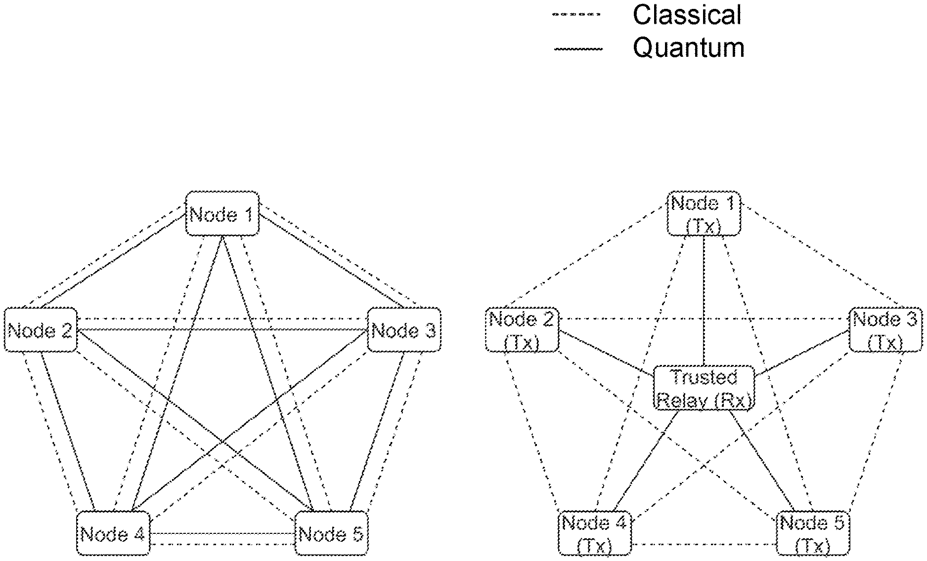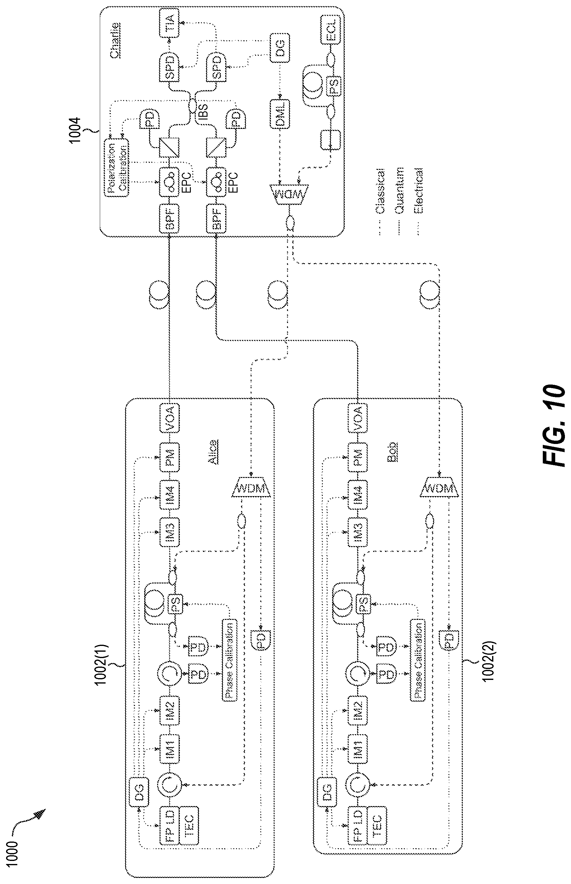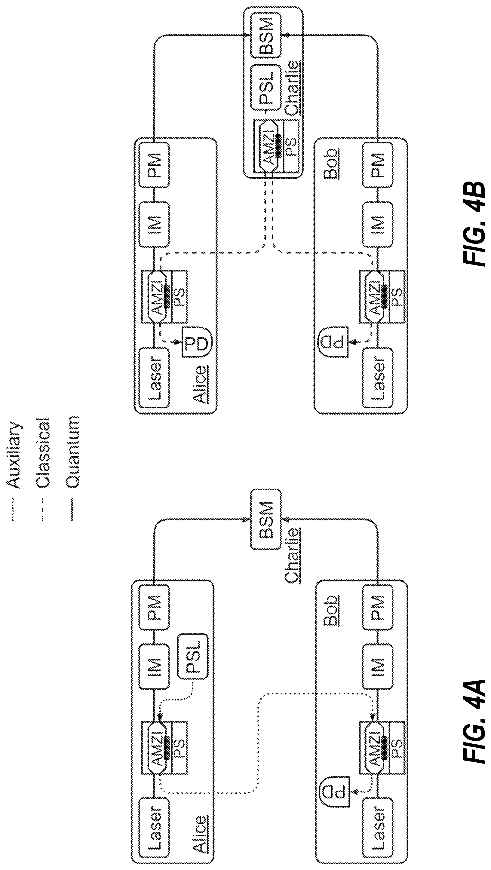 This application claims priority to U.S. Provisional Patent Application No. 63/036,015, titled “Scalable Polarization-Encoding Measurement-Device-Independent Quantum Key Distribution Network” and filed Jun. 8, 2020, and to U.S. Provisional Patent Application No. 63/055,493, titled “Scalable Time-Bin Phase Encoding Measurement-Device-Independent Quantum Key Distribution Network” and filed Jul. 23, 2020. Each of these applications is incorporated herein by reference in its entirety. In modern communications, access networks, both optical and wireless, are the most vulnerable segments of data security. Most eavesdropping takes place in access networks due to tree or star topologies where downstream data is broadcast to all users. An unintended user can easily probe a neighbors' downstream traffic without being noticed, get their MAC addresses and logic link identifications, and infer traffic type and amount. For example, in a passive optical network, the downstream multiple-point-control protocol message is broadcast to all users and reveals the upstream traffic characteristics of each user. Even worse, an eavesdropper can access the upstream data traffic of its neighbors via a reflection in the network. The situation in wireless access networks is worse since the air interface is open to the public. Cryptography is widely used in modern communication to protect three aspects of data security: confidentiality, integrity, and authentication. Confidentiality prevents the content of a message from being accessed by unintended recipients. Integrity protects a message from being modified during transmission. Authentication prevents spoofing attacks by verifying the identities of communication parties. All three aspects are protected by the data encryption. Modern cryptographic systems can be divided into two categories: symmetric and asymmetric. Asymmetric cryptography, also known as public cryptography, uses public and private keys for encryption, signature, and authentication. Symmetric cryptography, however, uses an identical key for the sender and receiver. Since symmetric cryptography has superior performance and is more robust against a quantum-computer attack, it has been widely used in modern communications. The most prevailing symmetric encryption method is the Advanced Encryption Standard. Since the security of a symmetric cryptographic system relies on the secrecy of its keys, key distribution becomes an important job, one which cannot be handled by symmetric cryptography itself. In today's communications, there is no absolutely secure way to deliver keys. Usually, it is handled by asymmetric cryptography in which the security of keys is protected by the computational complexity of intractable mathematical problems. There are several intractable math problems exploited by asymmetric cryptography, such as integer factorization for the RSA algorithm, the discrete logarithm for Diffie-Hellman key exchange, and the elliptic-curve discrete logarithm for elliptic-curve cryptography. Although intractable on classical computers, these problems can be solved in polynomial time on a quantum computer by Shor's algorithm. Accordingly, asymmetric cryptographic systems may be compromised by quantum computers and will therefore no longer be secure. Increasing the key length does not help since the required number of qubits scales linearly with key length. To address this challenge, quantum key distribution (QKD) is a promising technique for key distribution. Different from asymmetric cryptography, where keys are protected by complex math problems, QKD guarantees the security of keys by quantum mechanics and offers information-theoretic security, i.e., the keys cannot be broken even if an adversary has unlimited computing power. However, the absolute security offered by QKD is only guaranteed for ideal single-photon sources and detectors, which do not yet exist in practice. Such gaps between ideal and realistic devices create security loopholes which can be exploited via side-channel attacks. In a realistic QKD system, expensive and impractical single-photon sources are replaced by weak coherent pulses (WCP) whose imperfections may become the targets of side-channel attacks. For example, the photon number of a WCP follows a Poisson distribution. There always exist pulses containing more than one photon, which could be exploited by what is known as a photon-number-split attack. For example, if Alice blocks all single-photon pulses and divides all multi-photon pulses, keeping a half for herself and sending the other half to Bob, she will always have an identical copy of keys with Bob. To eliminate this loophole, decoy-state protocols were invented to vary photon number per pulse, so Alice's strategy of different blocking rates of single- and multi-photon pulses will be revealed. Another example is that an ideal single-photon source has random phase for each pulse, but the phase of WCPs is not truly random, which could become the target of an unambiguous-state-discrimination attack. This loophole is eliminated by using directly modulated lasers or phase modulators to actively randomize their phase. Additional security loopholes originate from imperfect detectors. For example, the time-shift attack exploits the efficiency mismatch between detectors, where Alice steals key information by shifting the qubit arrival time at Bob. The detector blinding attack exploits the after-gate pulses and dead time of avalanche detection of single-photon detectors. Measurement-device-independent QKD (MDI-QKD) protocols were developed to remove all loopholes at the detection side. In conventional prepare-and-measure QKD protocols, Alice prepares and sends quantum states to Bob, who measures the received states. In MDI-QKD, both Alice and Bob independently prepare random quantum states that they send to Charlie, a third party, for Bell-state measurement (BSM). Charlie publicly announces whether or not a BSM was suc