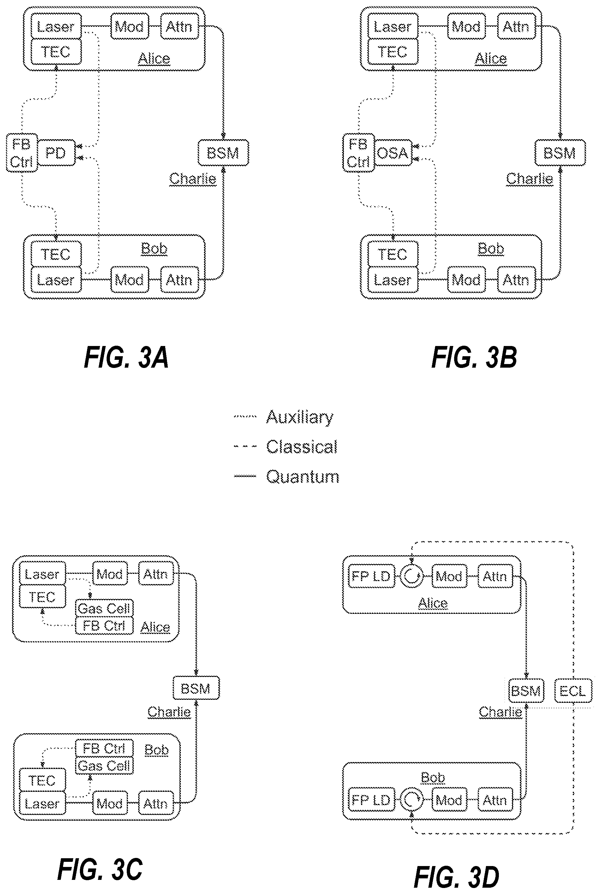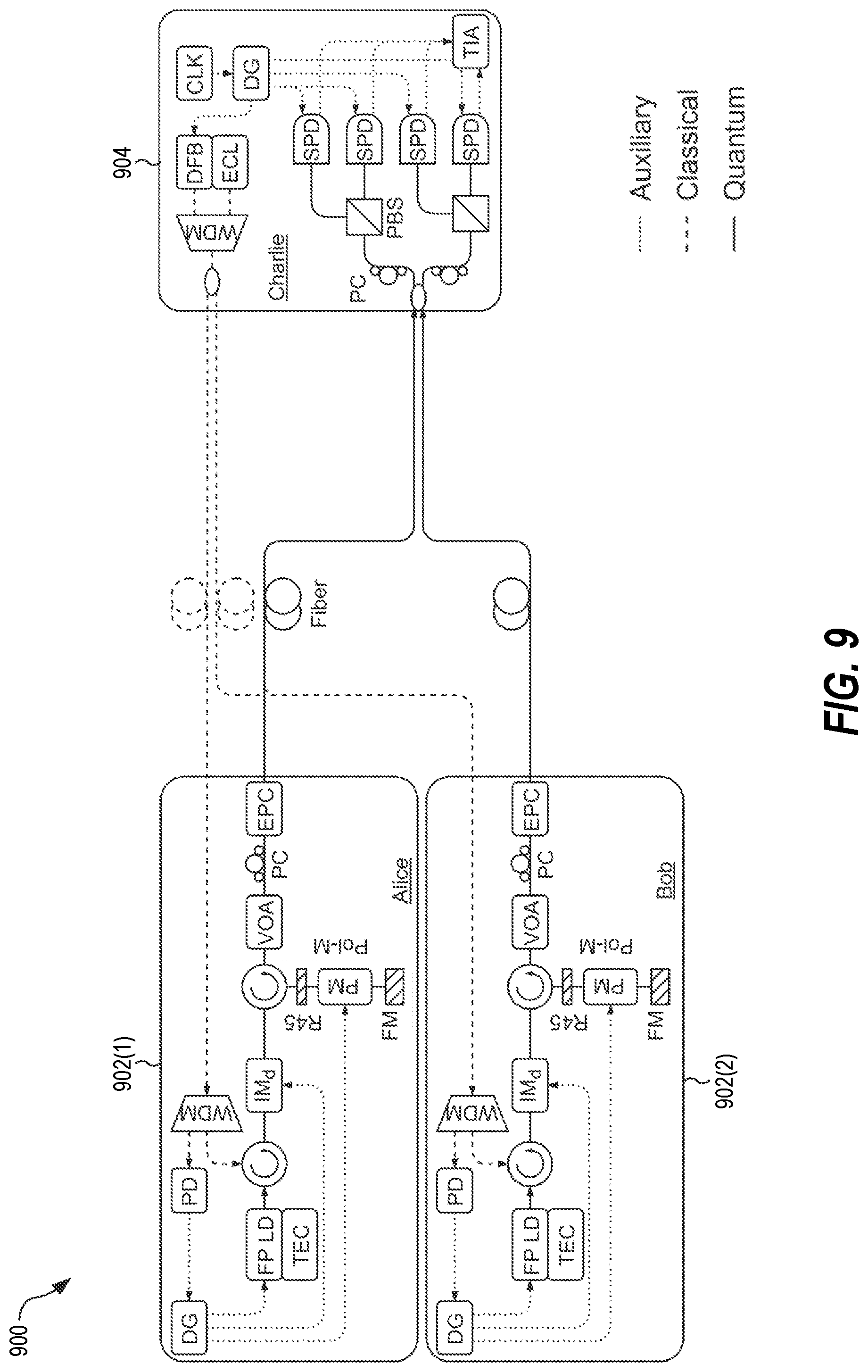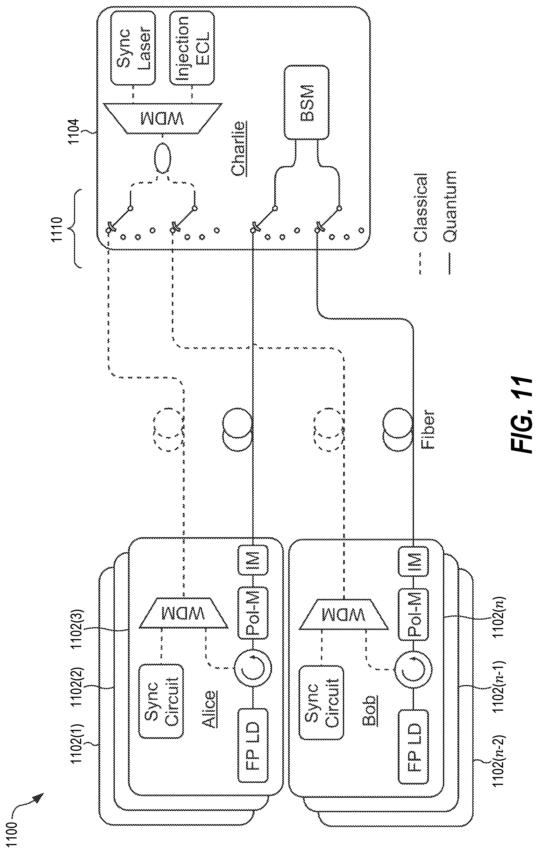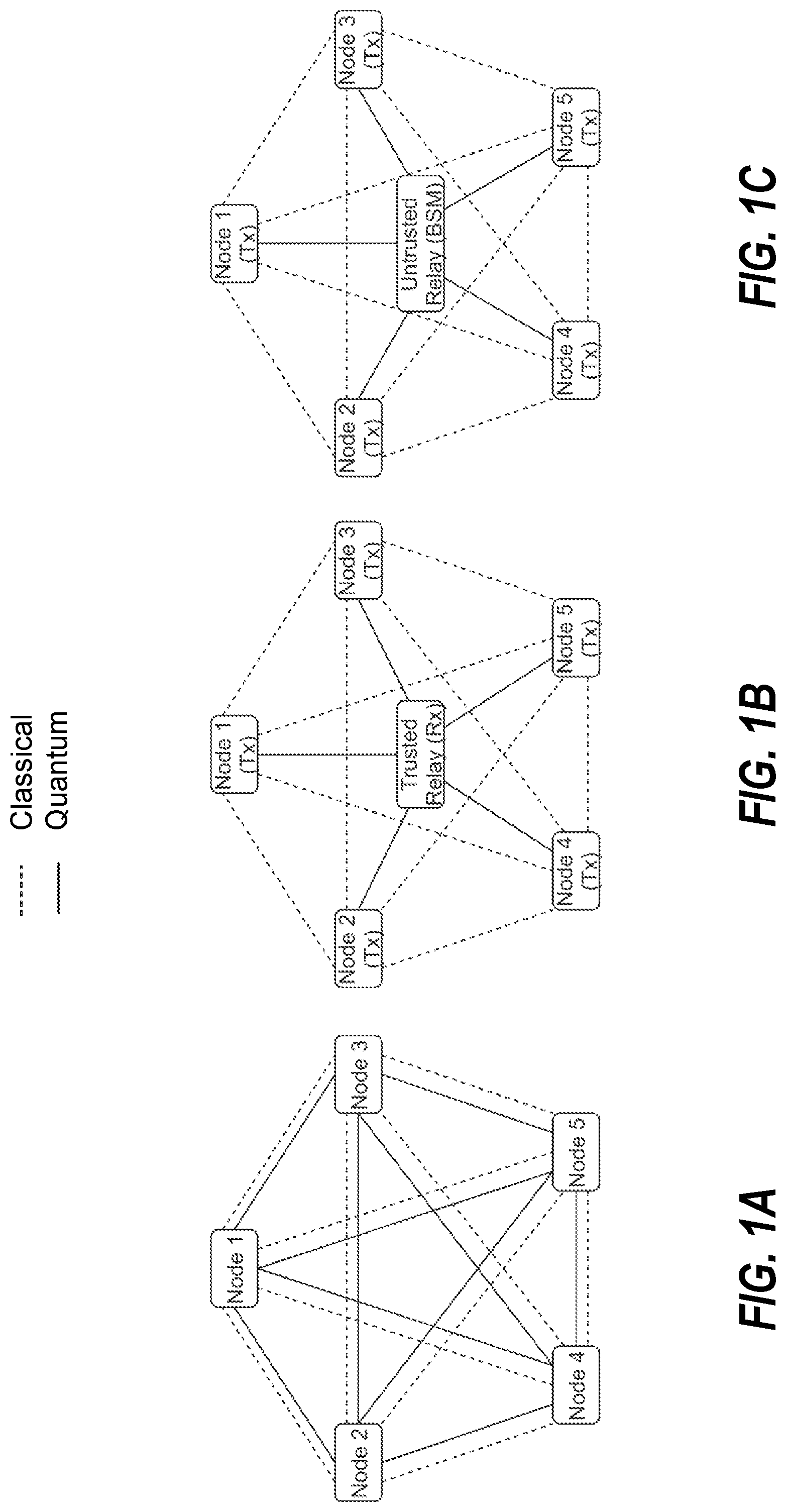 This application claims priority to U.S. Provisional Patent Application No. 63/036,015, titled “Scalable Polarization-Encoding Measurement-Device-Independent Quantum Key Distribution Network” and filed Jun. 8, 2020, and to U.S. Provisional Patent Application No. 63/055,493, titled “Scalable Time-Bin Phase Encoding Measurement-Device-Independent Quantum Key Distribution Network” and filed Jul. 23, 2020. Each of these applications is incorporated herein by reference in its entirety. In modern communications, access networks, both optical and wireless, are the most vulnerable segments of data security. Most eavesdropping takes place in access networks due to tree or star topologies where downstream data is broadcast to all users. An unintended user can easily probe a neighbors' downstream traffic without being noticed, get their MAC addresses and logic link identifications, and infer traffic type and amount. For example, in a passive optical network, the downstream multiple-point-control protocol message is broadcast to all users and reveals the upstream traffic characteristics of each user. Even worse, an eavesdropper can access the upstream data traffic of its neighbors via a reflection in the network. The situation in wireless access networks is worse since the air interface is open to the public. Cryptography is widely used in modern communication to protect three aspects of data security: confidentiality, integrity, and authentication. Confidentiality prevents the content of a message from being accessed by unintended recipients. Integrity protects a message from being modified during transmission. Authentication prevents spoofing attacks by verifying the identities of communication parties. All three aspects are protected by the data encryption. Modern cryptographic systems can be divided into two categories: symmetric and asymmetric. Asymmetric cryptography, also known as public cryptography, uses public and private keys for encryption, signature, and authentication. Symmetric cryptography, however, uses an identical key for the sender and receiver. Since symmetric cryptography has superior performance and is more robust against a quantum-computer attack, it has been widely used in modern communications. The most prevailing symmetric encryption method is the Advanced Encryption Standard. Since the security of a symmetric cryptographic system relies on the secrecy of its keys, key distribution becomes an important job, one which cannot be handled by symmetric cryptography itself. In today's communications, there is no absolutely secure way to deliver keys. Usually, it is handled by asymmetric cryptography in which the security of keys is protected by the computational complexity of intractable mathematical problems. There are several intractable math problems exploited by asymmetric cryptography, such as integer factorization for the RSA algorithm, the discrete logarithm for Diffie-Hellman key exchange, and the elliptic-curve discrete logarithm for elliptic-curve cryptography. Although intractable on classical computers, these problems can be solved in polynomial time on a quantum computer by Shor's algorithm. Accordingly, asymmetric cryptographic systems may be compromised by quantum computers and will therefore no longer be secure. Increasing the key length does not help since the required number of qubits scales linearly with key length. To address this challenge, quantum key distribution (QKD) is a promising technique for key distribution. Different from asymmetric cryptography, where keys are protected by complex math problems, QKD guarantees the security of keys by quantum mechanics and offers information-theoretic security, i.e., the keys cannot be broken even if an adversary has unlimited computing power. However, the absolute security offered by QKD is only guaranteed for ideal single-photon sources and detectors, which do not yet exist in practice. Such gaps between ideal and realistic devices create security loopholes which can be exploited via side-channel attacks. In a realistic QKD system, expensive and impractical single-photon sources are replaced by weak coherent pulses (WCP) whose imperfections may become the targets of side-channel attacks. For example, the photon number of a WCP follows a Poisson distribution. There always exist pulses containing more than one photon, which could be exploited by what is known as a photon-number-split attack. For example, if Alice blocks all single-photon pulses and divides all multi-photon pulses, keeping a half for herself and sending the other half to Bob, she will always have an identical copy of keys with Bob. To eliminate this loophole, decoy-state protocols were invented to vary photon number per pulse, so Alice's strategy of different blocking rates of single- and multi-photon pulses will be revealed. Another example is that an ideal single-photon source has random phase for each pulse, but the phase of WCPs is not truly random, which could become the target of an unambiguous-state-discrimination attack. This loophole is eliminated by using directly modulated lasers or phase modulators to actively randomize their phase. Additional security loopholes originate from imperfect detectors. For example, the time-shift attack exploits the efficiency mismatch between detectors, where Alice steals key information by shifting the qubit arrival time at Bob. The detector blinding attack exploits the after-gate pulses and dead time of avalanche detection of single-photon detectors. Measurement-device-independent QKD (MDI-QKD) protocols were developed to remove all loopholes at the detection side. In conventional prepare-and-measure QKD protocols, Alice prepares and sends quantum states to Bob, who measures the received states. In MDI-QKD, both Alice and Bob independently prepare random quantum states that they send to Charlie, a third party, for Bell-state measurement (BSM). Charlie publicly announces whether or not a BSM was suc