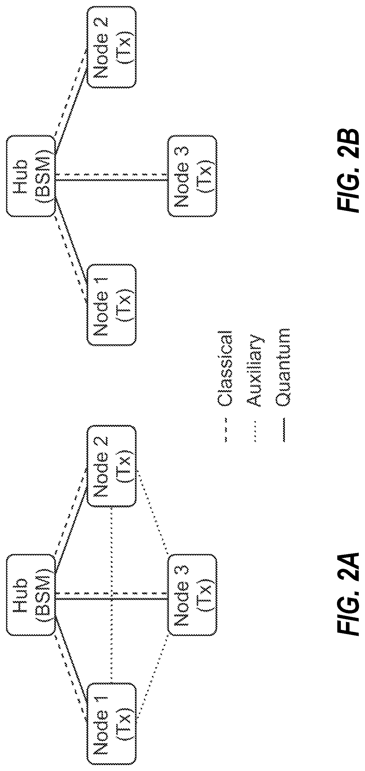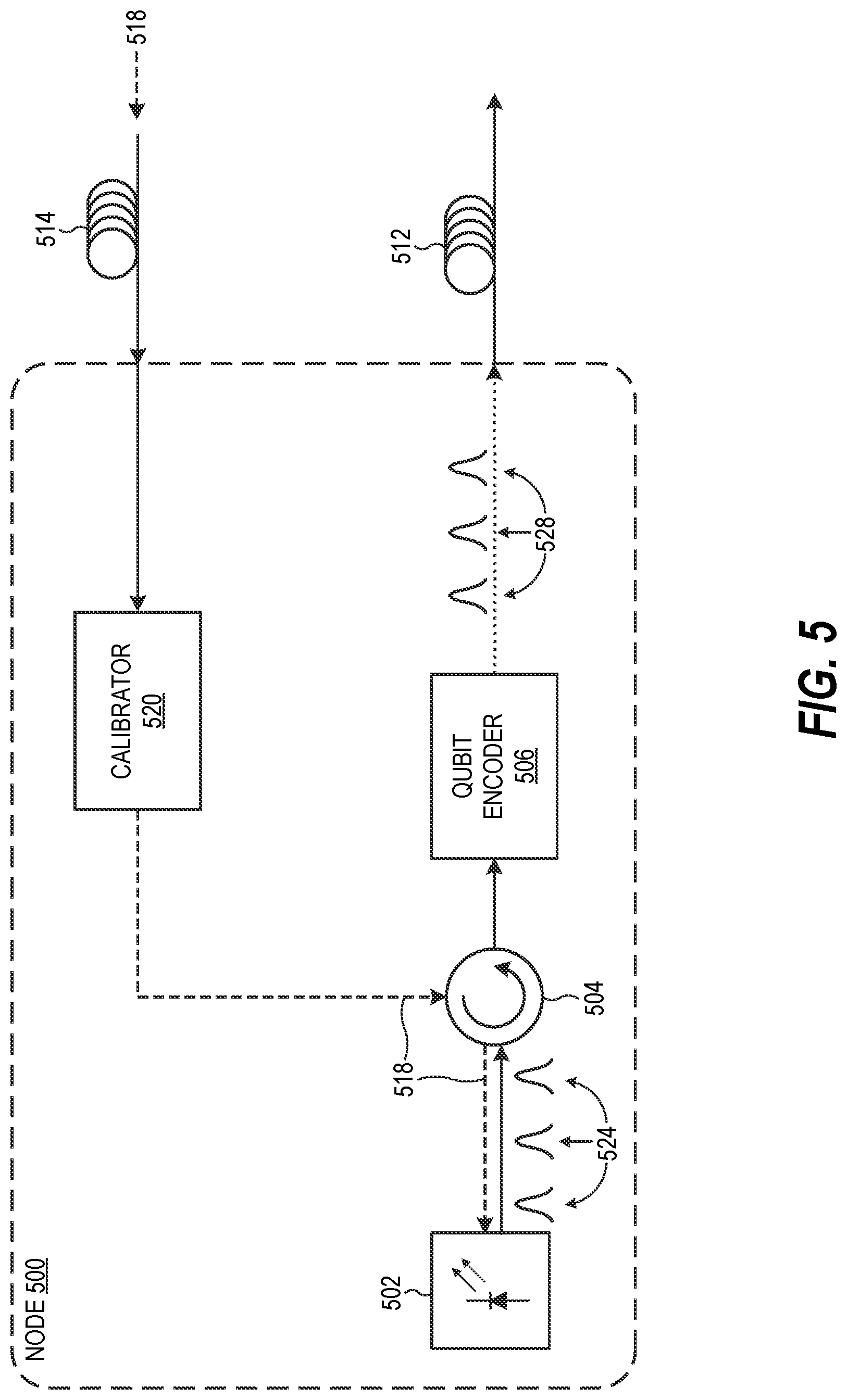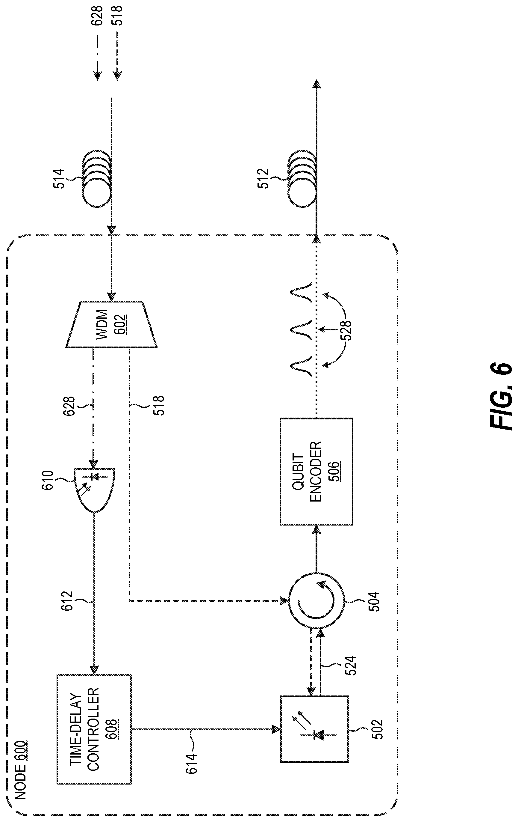 an optical circulator having a first port, a second port, and a third port, the optical circulator being configured to (i) emit, from the second port, light coupled into the first port and (ii) emit, from the third port, light coupled into the first port; a qubit encoder configured to encode a logical qubit in each of a sequence of optical pulses emitted from the second port of the optical circulator to create a sequence of photonic qubits; and a calibrator configured to couple a wavelength-calibration signal from a hub of the quantum key distribution network into the third port of the optical circulator such that the wavelength-calibration signal is emitted from the first port of the optical circulator. 23. The node of 24. The node of 25. The node of a wavelength-division multiplexer configured to separate an optical clock signal from the wavelength-calibration signal; and a photodetector configured to convert the optical clock signal into the electronic timing signal. 26. The node of 27. The node of