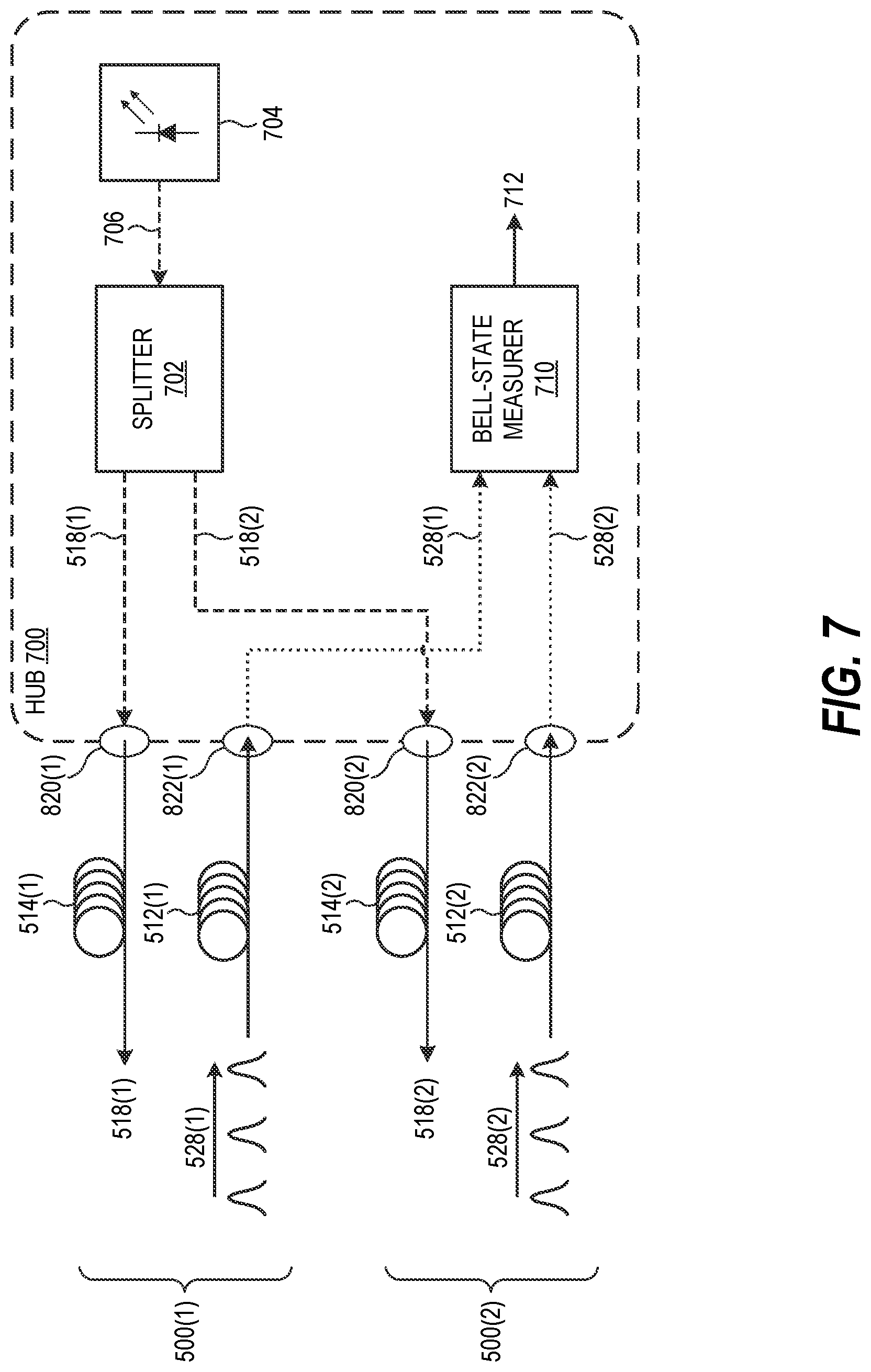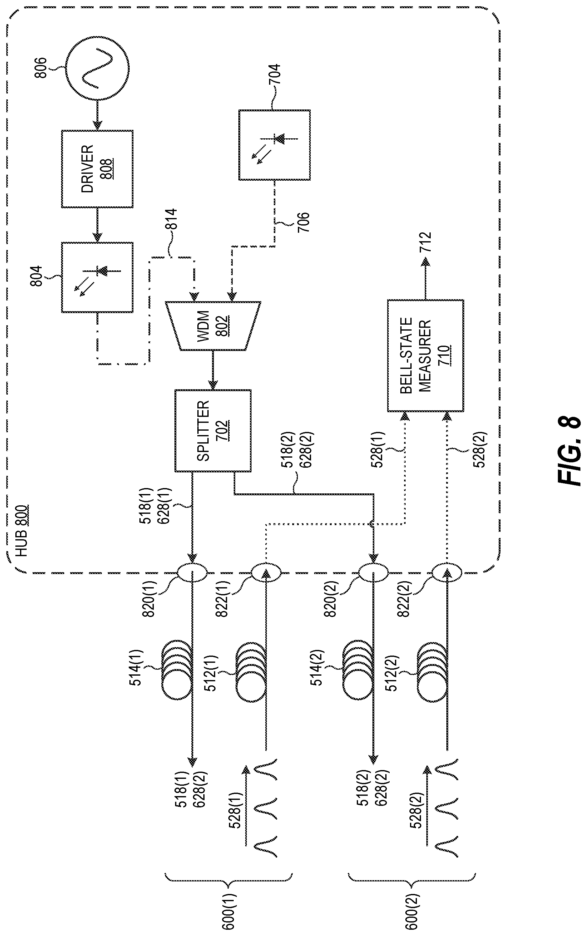a wavelength-calibration laser; an optical splitter configured to split an output of the wavelength-calibration laser into first and second wavelength-calibration signals; a first optical output configured to transmit the first wavelength-calibration signal to a first node of the quantum key distribution network; a second optical output configured to transmit the second wavelength-calibration signal to a second node of the quantum key distribution network; and a Bell-state measurer configured to perform a Bell-state measurement with first and second photonic qubits received from the first and second nodes, respectively. 12. The hub of 13. The hub of 14. The hub of 15. The hub of 16. The hub of a synchronization laser configured to emit a sequence of time-synchronization pulses synchronously with a reference clock; and a wavelength-division multiplexer configured to combine the sequence of time-synchronization pulses and the output of the wavelength-calibration laser; wherein an output of the wavelength-division multiplexer is coupled to an input of the optical splitter. 17. The hub of 18. The hub of 19. The hub of at least two single-photon detectors; a time-interval analyzer configured to process an output from each of the at least two single-photon detectors; and a photon-detector trigger circuit configured to trigger each of the at least two single-photon detectors synchronously with the reference clock. 20. The hub of 21. The hub of 22. A node for a measurement-device-independent quantum key distribution network, comprising: