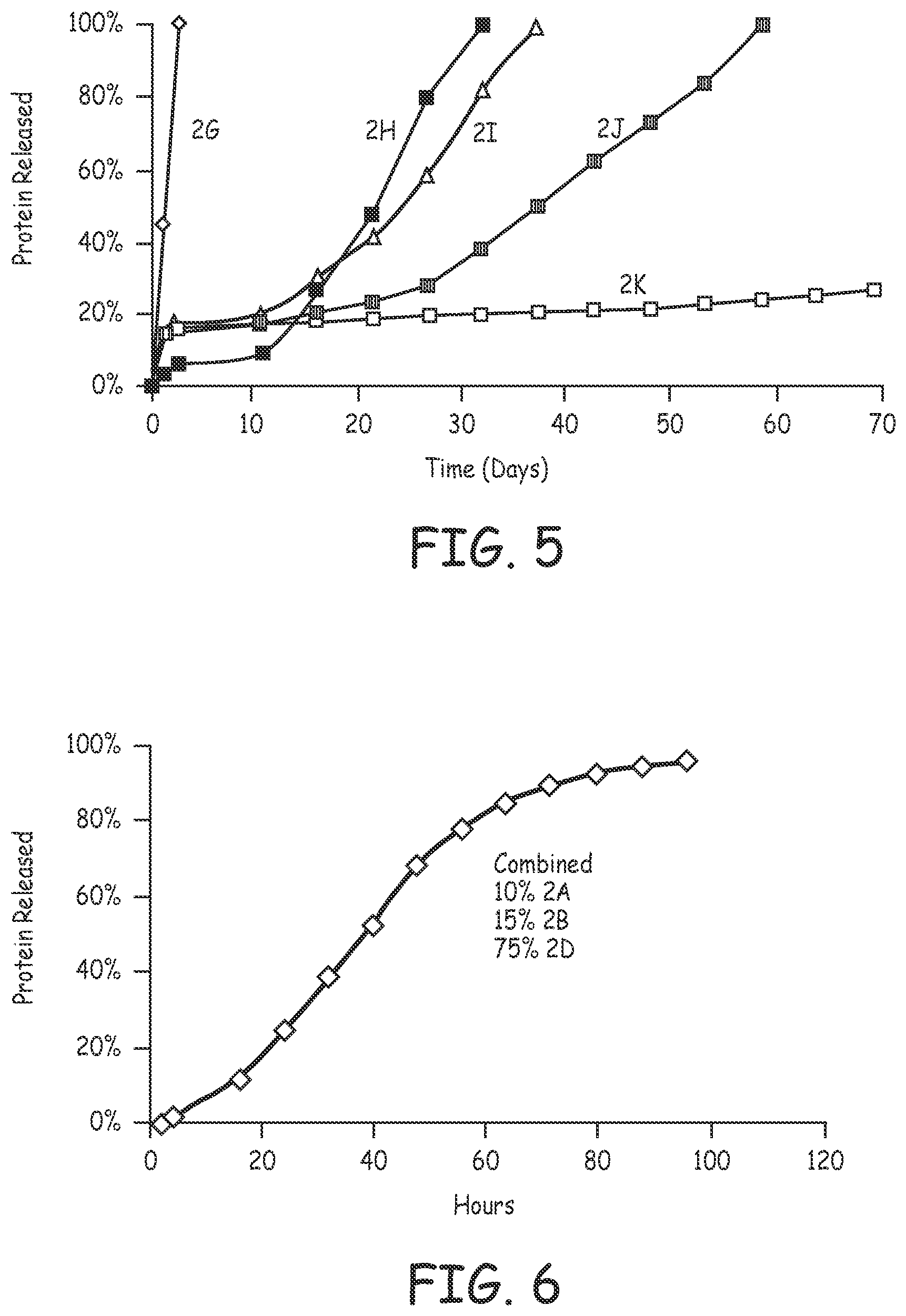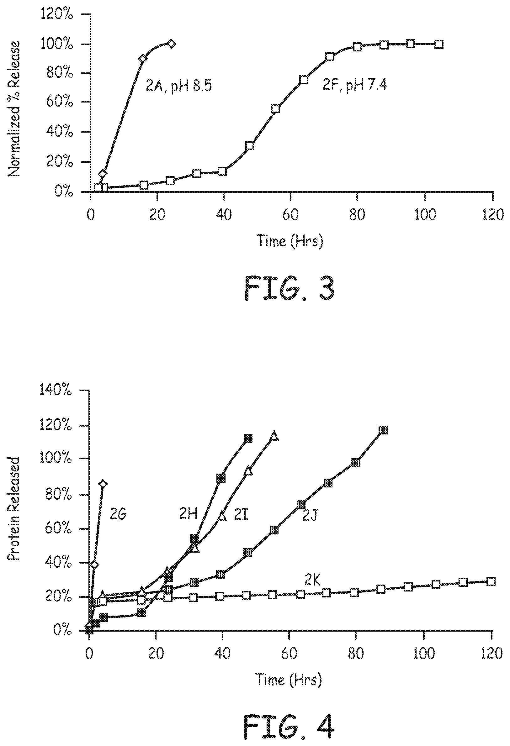 HPLC Protein Stability Study (50 mL Tris Buffer, pH 8.5, shaking at 50 rpm) Elapsed Time Ovalbumin IgG (hr) recovered recovered 0.00 100.0% 100.0% 2.00 98.3% 97.1% 6.00 97.2% 99.5% 24.00 95.5% 97.7% 48.00 95.0% 98.3% 96.00 94.1% 93.3% ELISA Protein Stability Study (50 mL Tris Buffer, pH 8.5, shaking at 50 rpm, 37 C.) Elapsed Time Ovalbumin IgG (hr) recovered recovered 5 min 97.7% 109.5% 2 hour 99.5% 87.1% 6 hour 98.4% 85.5% 24 hour 91.3% 76.0% 48 hour 99.9% 78.8% 96 hour 70.1% 83.8% Accelerated and Real-Time In Vitro Protein Release Study Xerogel protein Buffer from in sample Buffer Temperature Example Example Protein (mg) pH (° C.) 2A 1A-3 ovalbumin 24.46 8.5 37 2B 1B-3 ovalbumin 23.77 8.5 37 2C 1C-3 ovalbumin 23.37 8.5 37 2D 1D-3 ovalbumin 22.82 8.5 37 2E 1E-3 ovalbumin 20.22 8.5 37 2F 1A-3 ovalbumin 25.12 7.4 37 2G 1A-4 IgG 5.11 8.5 37 2H 1B-4 IgG 8.84 8.5 37 2I 1C-4 IgG 9.95 8.5 37 2J 1D-4 IgG 10.8 8.5 37 2K 1E-4 IgG 10.66 8.5 37 Example 3: Formation of a Crosslinked Gel from a Melt of Precursors