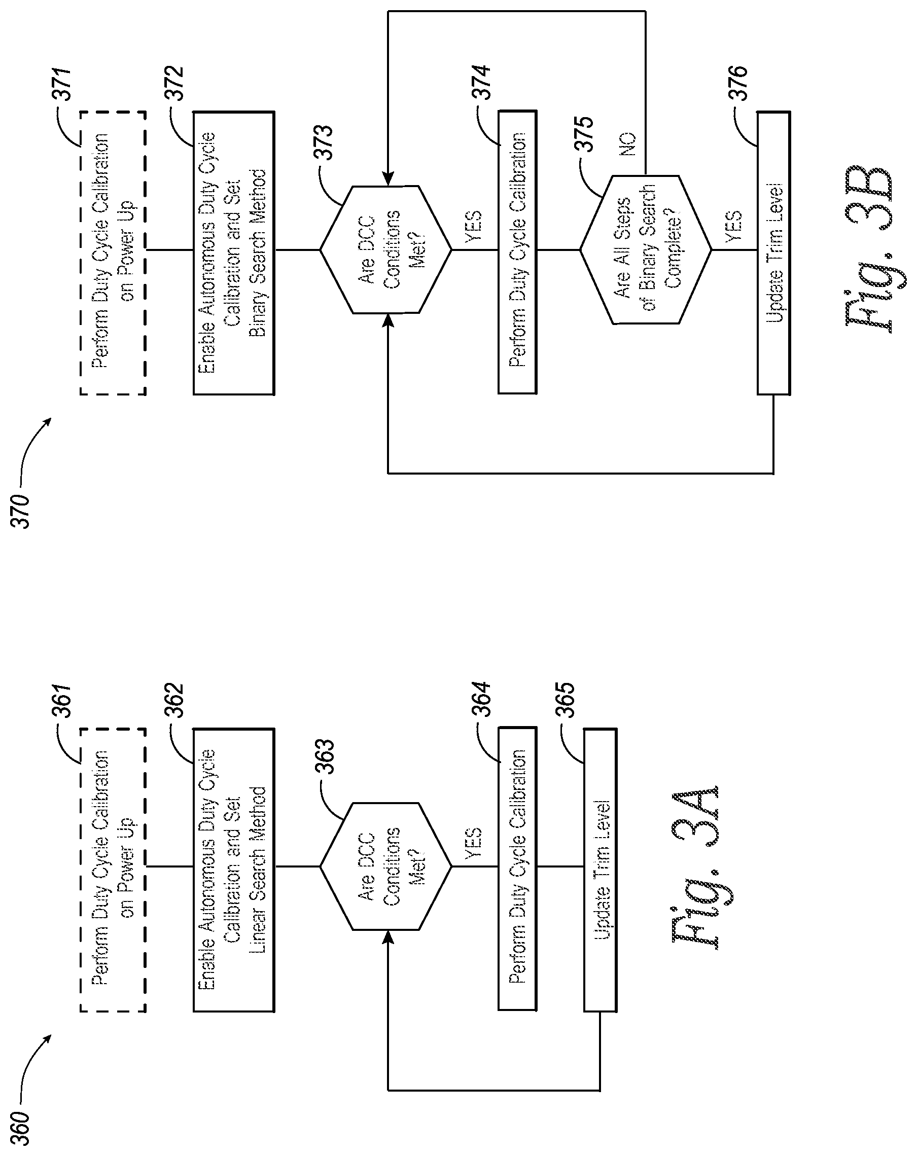 Alternatively, the routines 360 and/or 370 can begin at blocks 362 and 372, respectively. At blocks 362 and 372, the routines 360 and 370, respectively, can enable autonomous DCC. In some embodiments, the routines 360 and 370 can automatically enable autonomous DCC (e.g., upon powering on the electrical circuit device and/or as part of a boot sequence of the electrical circuit device). In other embodiments, the routines 360 and/or 370 can enable autonomous DCC at the direction of an electrical circuit device controller (e.g., controller 106 of electrical circuit device 100), at the direction of an electrical circuit die controller (e.g., a controller located on electrical circuit dies 130 and/or 230), and/or at the direction of a host device (e.g., the host device 108). For example, the routines 360 and/or 370 can enable autonomous DCC at the direction of a command (e.g., a vendor specific (VS) command) received from the electrical circuit device controller, the electrical circuit die controller, and/or the host device. In these and other embodiments, the routines 360 and/or 370 can enable autonomous DCC through a set feature option and/or an MLBi option. In these and other embodiments, the routines 360 and/or 370 can disable short input/output pause operations while autonomous duty cycle calibration is enabled. At block 362 (FIG. 3A), the routine 360 sets linear (e.g., sequential) search as the search method of the autonomous DCC (e.g., in response to the command, the VS command, the set feature option selection, and/or the MLBi option selection). At block 372 (FIG. 3B), in contrast, the routine 370 sets binary search as the search method of the autonomous DCC (e.g., in response to the command, the VS command, the set feature option selection, and/or the MLBi option selection).