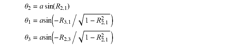 For blade inverse kinematics, Θ(t) needs to be found given RBladeNavand RBodyNav. These matrices are independently estimated by the observer module. To do this, it is noted that the dozer blade mechanism can be modeled by the rotation matrix constructed as a Tait-Bryan angle sequence Y1-Z2-X3: