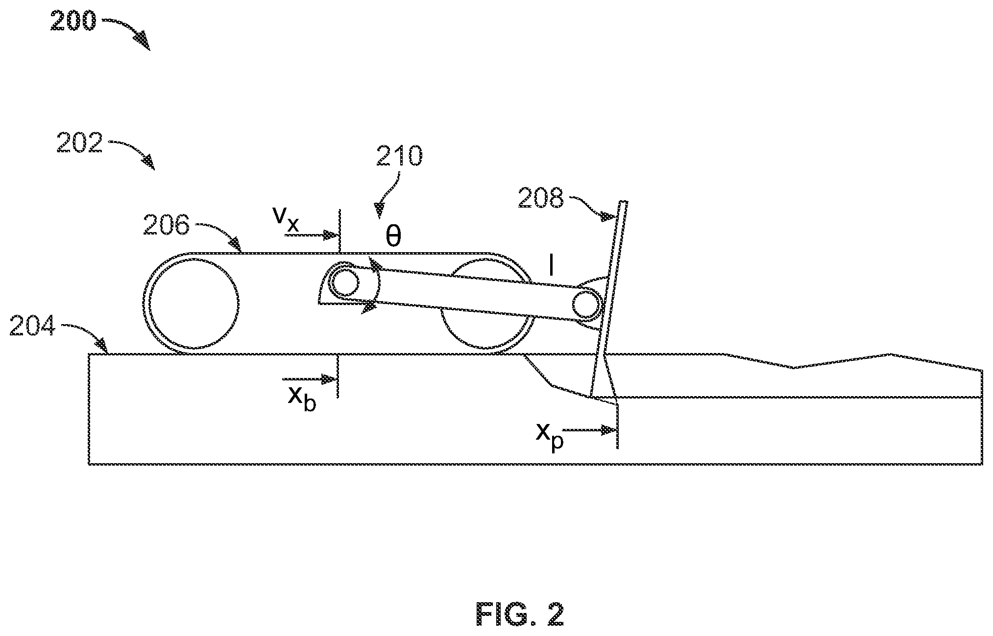 • (1) θ1(t) is the angle (i.e., the pitch) of the boom with respect to an initial reference (typically the angle it makes with the flat surface on which the body is located when the blade edge is resting on the surface). This pitching happens around the {right arrow over (y)} direction of the body frame.