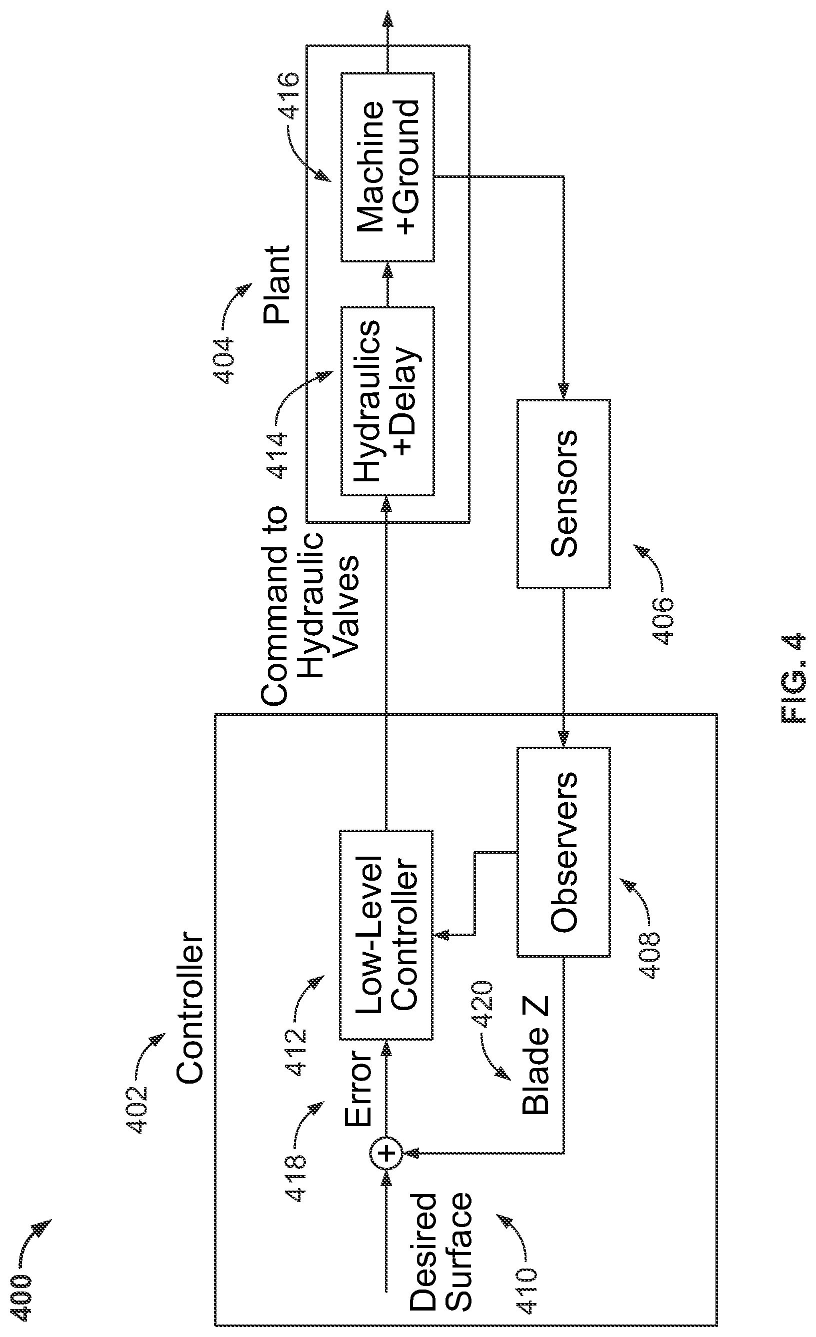 It is to be noted that due to the actual mechanism of the implement, θ2(t), θ3(t) and θ4(t) are not independent of each other. θ3(t) will change if θ2(t) changes, and the same is true for θ4(t). Change in θ3(t) can be compensated by tilting the blade, however θ4(t) is a characteristic of the vehicle and cannot be manipulated with actuators.