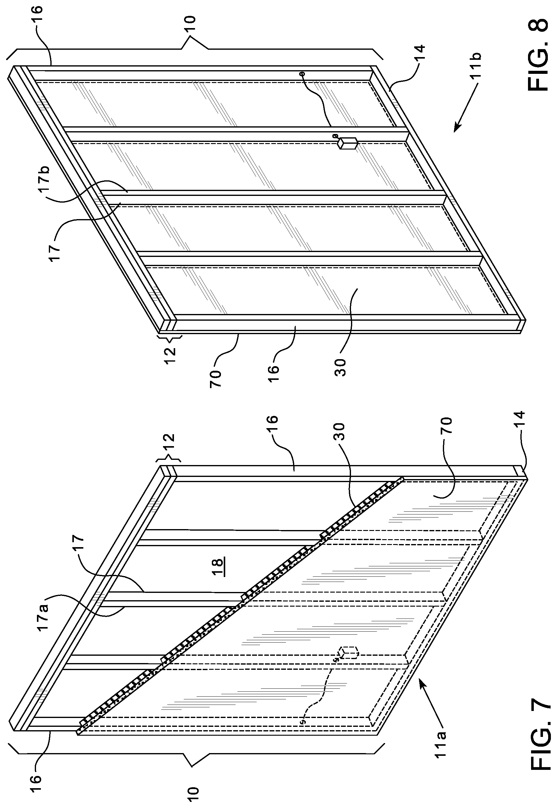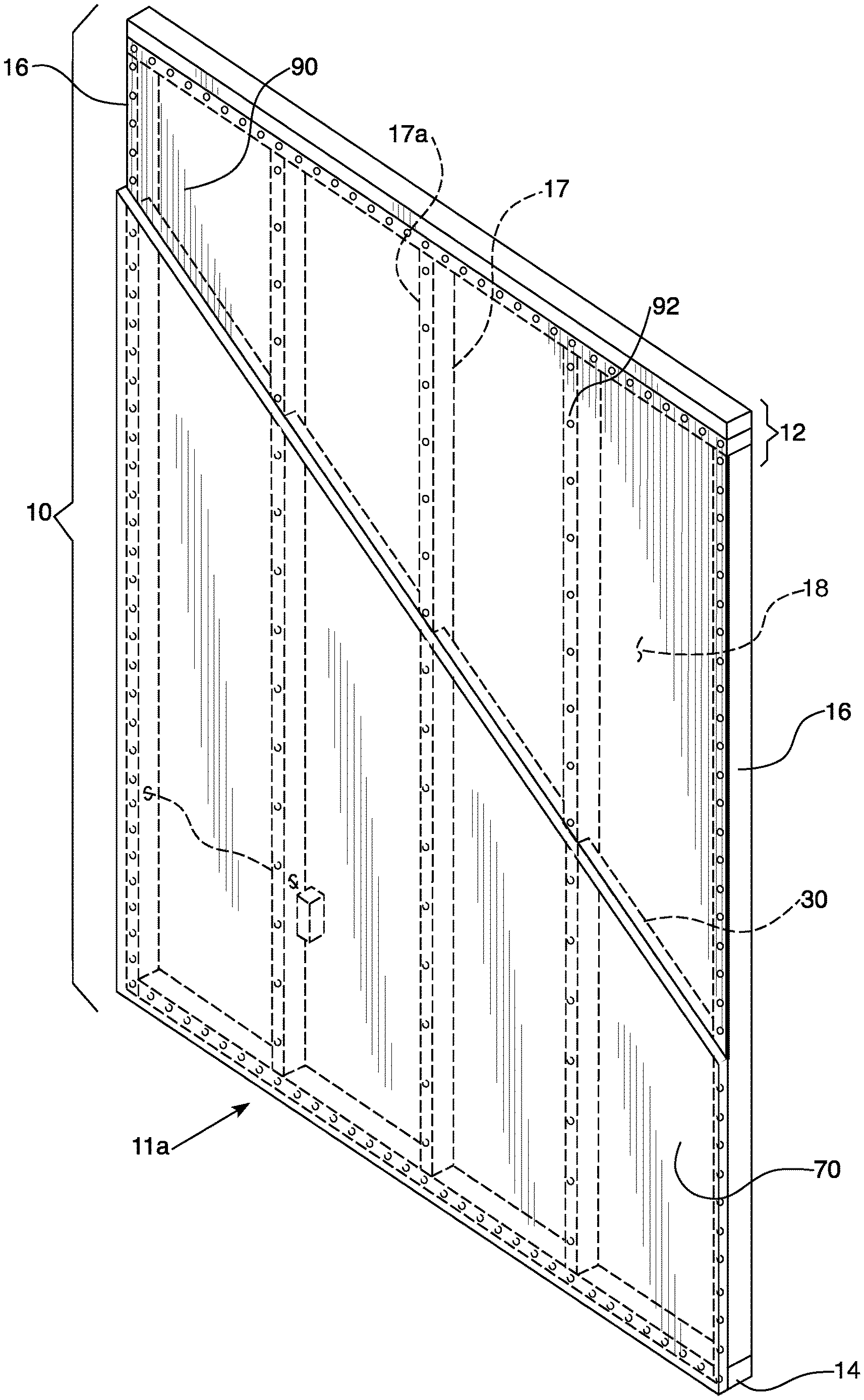 (a) a frame comprising: (i) a first member; (ii) a second member spaced apart from the first member; and (iii) connecting members extending between the first member and the second member, wherein the first member, the second member, and the connecting members each comprise a front surface and a rear surface that form a front frame surface and a rear frame surface; (b) a foam panel overlying the front frame surface, wherein at least one of: (i) the foam panel abuts the front frame surface such that the foam panel, the first member, the second member, and the connecting members define a cavity, or (ii) a non-foam sheathing abuts the front frame surface between the front frame surface and the foam panel, such that the non-foam sheathing, the first member, the second member, and the connecting members define the cavity; and (c) a polyurethane foam layer disposed within the cavity, wherein the polyurethane foam layer:
