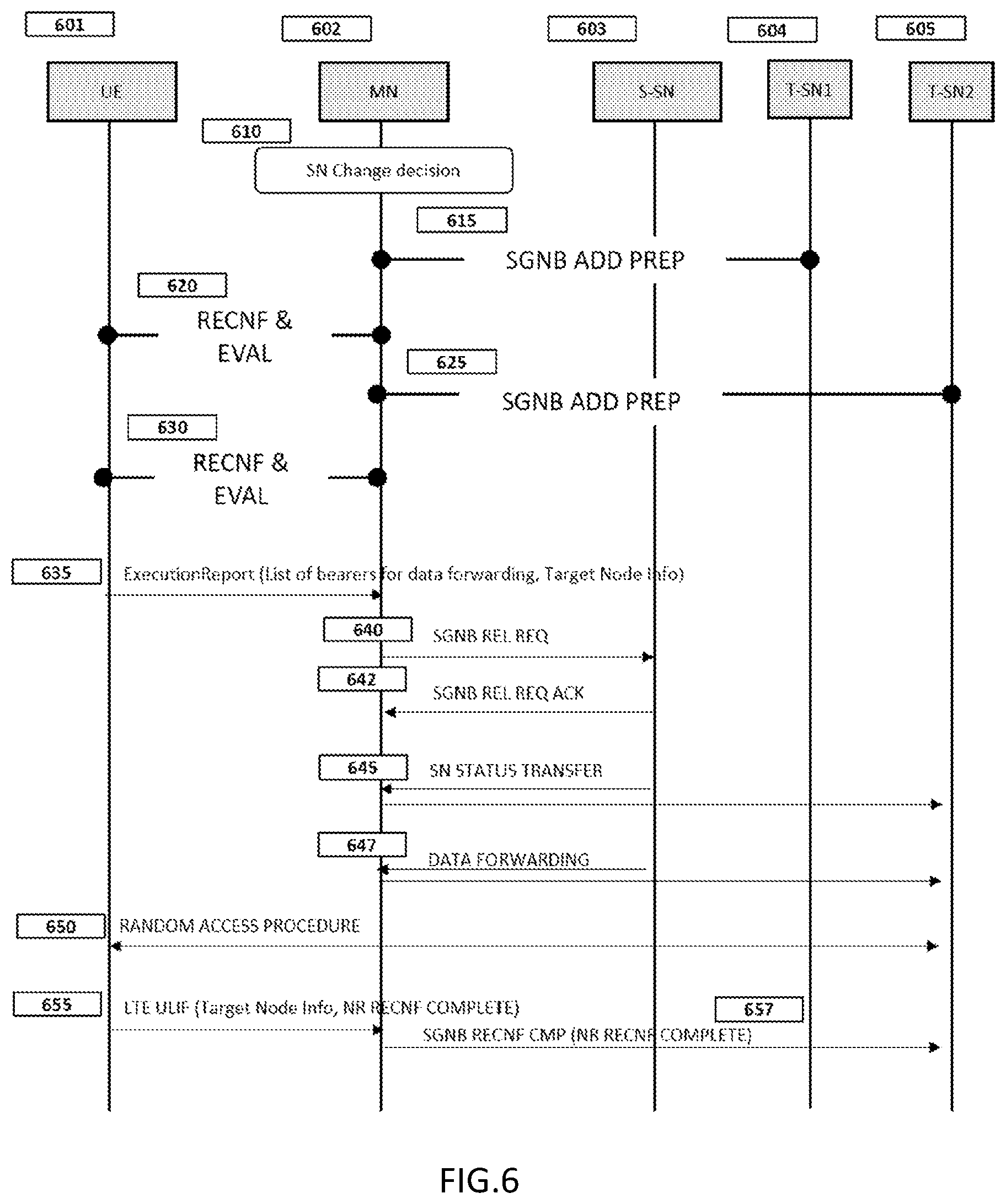 In 941, first base station receives from UE ULIT which includes first Transaction id and first NR RECNF CMP. first NR RECNF CMP includes at least third Transaction id. MN(first base station) transmits, if second target node information is included in ULIT, SGNB RECNF CMP to the base station indicated in second target node information. If ULIT does not include second target node information, MN (first base station) transmits SGNB RECNF CMP to the base station indicated in the target node information included in ExecutionReport. SGNB RECNF CMP includes first NR RECNF CMP. 941 and 936 are independent procedures and time domain order of them can change. For example, 641 can start before 936 or during 936.