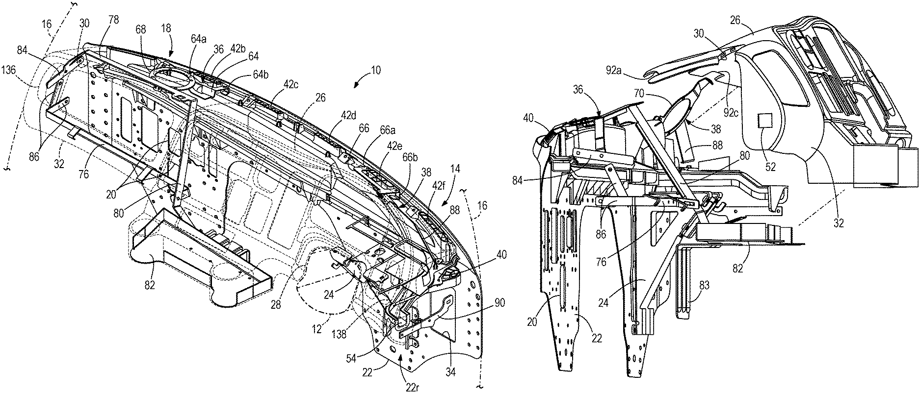 U.S. Pat. No. 6,260,914 discloses a dash reinforcement for a mobile vehicle with a passenger cab such as a sport utility vehicle, or medium or heavy-duty truck. The dash reinforcement may be a stamped sheet metal panel that strengthens the dash structure of the cab and provides for mounting of vehicle components. The dash reinforcement may be symmetrical about the centerline of the vehicle and this symmetry allows the panel to accommodate both left-hand drive and right-hand drive vehicle configurations. The dash reinforcement also includes ‘Y’ shaped passages for a driver control module and for accessory equipment such as heating, ventilation, and air conditioning (HVAC) modules. The unique shape of these passages or openings adds strength to the overall dash structure and hence the cab. The dash reinforcement may be engaged to a dash panel to form a dash assembly. The dash panels made be manufactured by the same metal stamping dies moved to account for left-hand versus right-hand drive and conventional versus cab-over-engine or low front engine configuration.