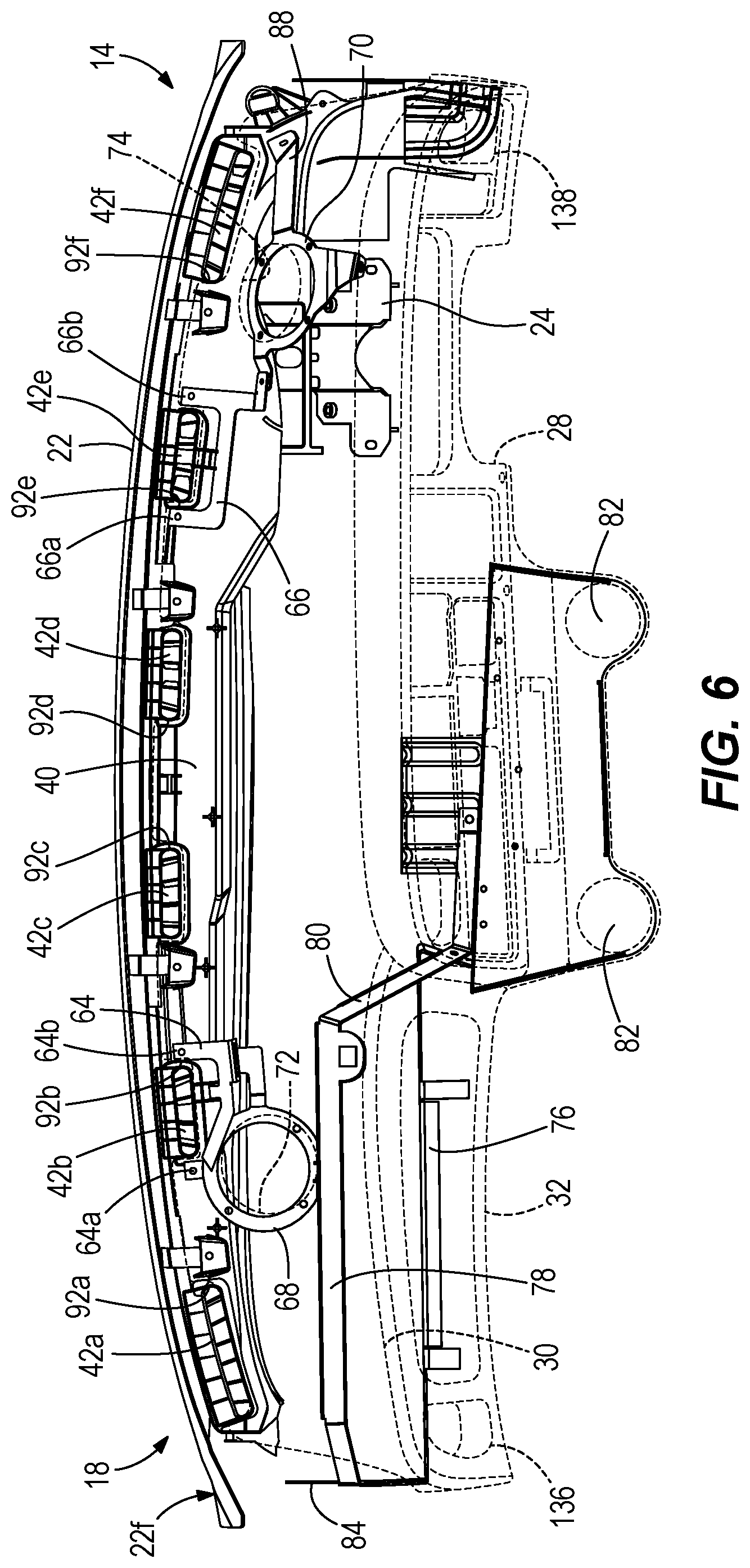 As shown in FIG. 6, the aftermarket dash panel 26 comprises a single piece configured to extend across an entire width of the truck cab 16, i.e., from one A-pillar to the other. The aftermarket dash panel 26 can be made of fiberglass or any other suitable material. A foremost portion of the aftermarket dash panel 26 includes cutouts 92a-f configured to receive the respective original defrost vents 42a-f of the original HVAC ductwork 40. This provides a clean aesthetic to the dash without the need for an extra cover in this area. However, a trim piece may be added over the area where the gauges and user input devices are located, as is common.