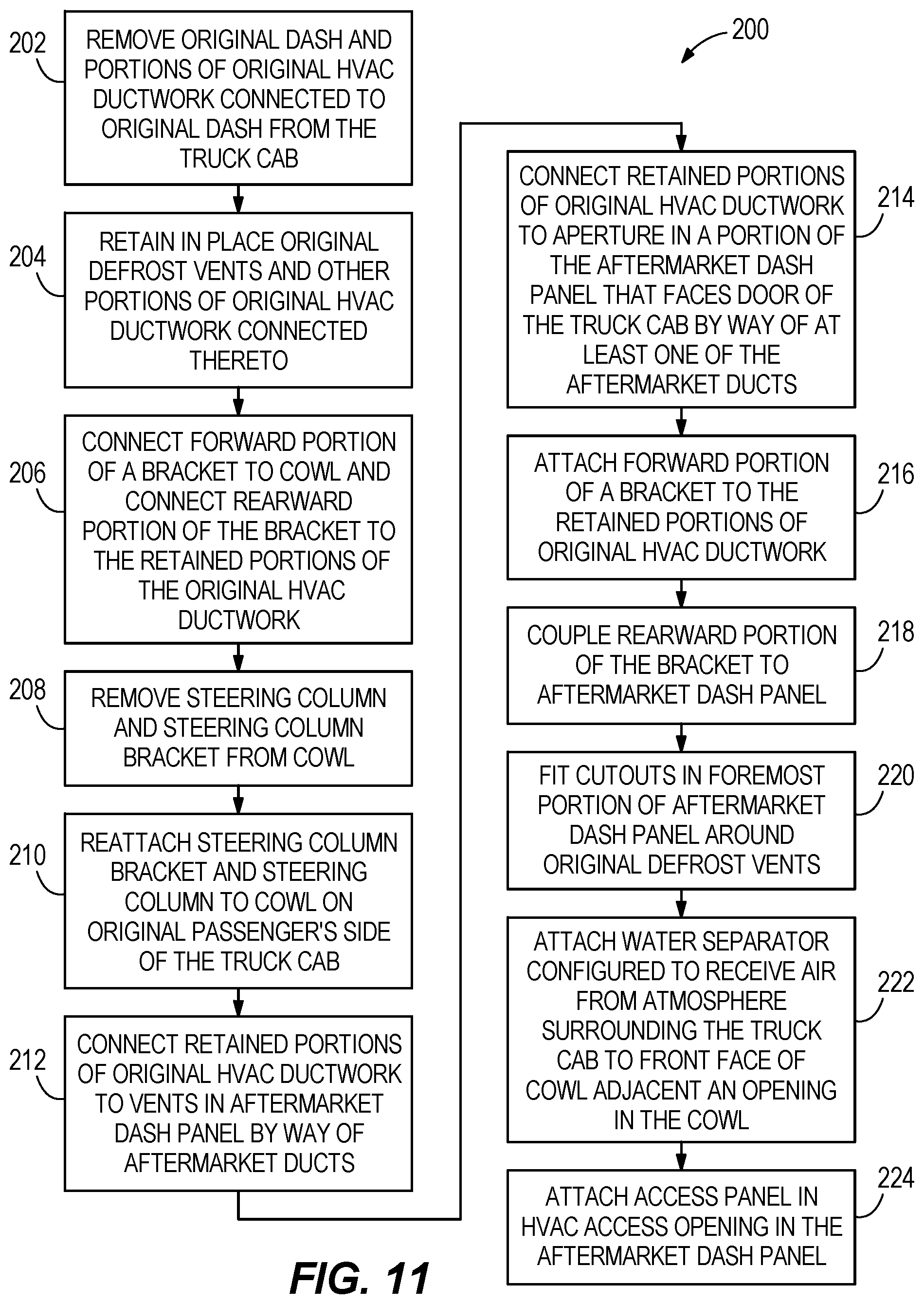 FIG. 11 will be used to describe a method 200 for moving a steering column 12 of a truck cab 16 from an original driver's side 18 of the truck cab to an original passenger's side 14 of the truck cab 16. As shown at 202, the method includes removing an original dash and portions of original HVAC ductwork connected to the original dash from the truck cab 16. The original dash can be removed by unfastening and/or prying off the original dash trim, support panel(s), and any components thereunder. As shown at 204, and as described with respect to FIGS. 2 and 3, the method includes retaining in place original defrost vents 42a-f and other portions of the original HVAC ductwork 40 connected thereto. Also as noted herein above, and as shown at 206, the connection between the retained portions of the original HVAC ductwork 40 and the cowl 22 can be reinforced by connecting a forward portion 46 of a bracket 44a (or each of brackets 44a-d) to the cowl 22 and connecting a rearward portion 48 of the bracket 44a (or each of brackets 44a-d) to the retained portions of the original HVAC ductwork 40.