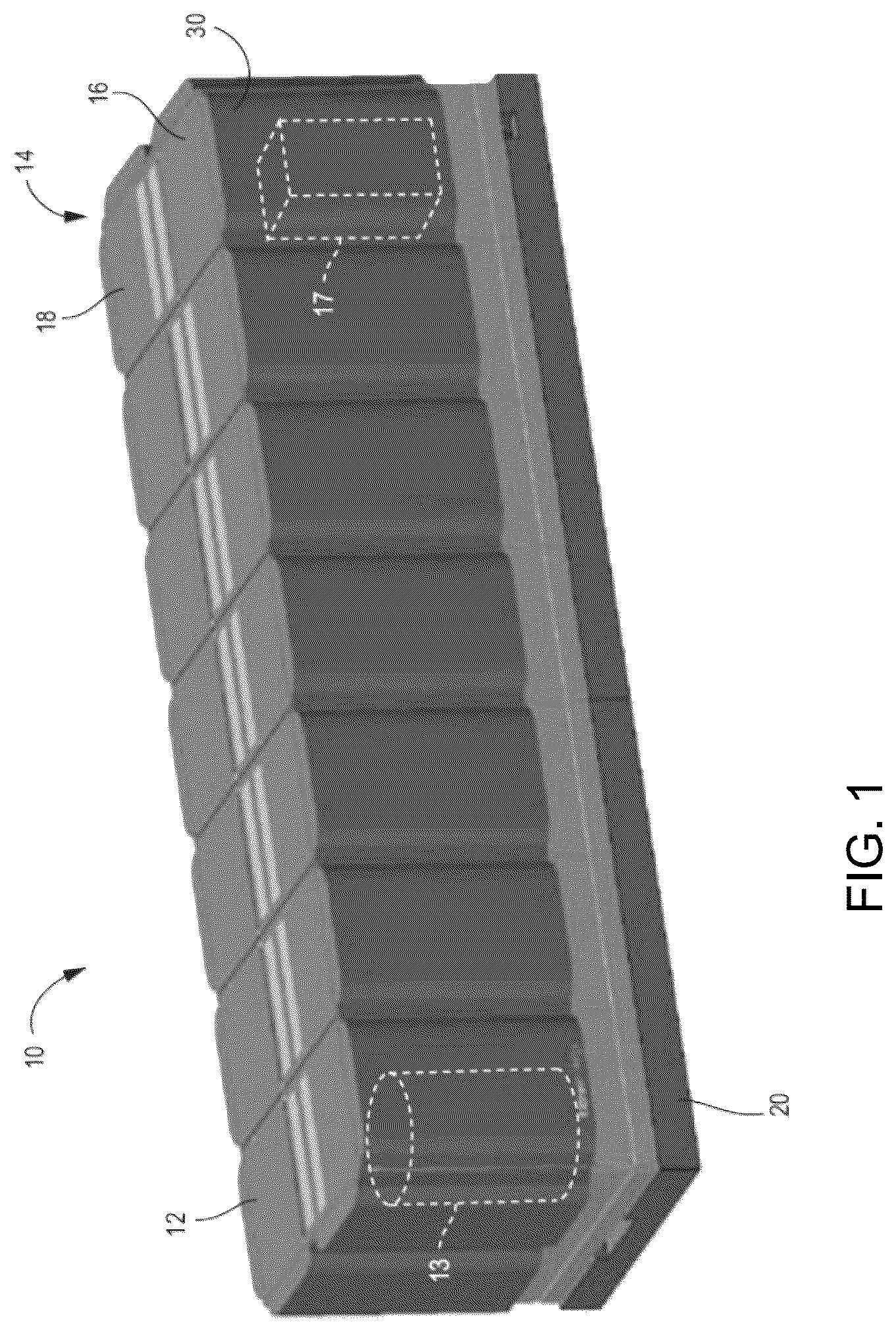 [0020]FIG. 1 illustrates an exemplary modular fuel cell system described in U.S. Pat. No. 8,440,362, incorporated herein by reference in their entirety. The modular system may contain modules and components described above as well as in U.S. patent application Ser. No. 11/656,006, filed on Jan. 22, 2007, and entitled “Modular Fuel Cell System” which is incorporated herein by reference in its entirety. The modular design of the fuel cell system enclosure 10 provides flexible system installation and operation.