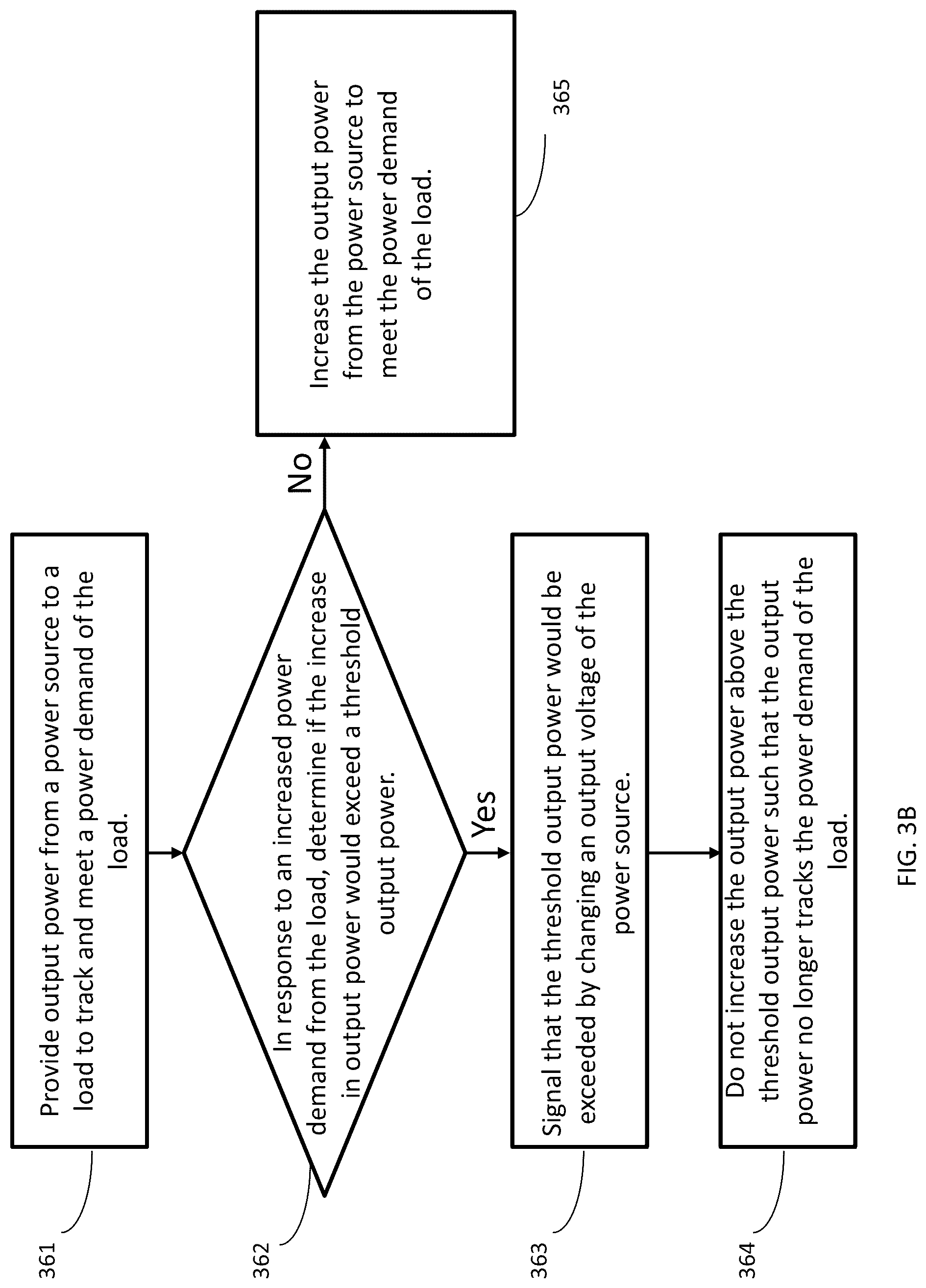 [0043]If it is determined that the requested increase in output power of the power source 320a (e.g., of the SOFC system 320) would exceed the threshold output power, then in step 363, the power source generates a signal that the threshold output power would be exceeded by changing an output voltage of the power source. For example, the SOFC system controller 320b changes the output voltage of the SOFC system 320 on the DC power bus 380 to signal to the UPS 340 controller 340d that the output power of the SOFC system 320 would exceed the threshold output power. For example, the signal can be a small decrease or increase in the output voltage of SOFC system 320 (a “droop”), rather than a direct communication between the SOFC system 320 controller 320b and UPS 340 controller 340d. For example, the droop can be a less than a 5% decrease or increase in output voltage, such as a 0.5 to 4.0%, including a 1 to 3%, decrease or increase in output voltage. Signaling using an output voltage can easily be detected by components downstream from SOFC system 320, such as the UPS 340 controller 340d, and has the advantage in that the signal can be detected and understood by a variety of different downstream components. In other words, no specific communication protocol or hardware need be used in order to implement the signal as the output voltage droop. As described in more detail below, this allows SOFC system 320 to communicate with components, such as the UPS 340, that have not been especially made or configured to directly communicate with SOFC system 320.